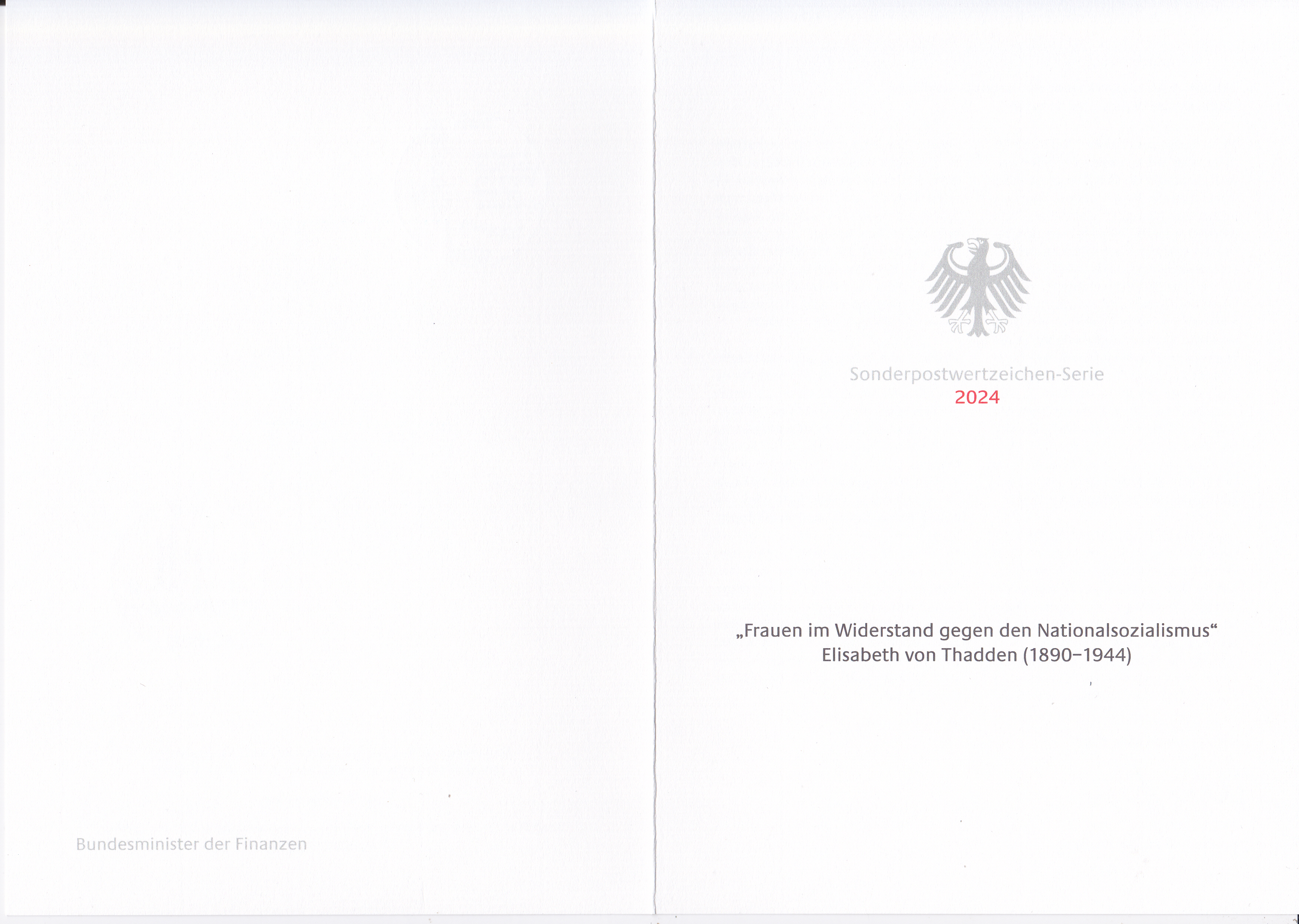 Ministerkarte des Bundesministers für Finanzen mit zwei Marken mit dem Motiv "Elisabeth von Thadden" (MiNr 3863) aus der Serie "Frauen im Widerstand gegen den Nationalsozialismus" und den beiden Ersttagsonderstempel Bonn und Berlin.