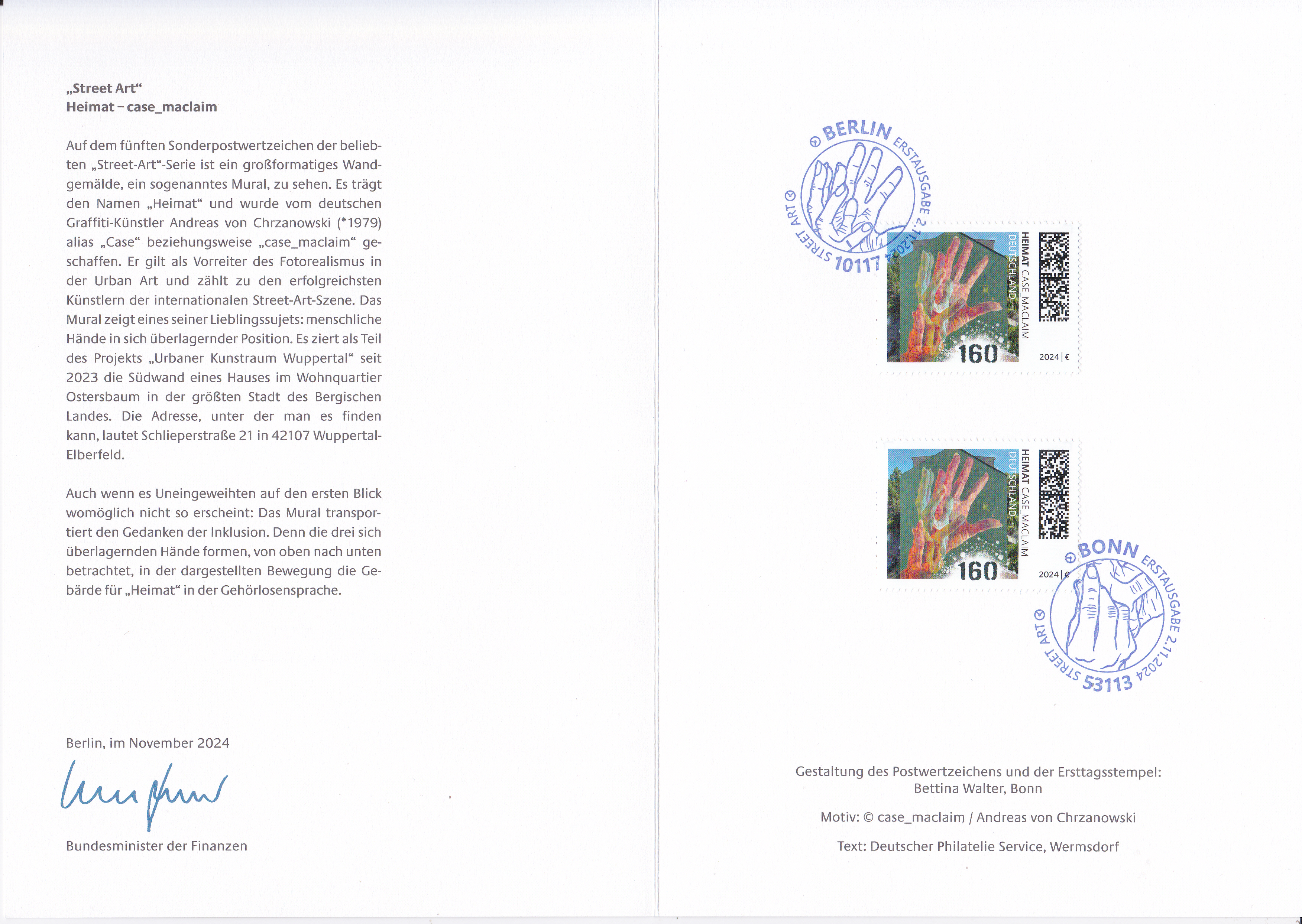 Ministerkarte des Bundesministers für Finanzen mit zwei Marken mit dem Motiv "Wandmalerei 'Heimat' von Andreas von Chrzanowsk" (MiNr 3864) aus der Serie "Street Art" und den beiden Ersttagsonderstempel Bonn und Berlin.