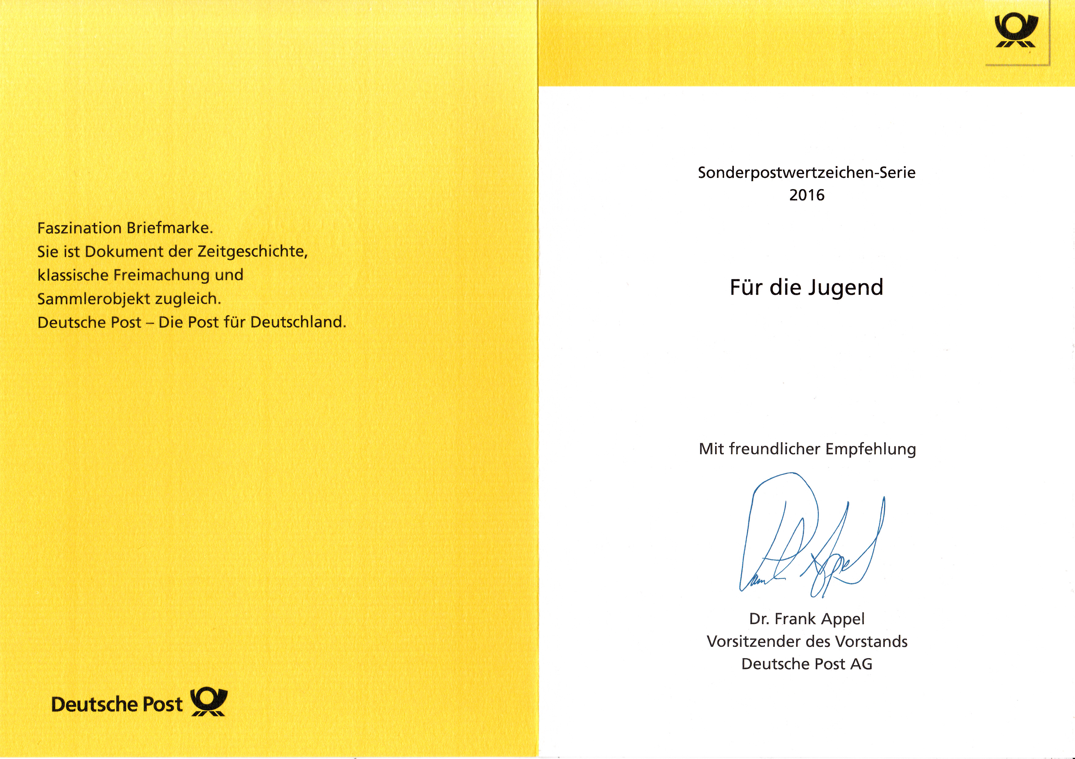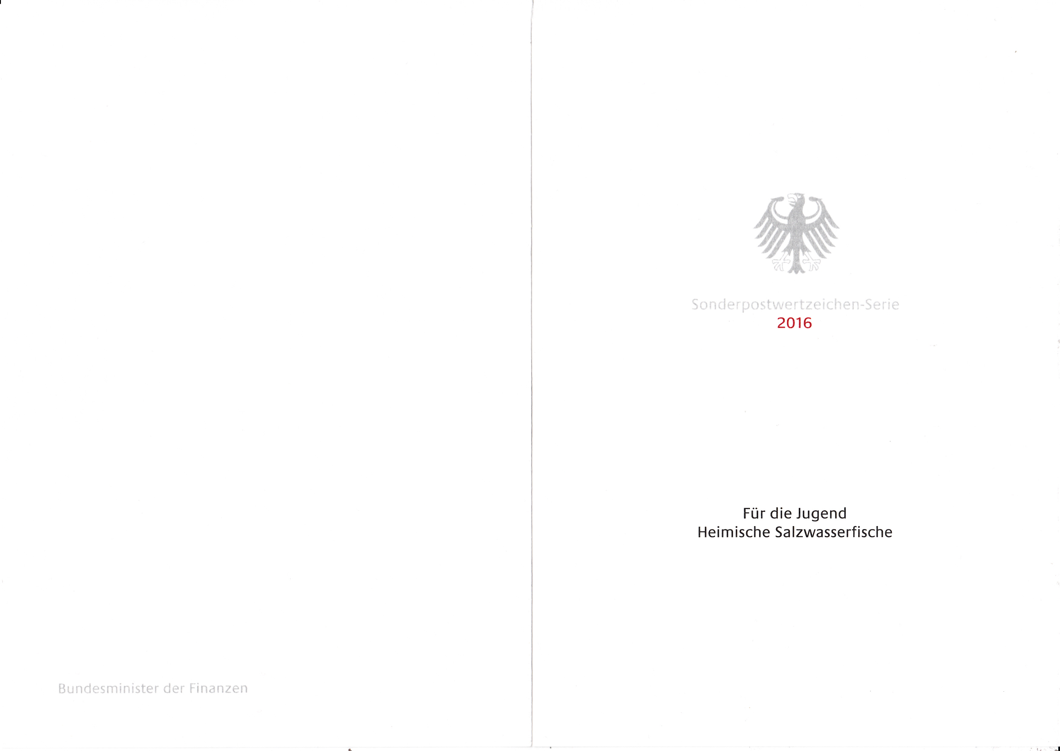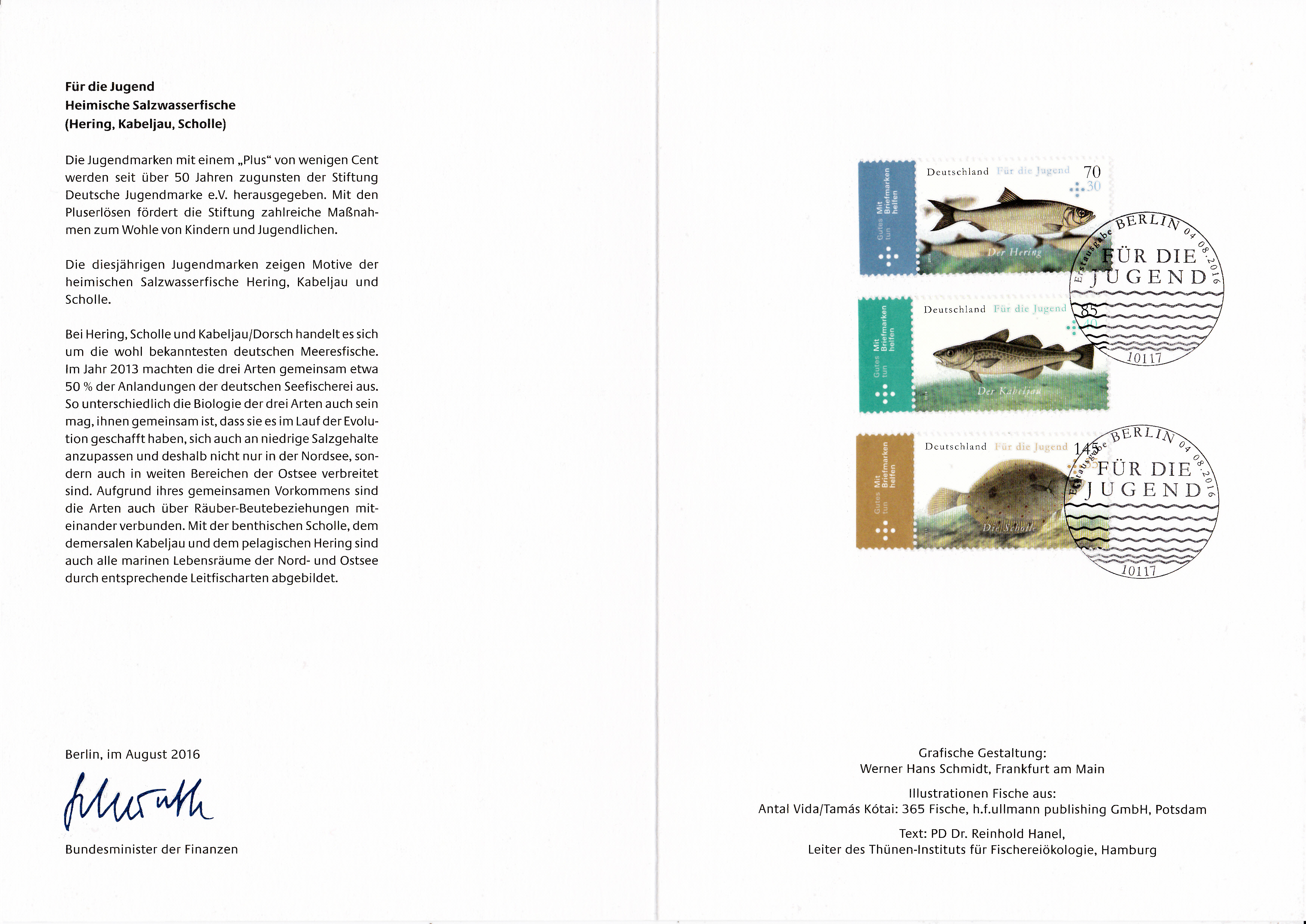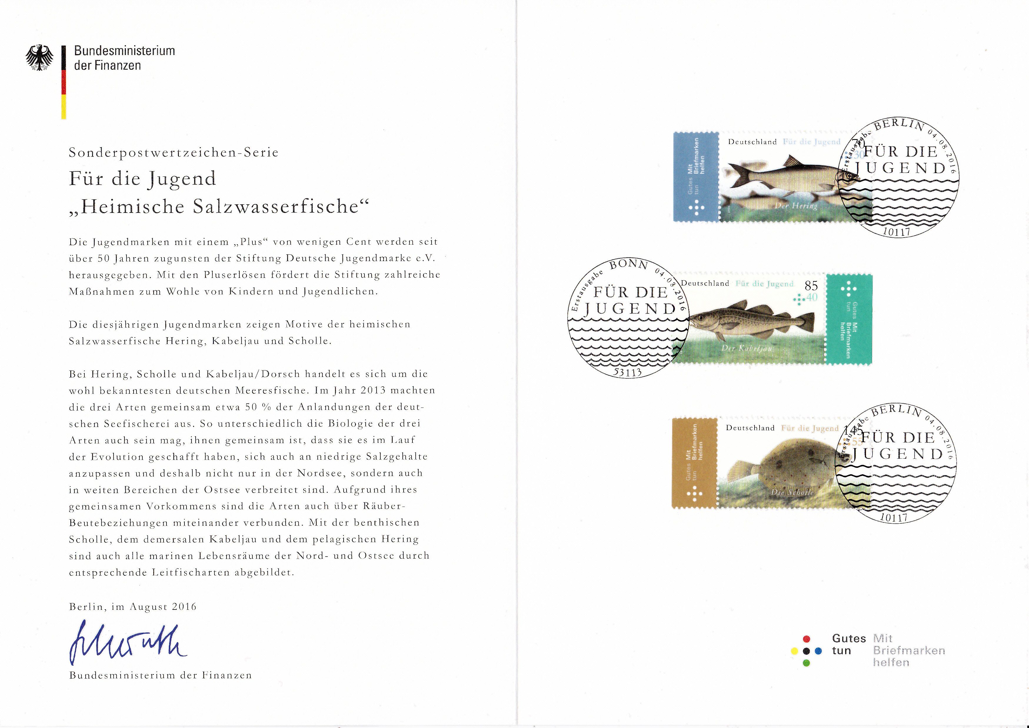 Hier wieder eine der mehrfarbigen Ministerkarten, die es immer zu Markenübergaben durch den Finanzminister gibt. Dies Karte enthält die Jugendmarken 2016 mit den Salzwasserfischen. Zwei Marken sind wie üblich mit dem Ersttagsonderstempel Berlin und eine Marke mit dem aus Bonn gestempelt.