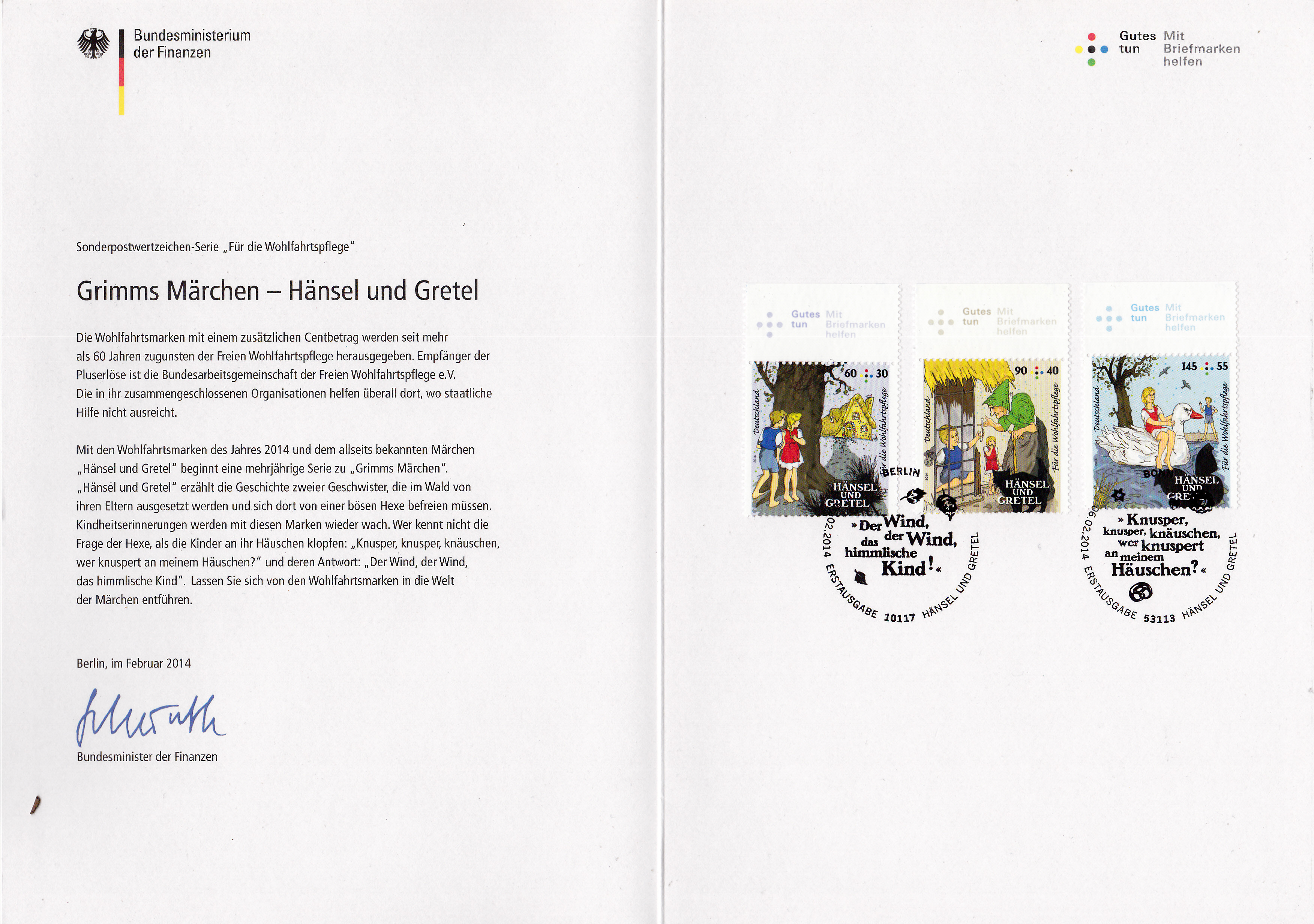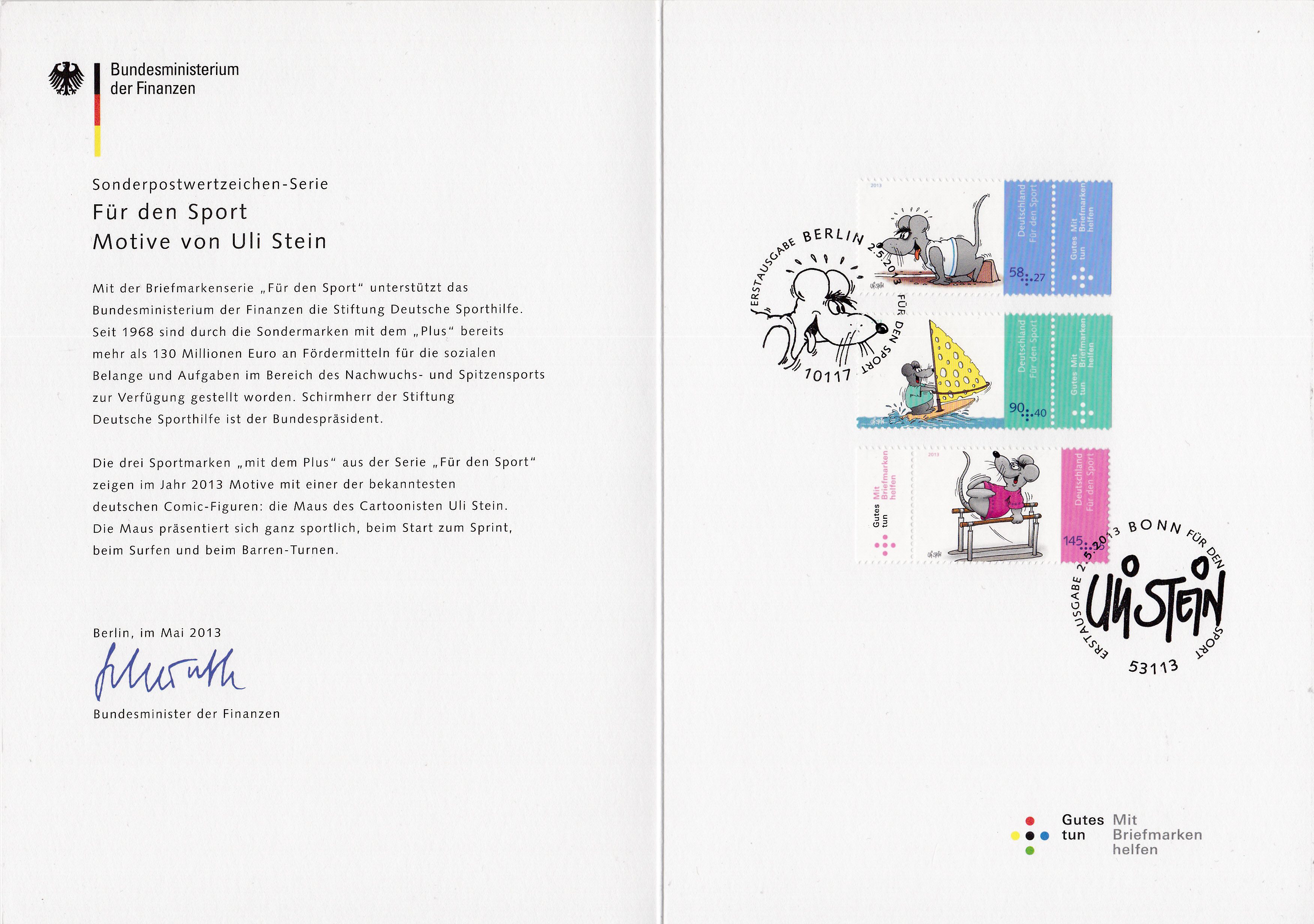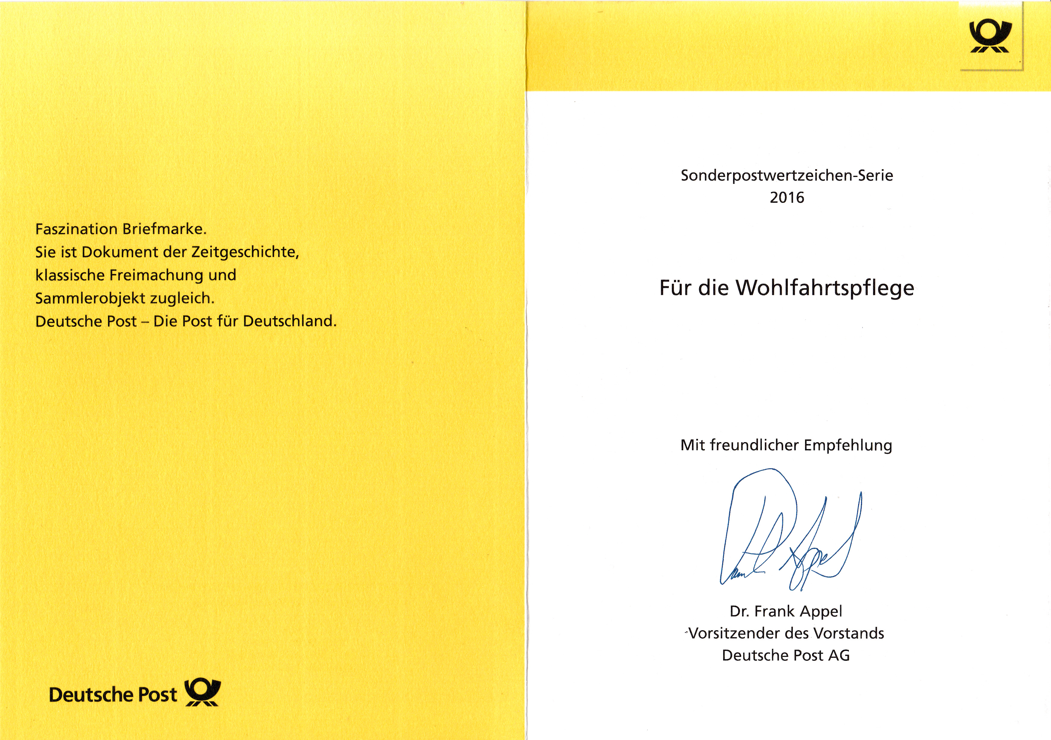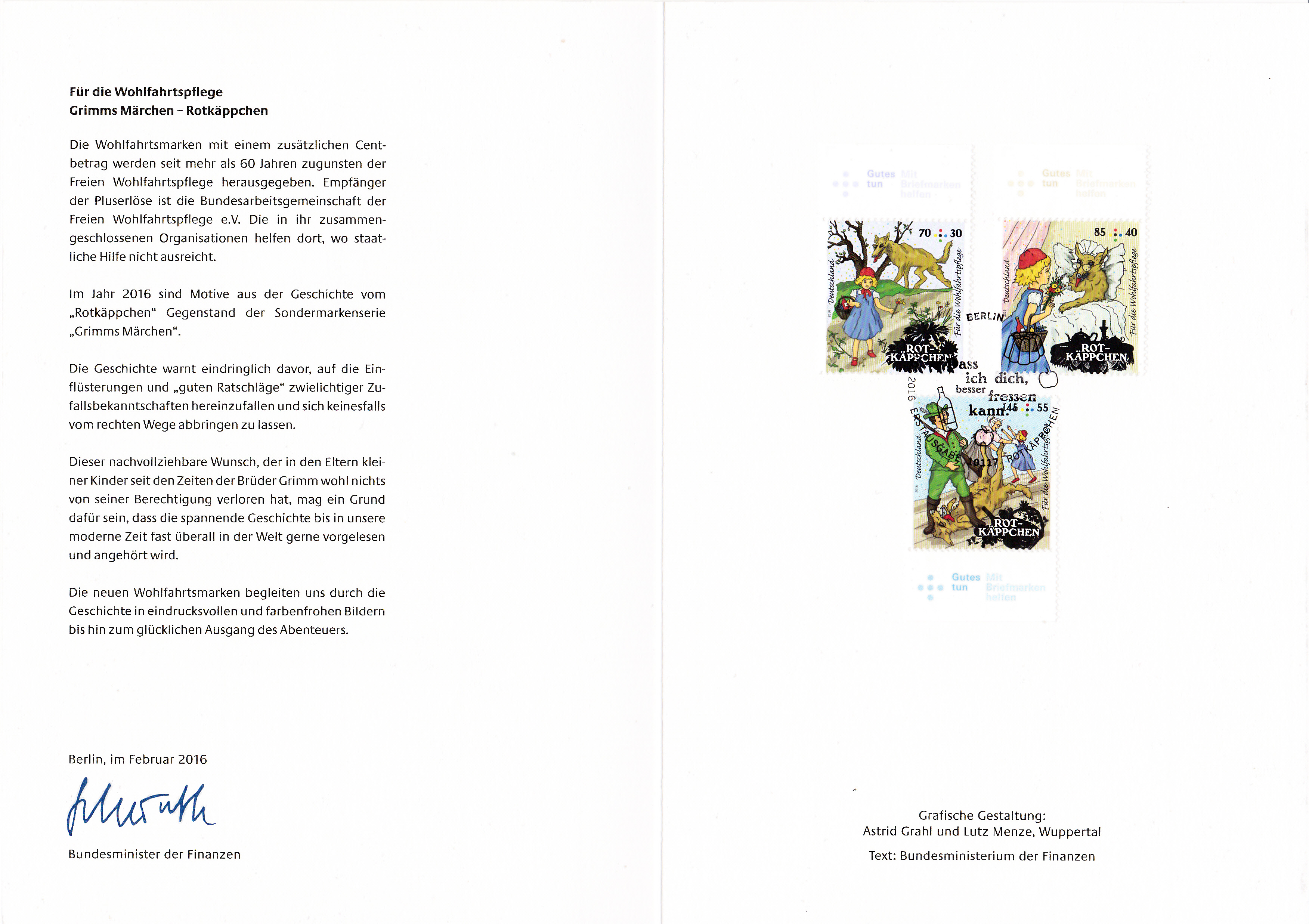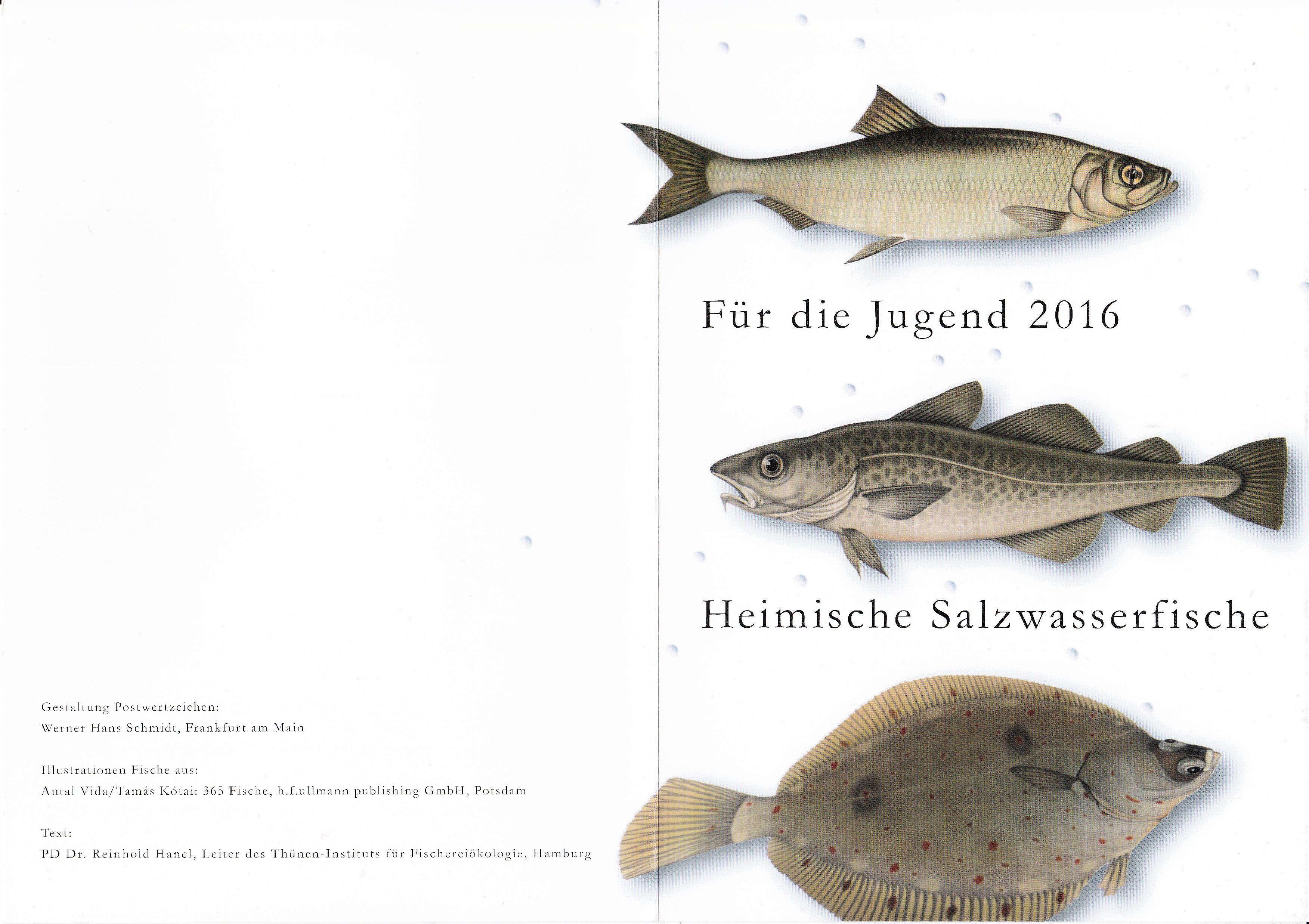 Hier wieder eine der mehrfarbigen Ministerkarten, die es immer zu Markenübergaben durch den Finanzminister gibt. Dies Karte enthält die Jugendmarken 2016 mit den Salzwasserfischen. Zwei Marken sind wie üblich mit dem Ersttagsonderstempel Berlin und eine Marke mit dem aus Bonn gestempelt.