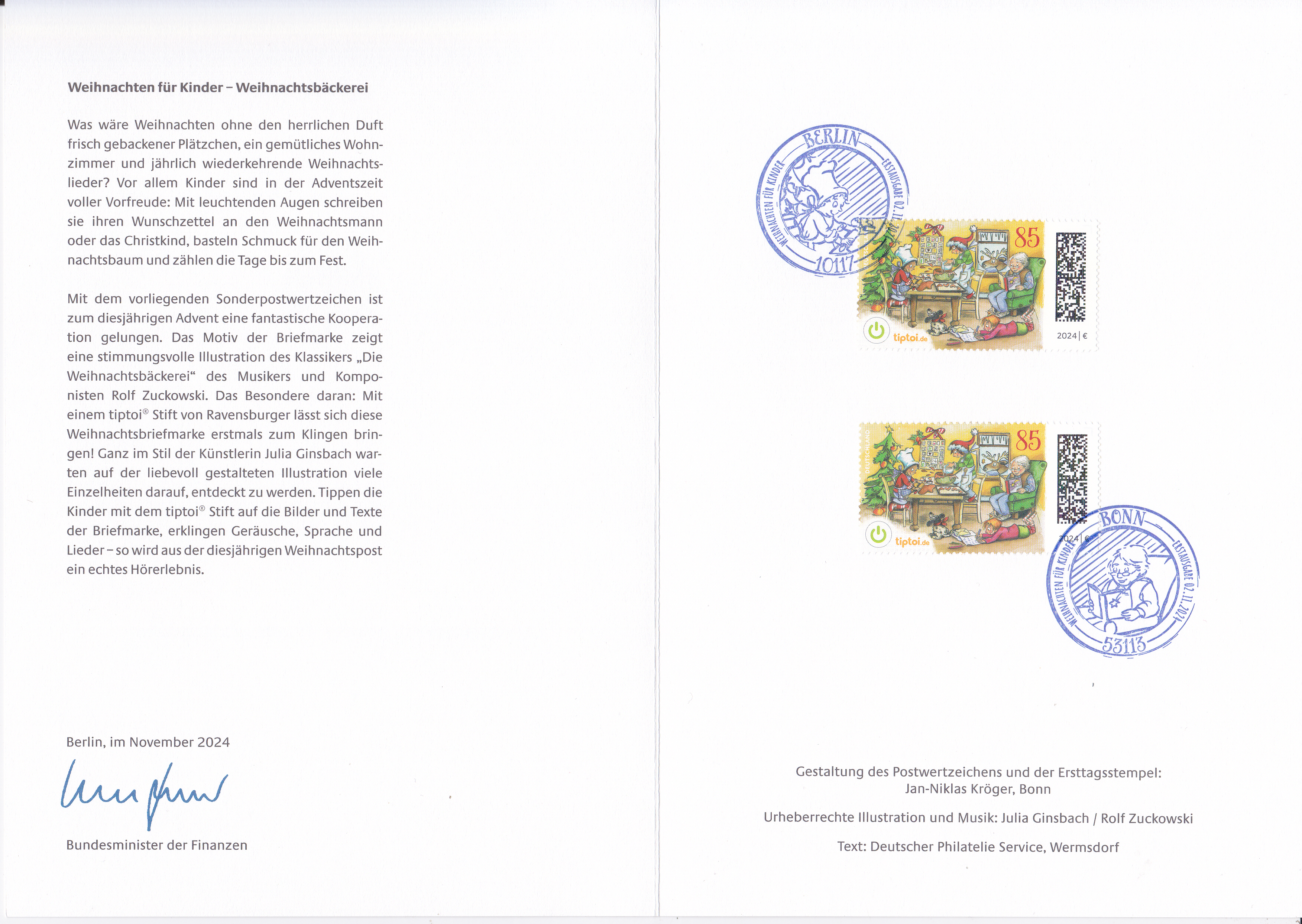 Ministerkarte des Bundesministers für Finanzen mit zwei Marken mit dem Motiv "Weihnachtsbäckerei" (MiNr 3865) und den beiden Ersttagsonderstempel Bonn und Berlin.