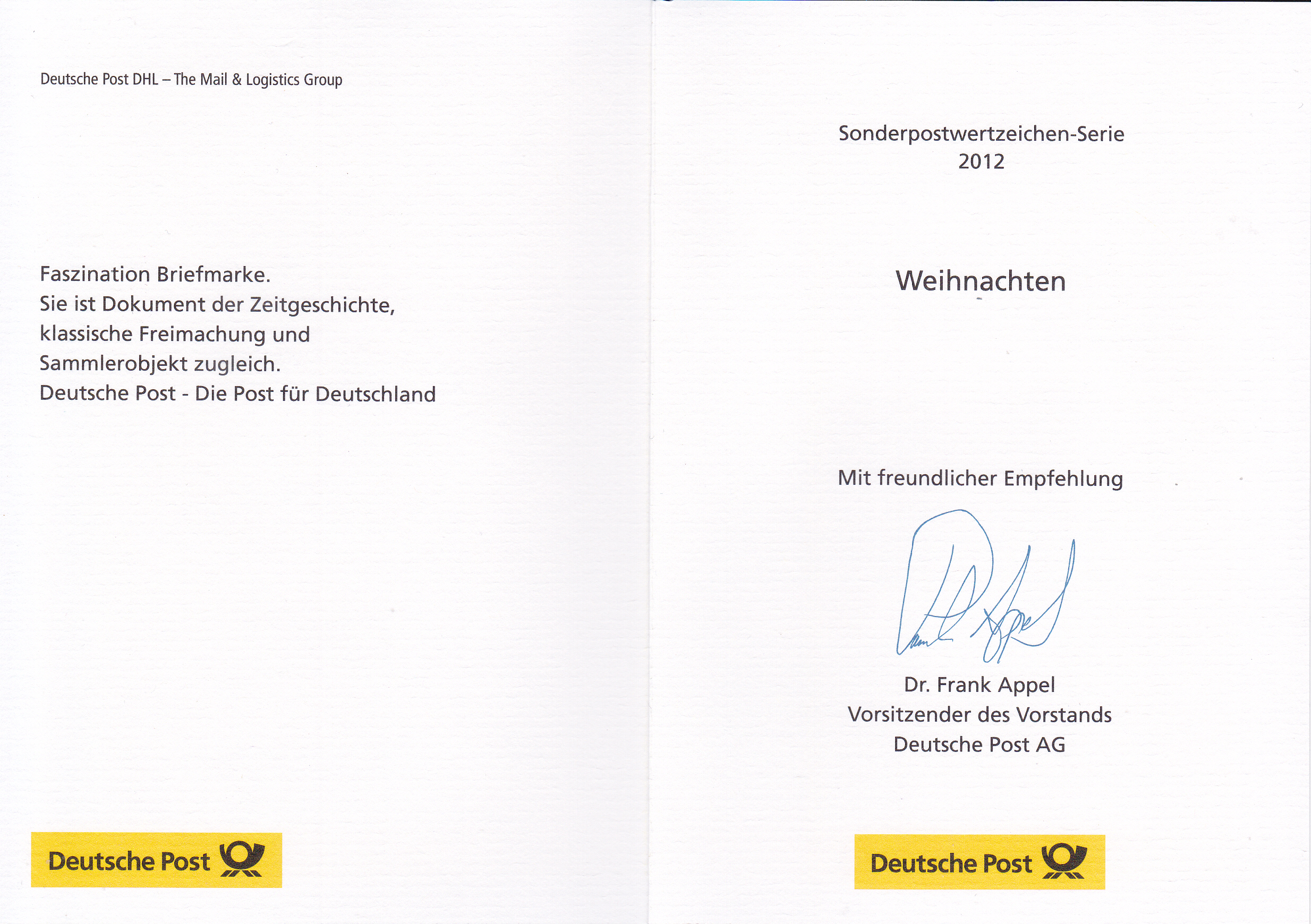 Klappkarte des Vorstandsvorsitzenden der Deutschen Post AG mit der Weihnachtsmarke 2012 der Deutschen Post (MiNr 2961) und dem Ersttagsonderstempel Bonn.