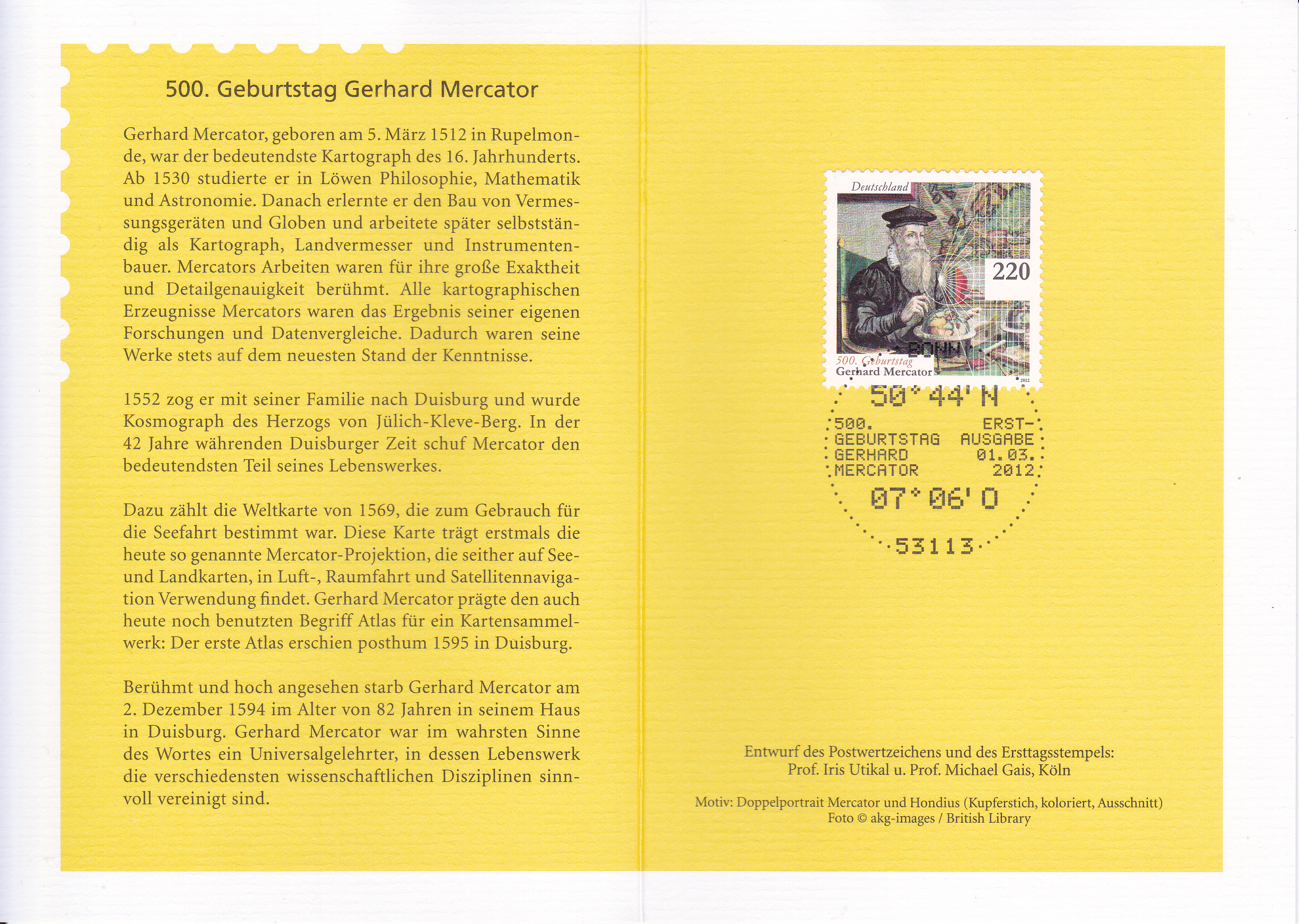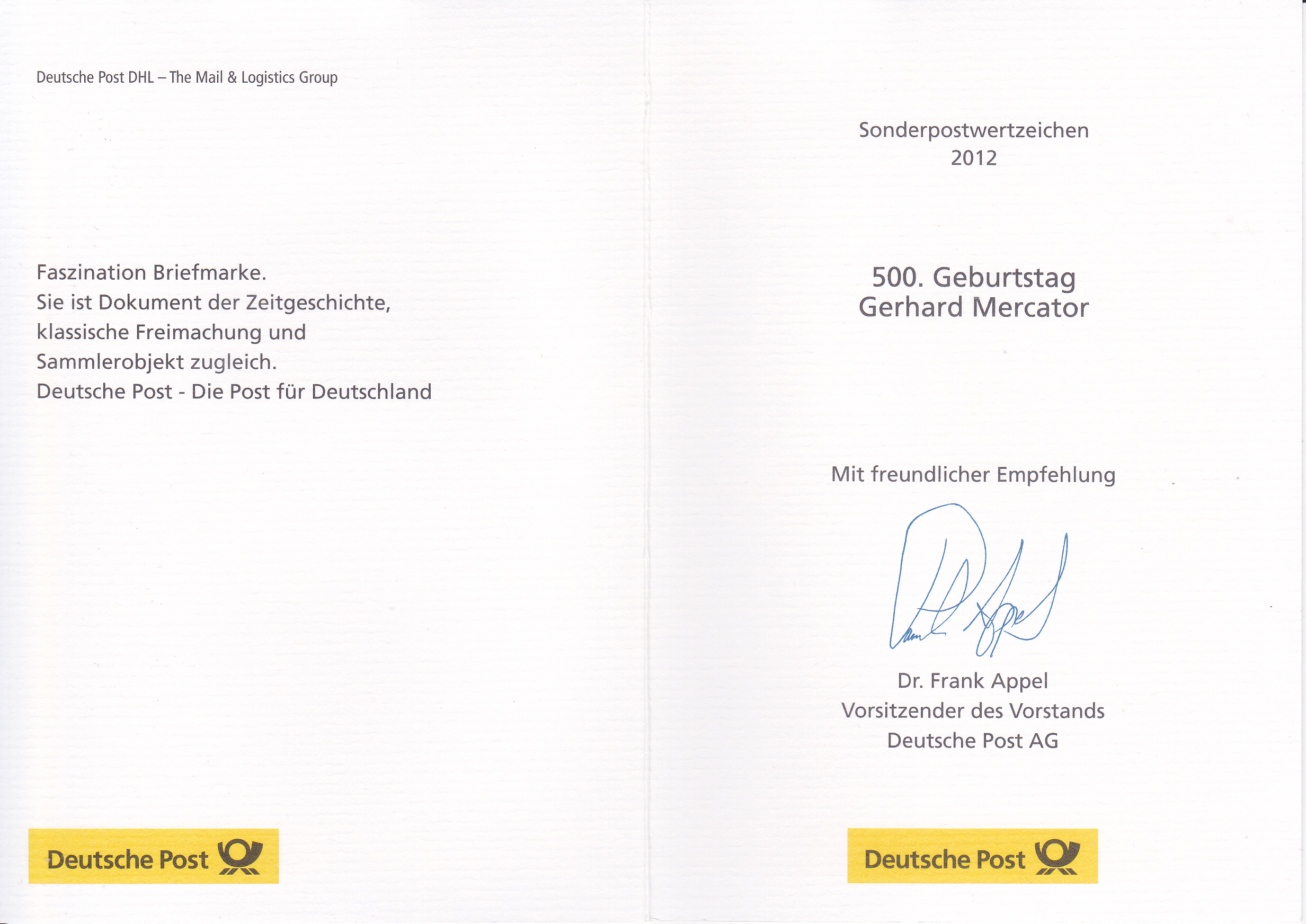Klappkarte des Vorstandsvorsitzenden der Deutschen Post AG mit der Marke der Deutschen Post zum 500. Geburtstag von Gerhard Mercator (MiNr 2961) und dem Ersttagsonderstempel Bonn.
