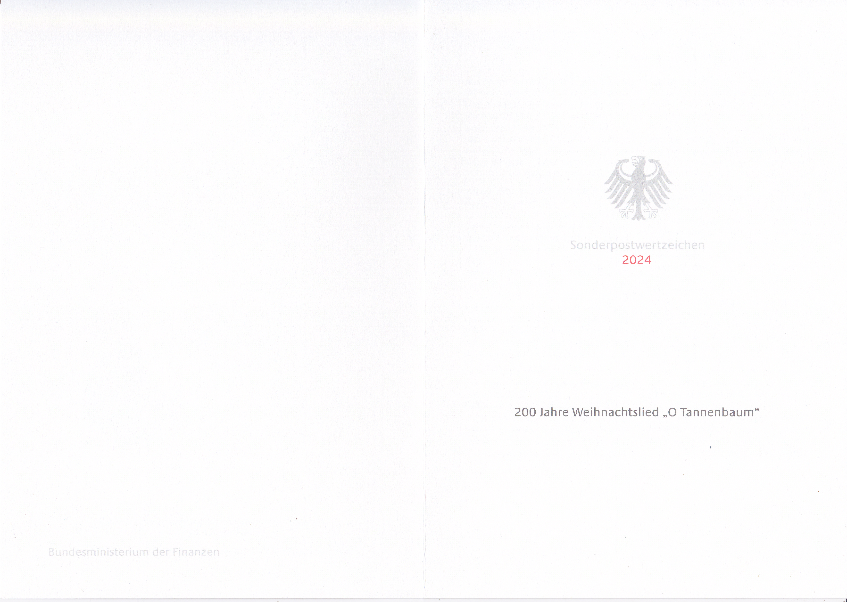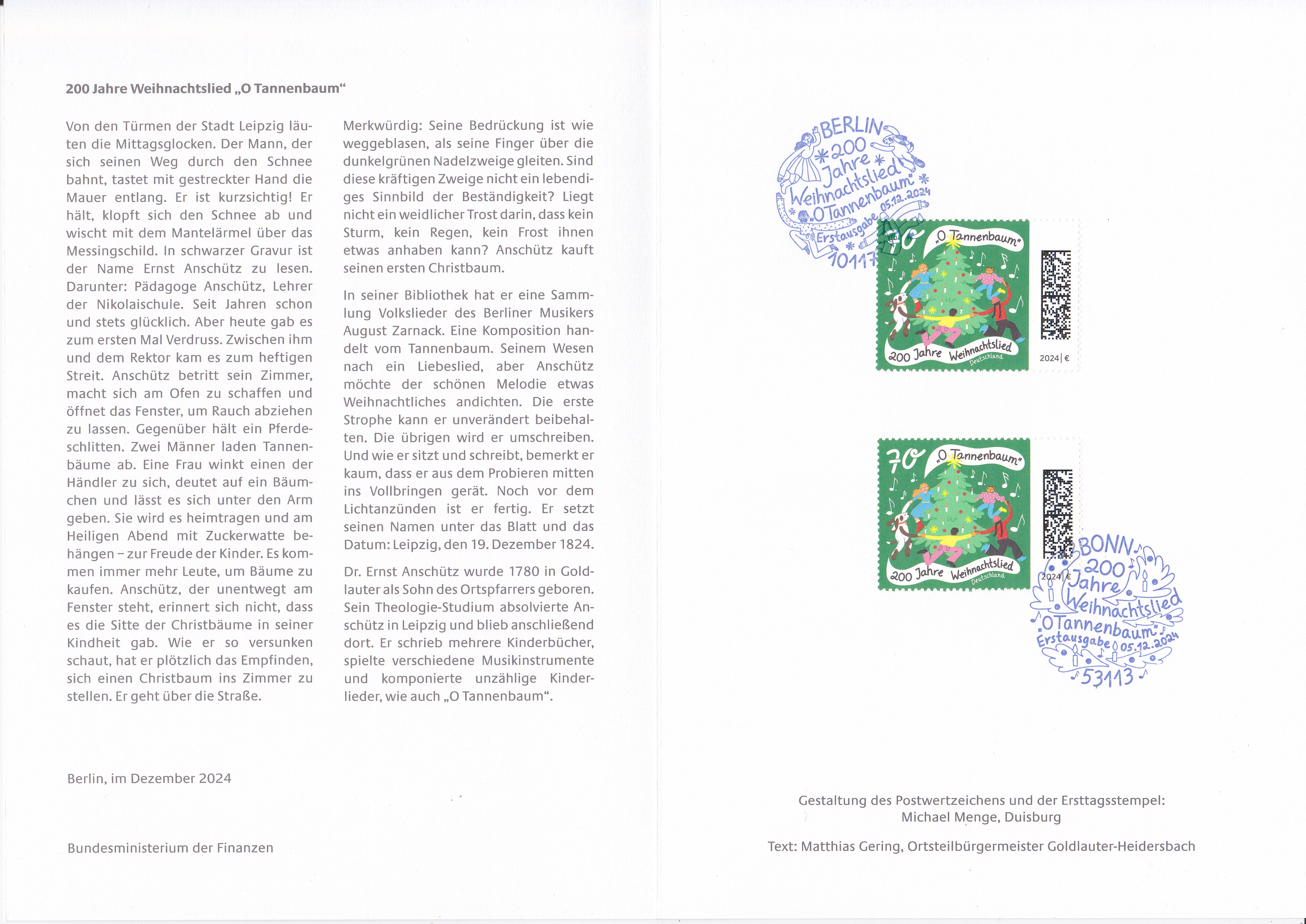 Ministerkarte des Bundesministers für Finanzen mit zwei Marken mit dem Motiv "200 Jahre Weihnachtslied 'O Tannenbaum'" (MiNr 3871) und den beiden Ersttagsonderstempel Bonn und Berlin.
