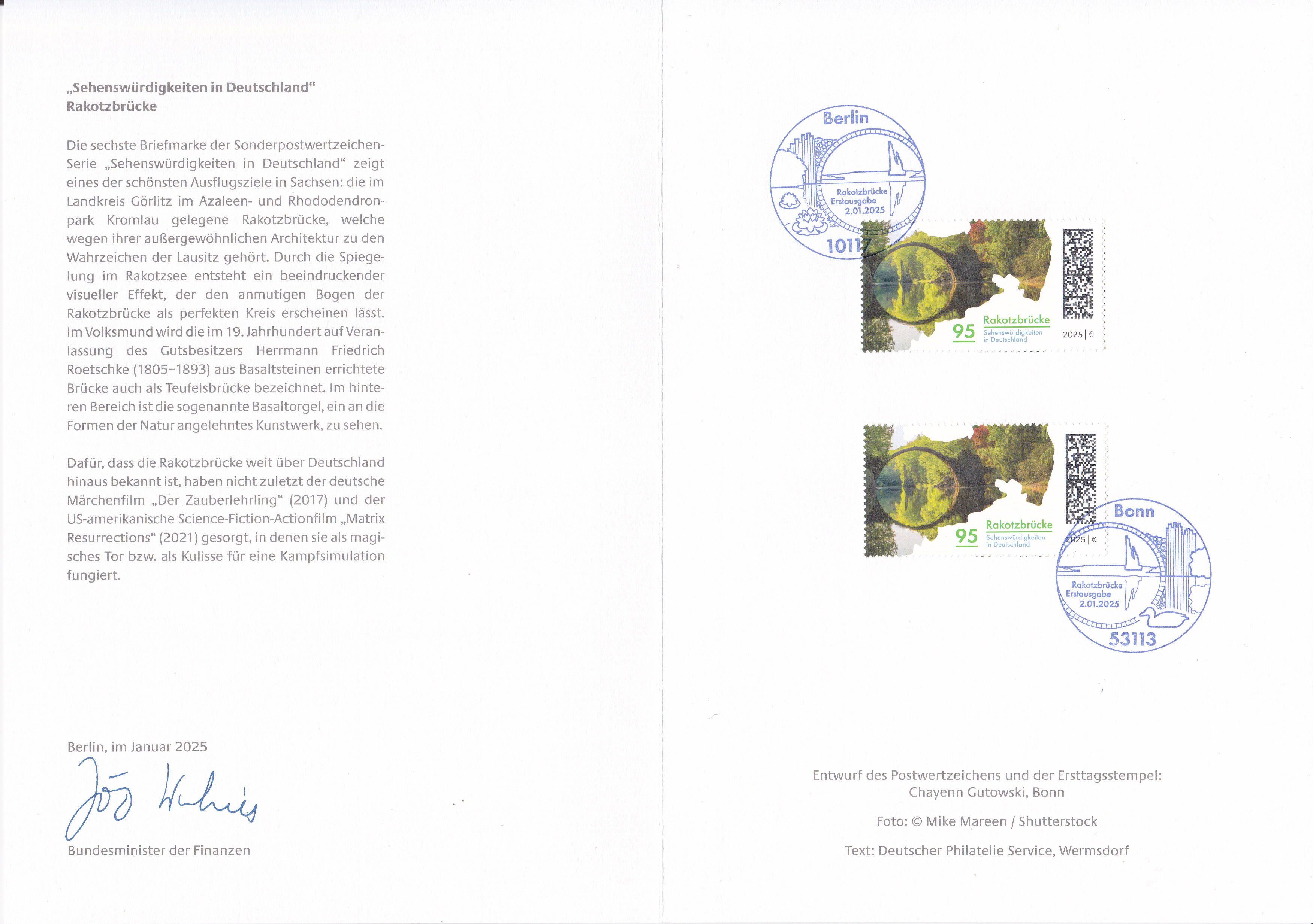 Ministerkarte des Bundesministers für Finanzen mit zwei Marken (MiNr 3877) mit dem Motiv "Rakotzbrücke" aus der Serie "Sehenswürdigkeiten in Deutschland" und den beiden Ersttagsonderstempel Bonn und Berlin.