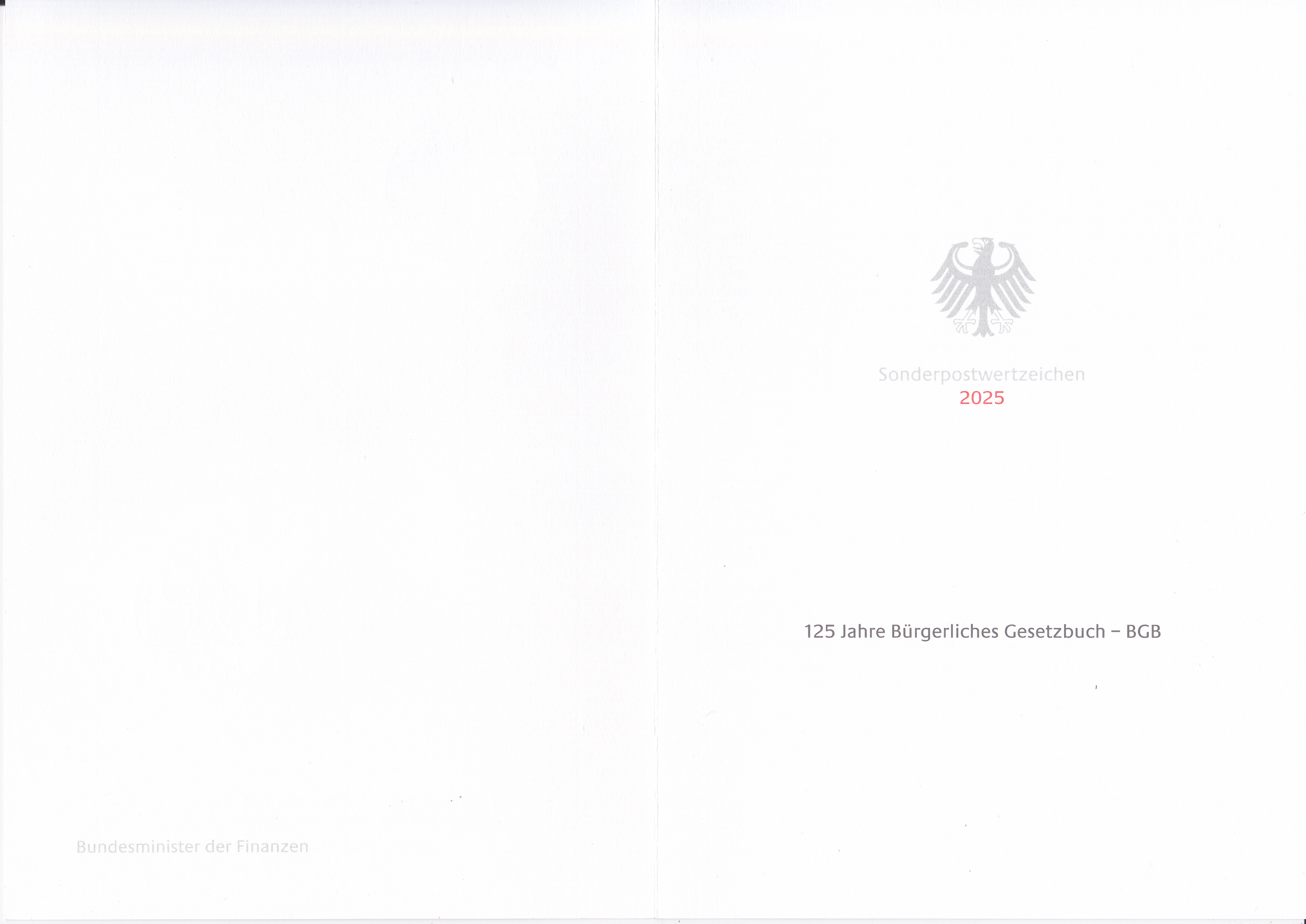Ministerkarte des Bundesministers für Finanzen mit zwei Marken "125 Jahre Bürgerliches Gesetzbuch" (MiNr 3879) und den beiden Ersttagsonderstempel Bonn und Berlin.