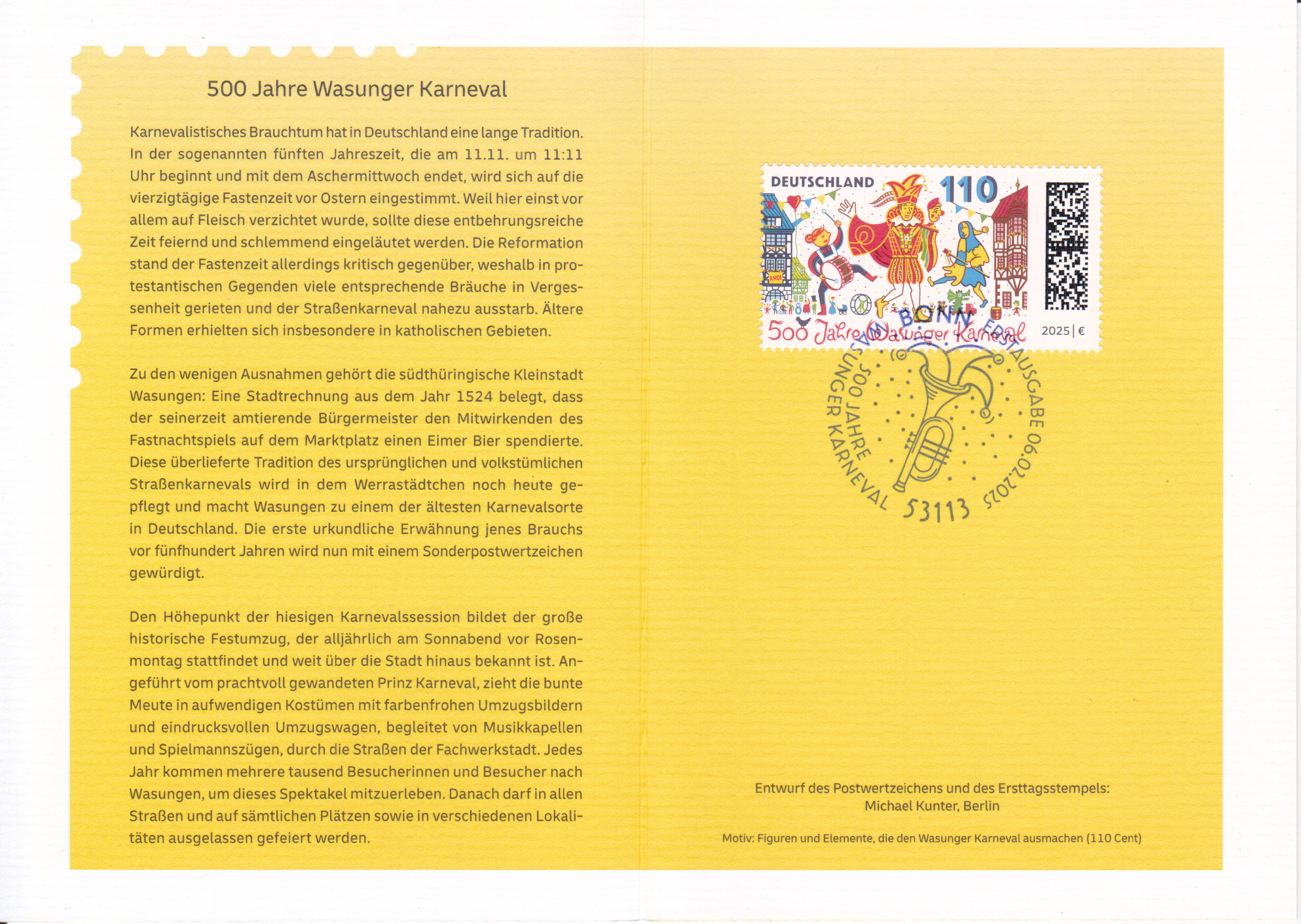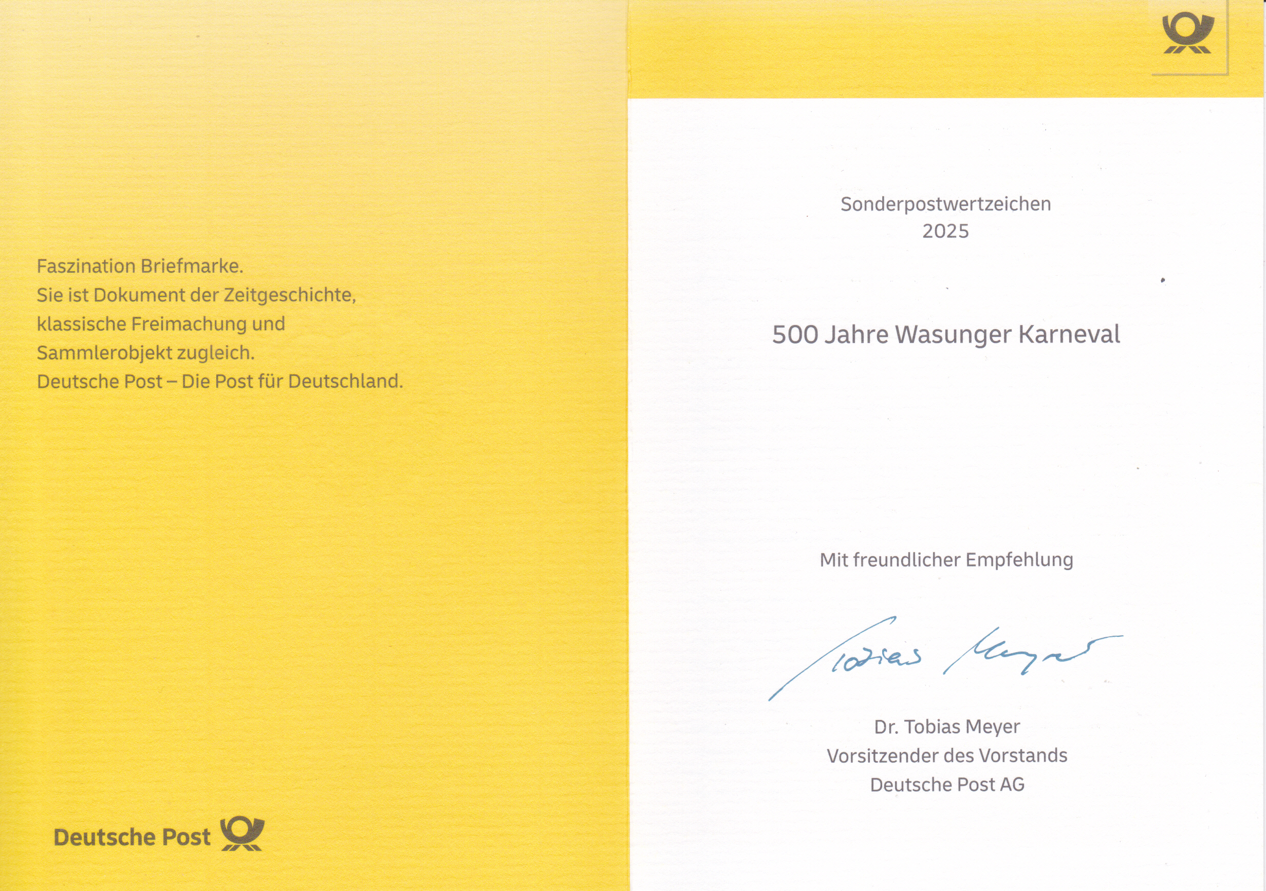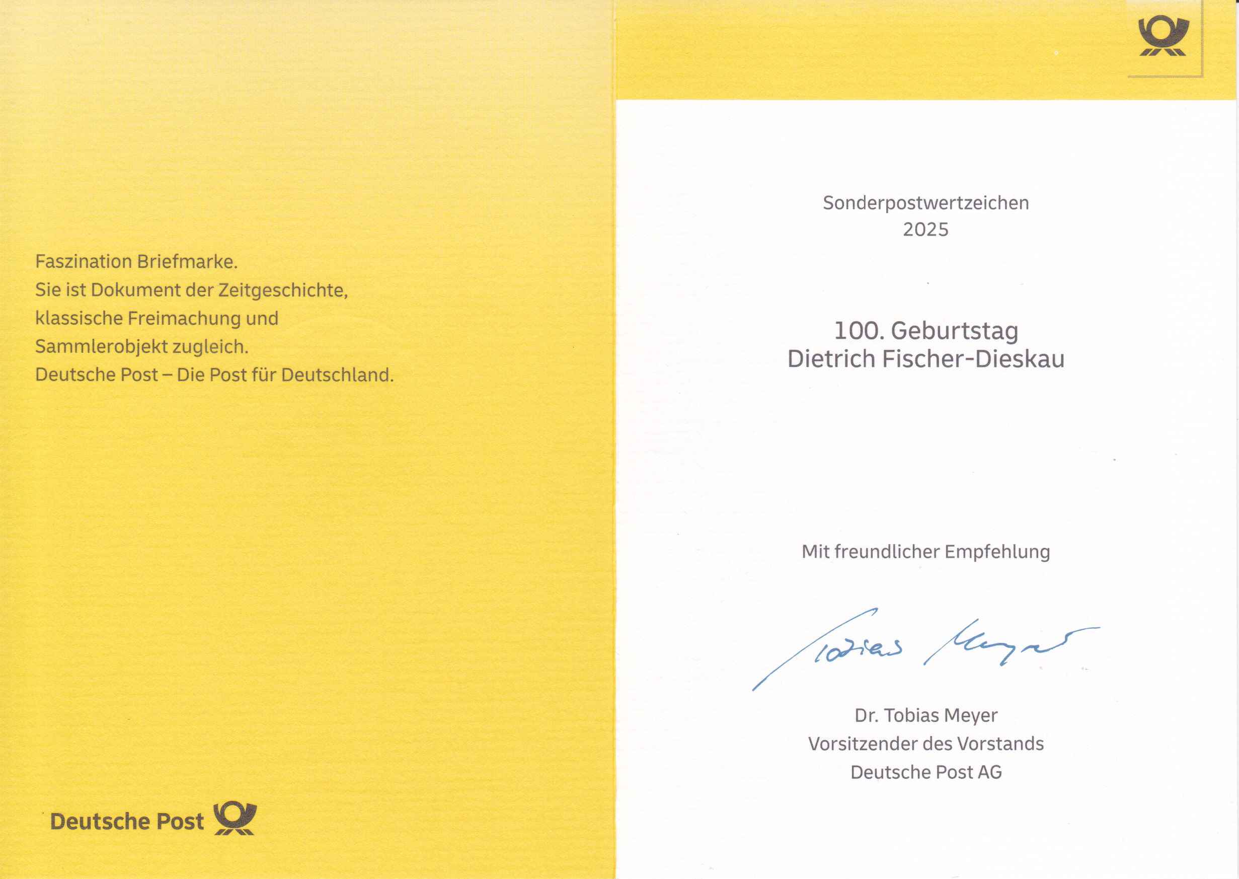 Klappkarte des Vorstandsvorsitzenden der Deutschen Post AG mit der Marke (MiNr 3900) mit der Abbildung "Flughafengebäude, Chemnitz (ehedem Karl-Marx-Stadt), auf Photographien der Jahre 1959 und 2024, Doppeldecker Antonow AN-2 DM-SKJ" aus der Serie "Zeitreise durch Deutschland" und dem Ersttagsonderstempel Bonn.