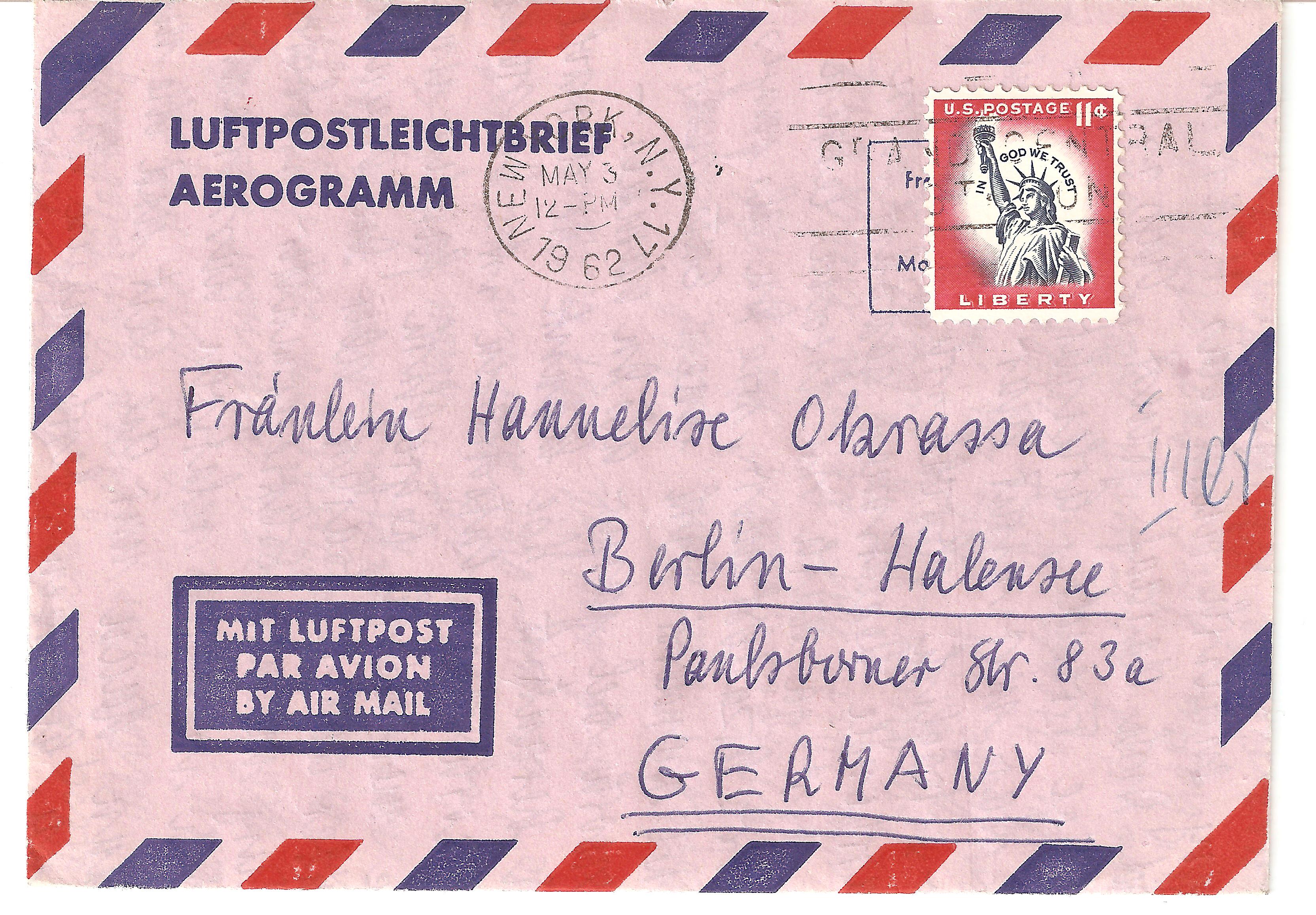 Portogerechte Einzelfrankatur auf Luftpostleichtbrief vom 03.05.1962 von New York nach Berlin.