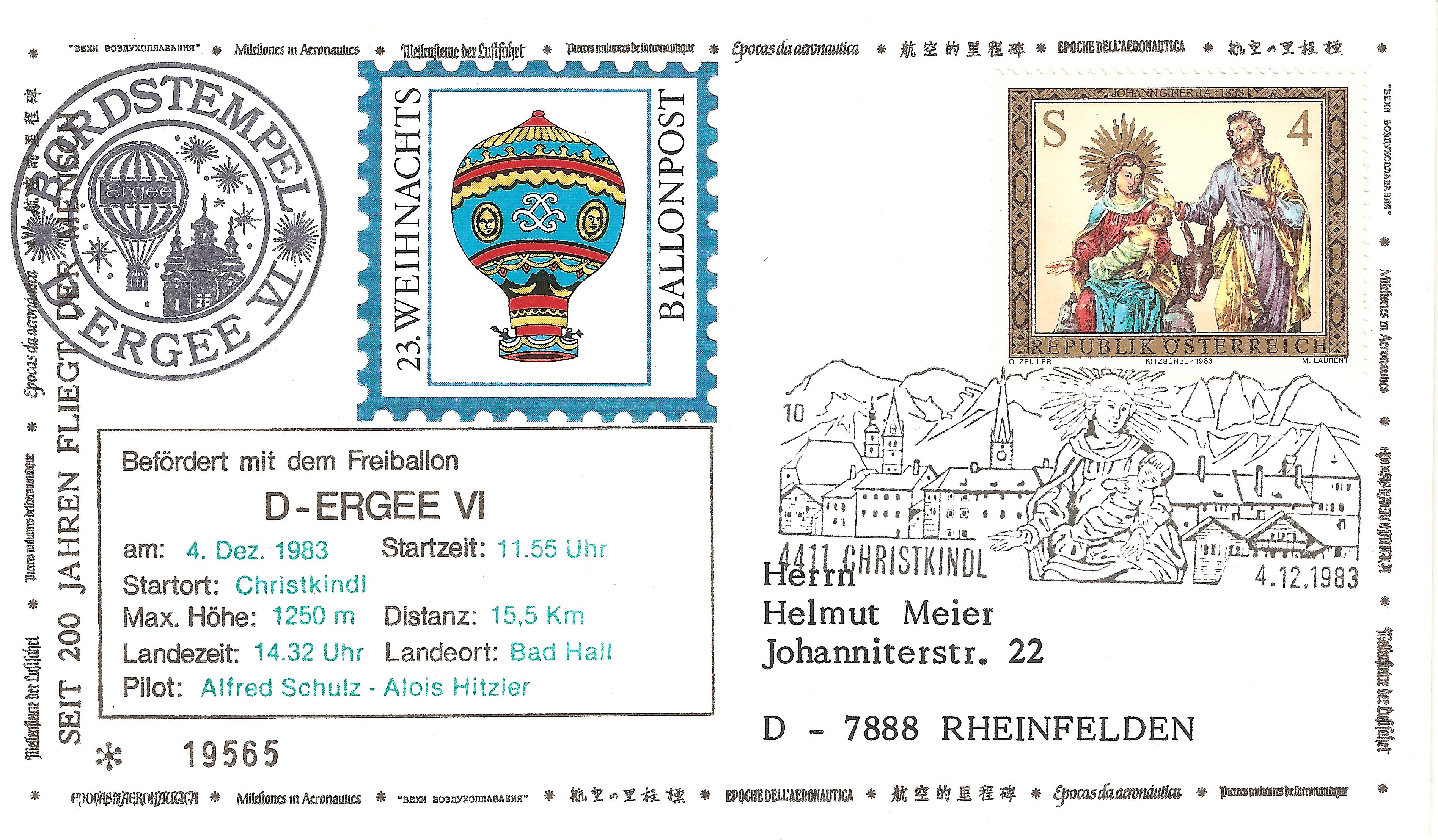 Ballonpostbeleg mit Christkindl-Sonderstempel vom 04.12.1983 nach Rheinfelden.