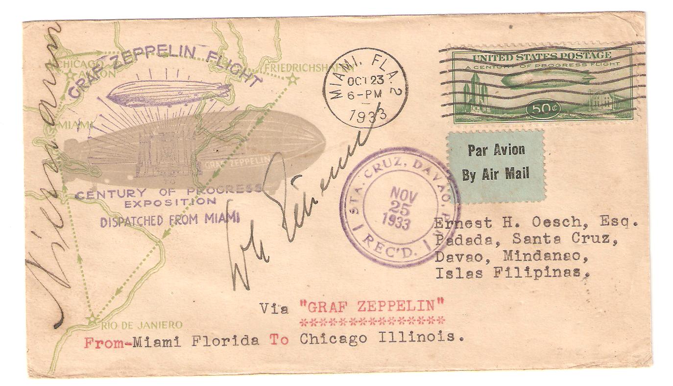 Abgebildet ist ein Bordpostbeleg des Rundfluges des Luftschiffes "Graf Zeppelin" anlässlich der Weltausstellung 1933. Die Route des Rundfluges war Friedrichshafen - Rio de Janiero - Miami - Chicago - Friedrichshafen. Die Route ist bei diesem Brief auch als zudruck abgebildet. Der Brief wurde in diesem Fall am 23.10.1933 in Miami aufgegeben, wurde mit dem Luftschiff nach Chicago befördert und dort weitergeleitet nach Santa Cruz auf den Phillipienen, wo er am 25.11.1933 an kam.