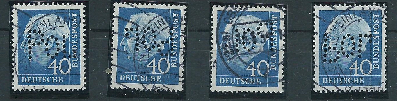 Dann noch Beispiele für die Privat-Lochungen. Es gibt auch Literatur über die bekannten Lochungen, so dass darüber die erstellenden Firmen ermittelt werden könnnen. Diese liegt mir leider nicht vor, da ich diese Stücke nur am Rande mit sammle, wenn mir zufällig mal etwas über den Weg läuft. Aus der Erinnerung heraus handelt es sich bei dem stilisierten V auf der 40-Pf-Marke um den Vogel-Verlag. Woher die Lochung der 7-Pf-Marken stammt, kann ich leider nicht sagen. Falls da jemand mehr Ahnung hat, bitte die Angaben ergänzen.