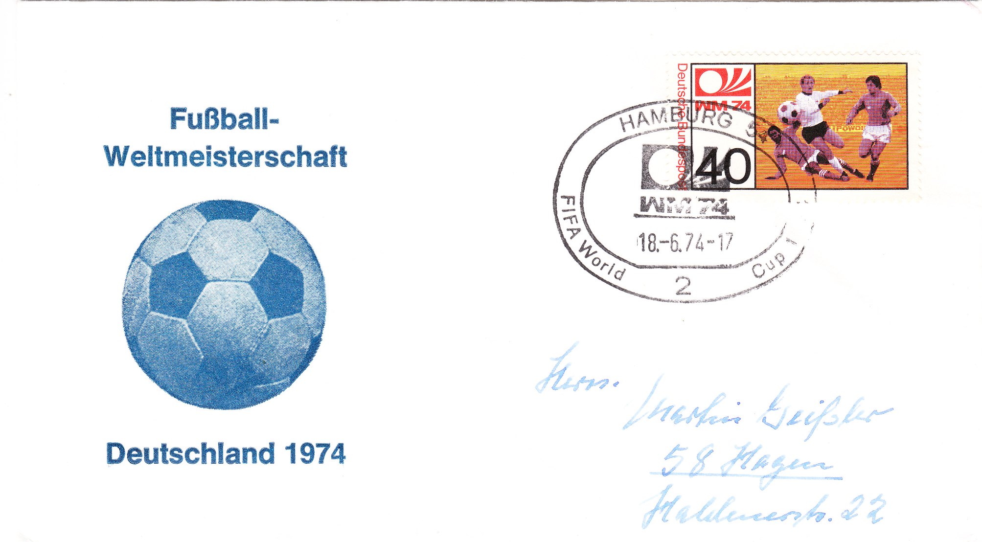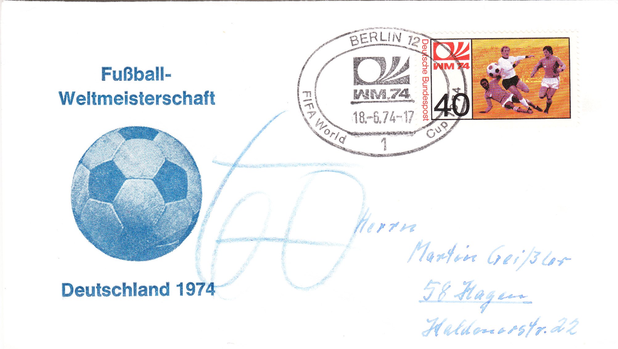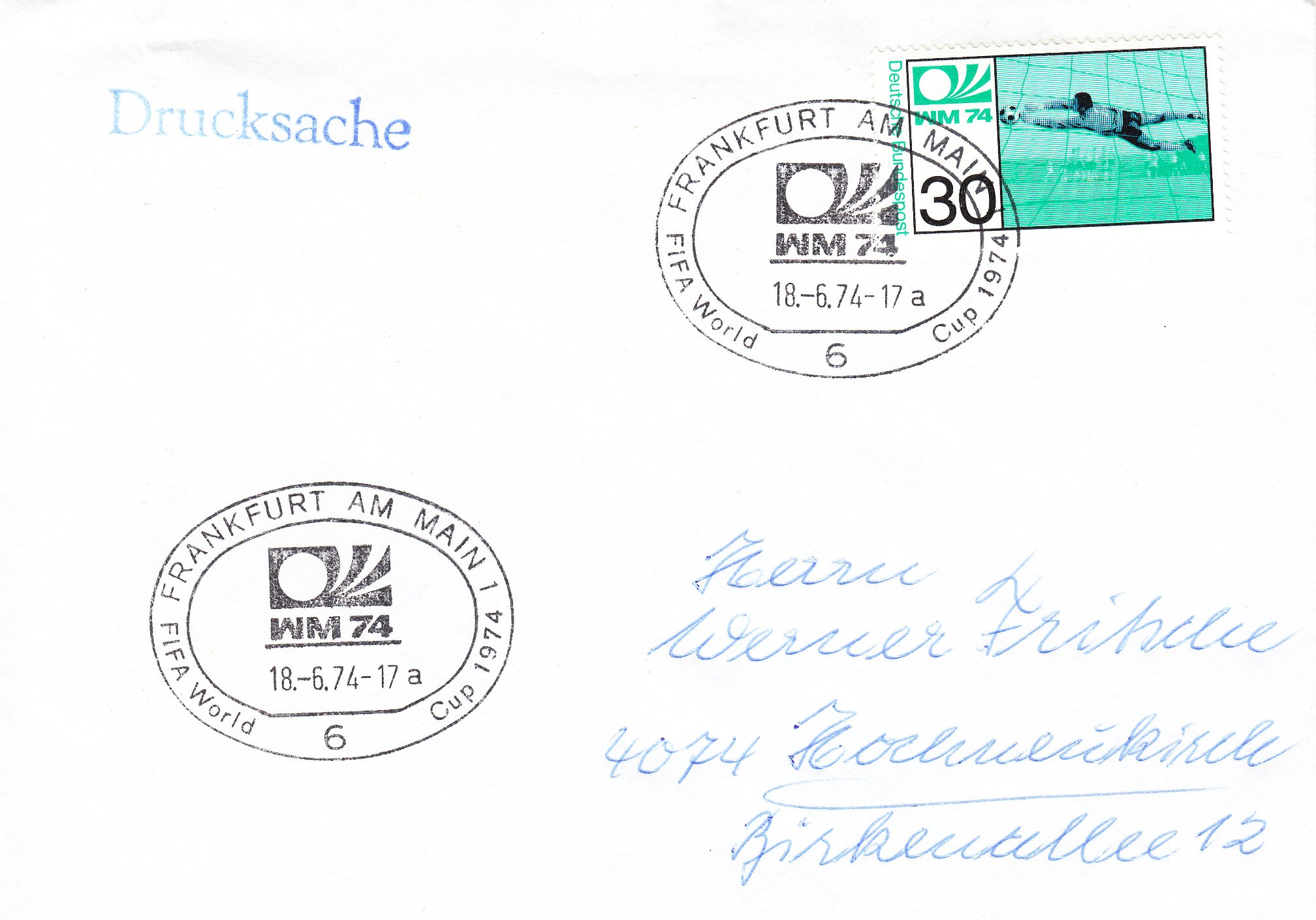 Dieser Beleg wurde am 18.06.1974 in Berlin mit dem zum Markenmotiv passenden Handwerbestempel entwertet: