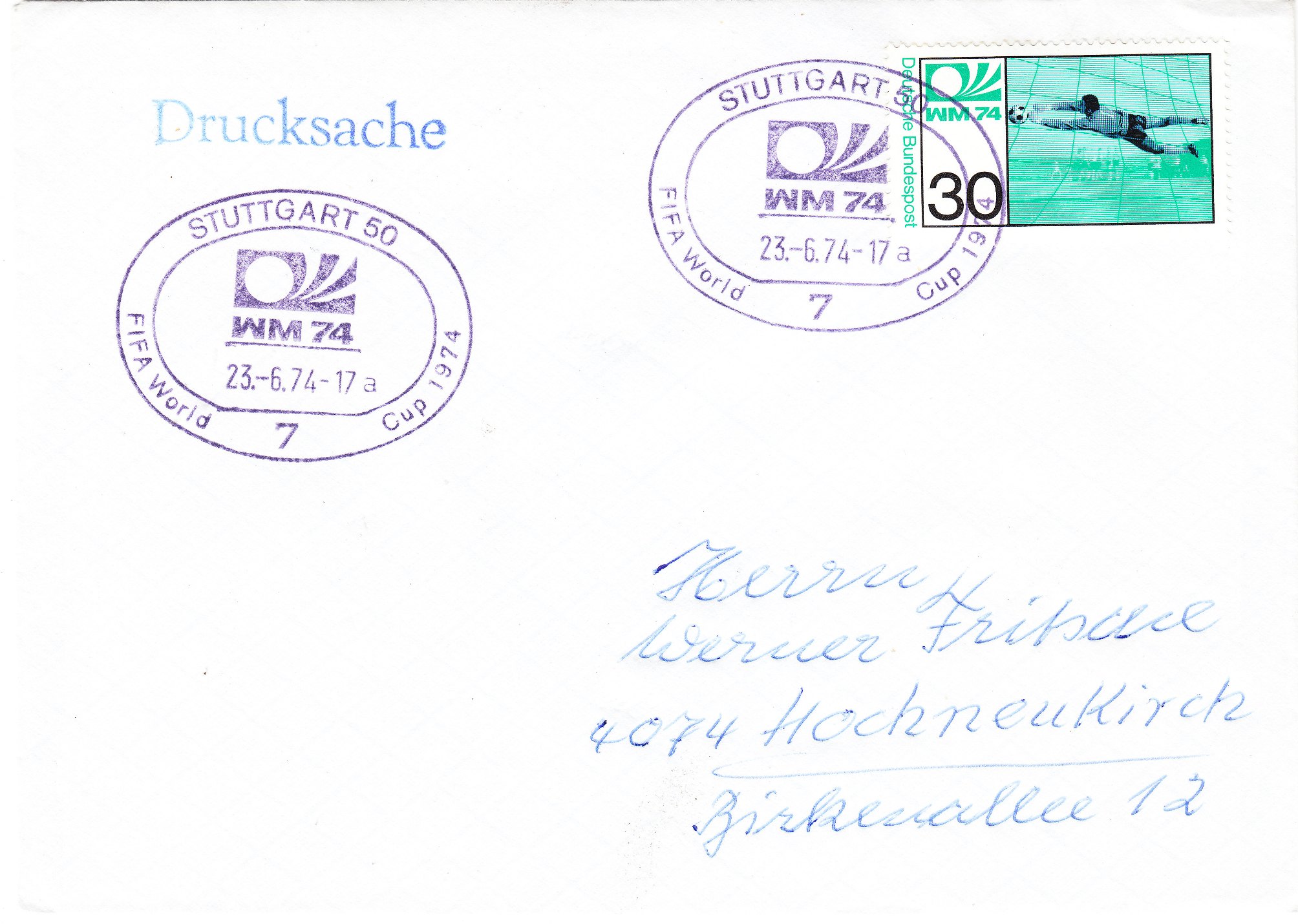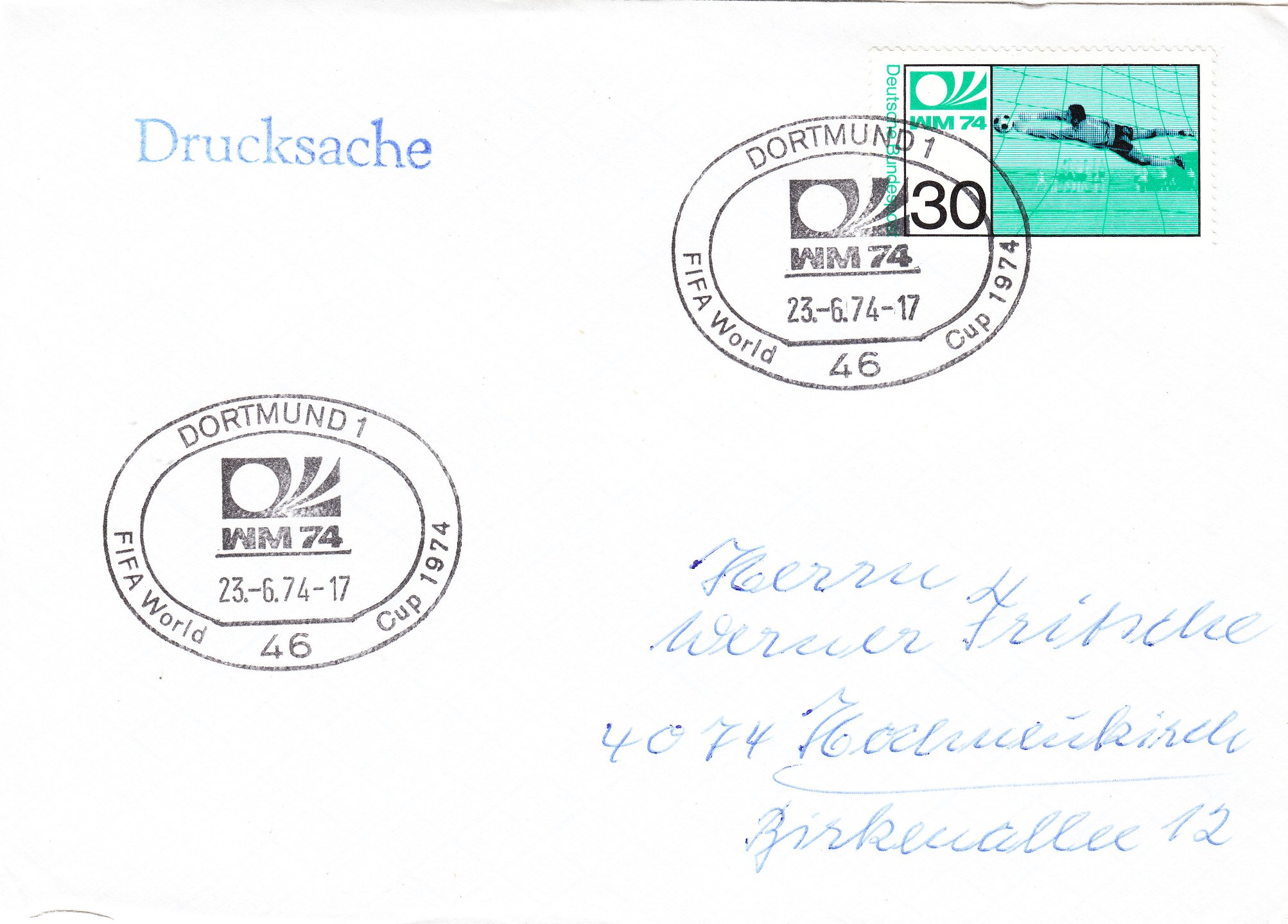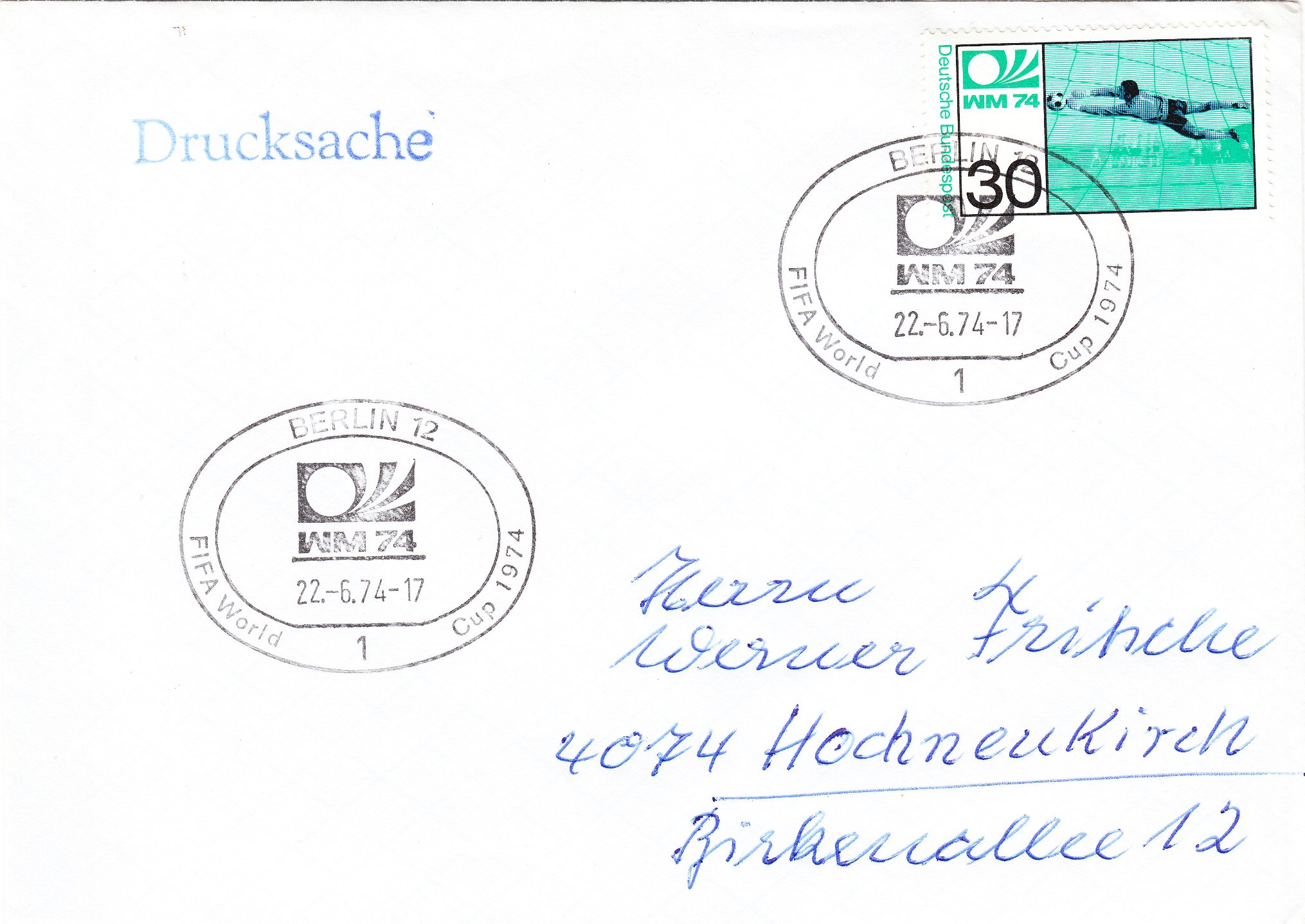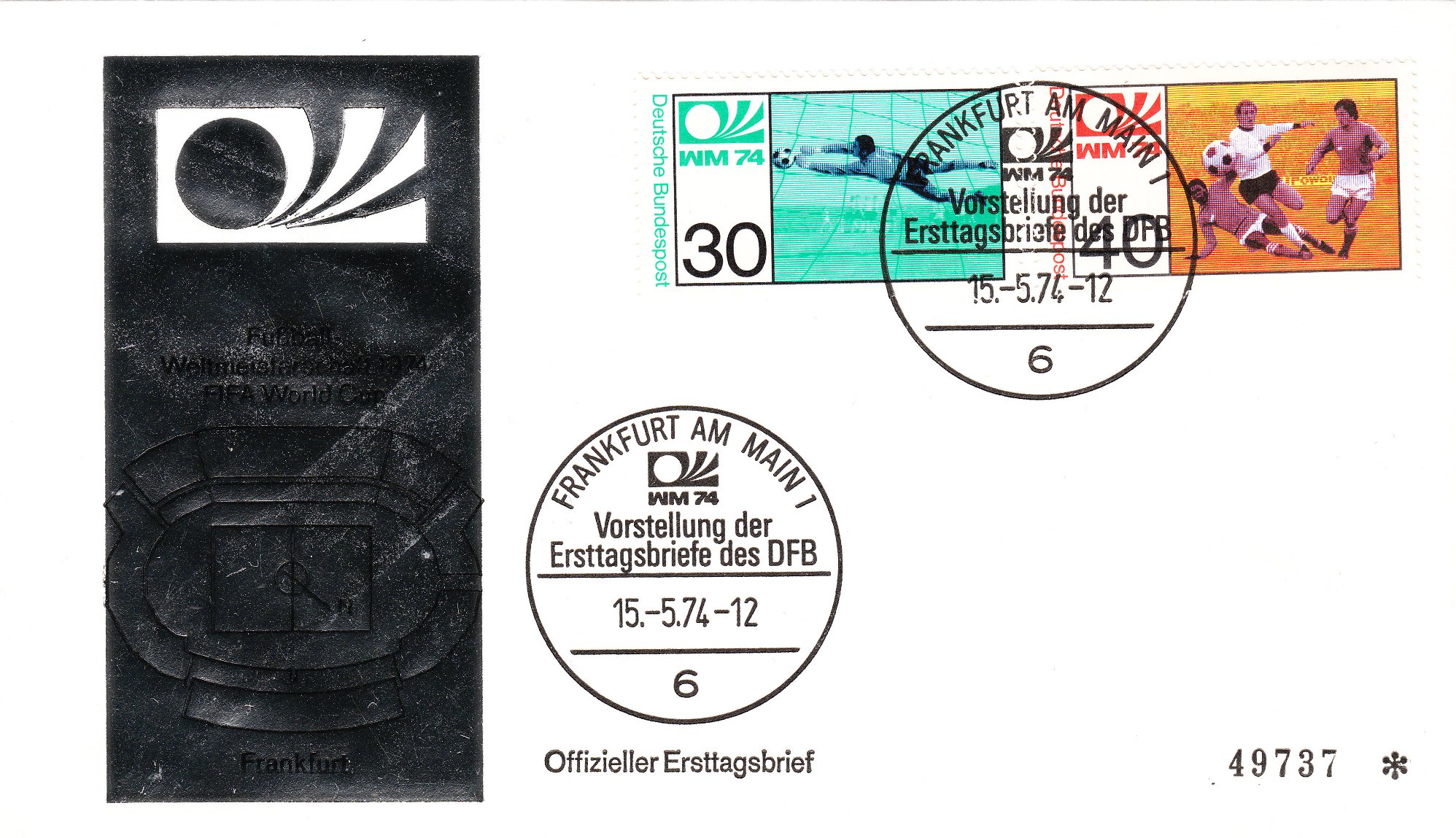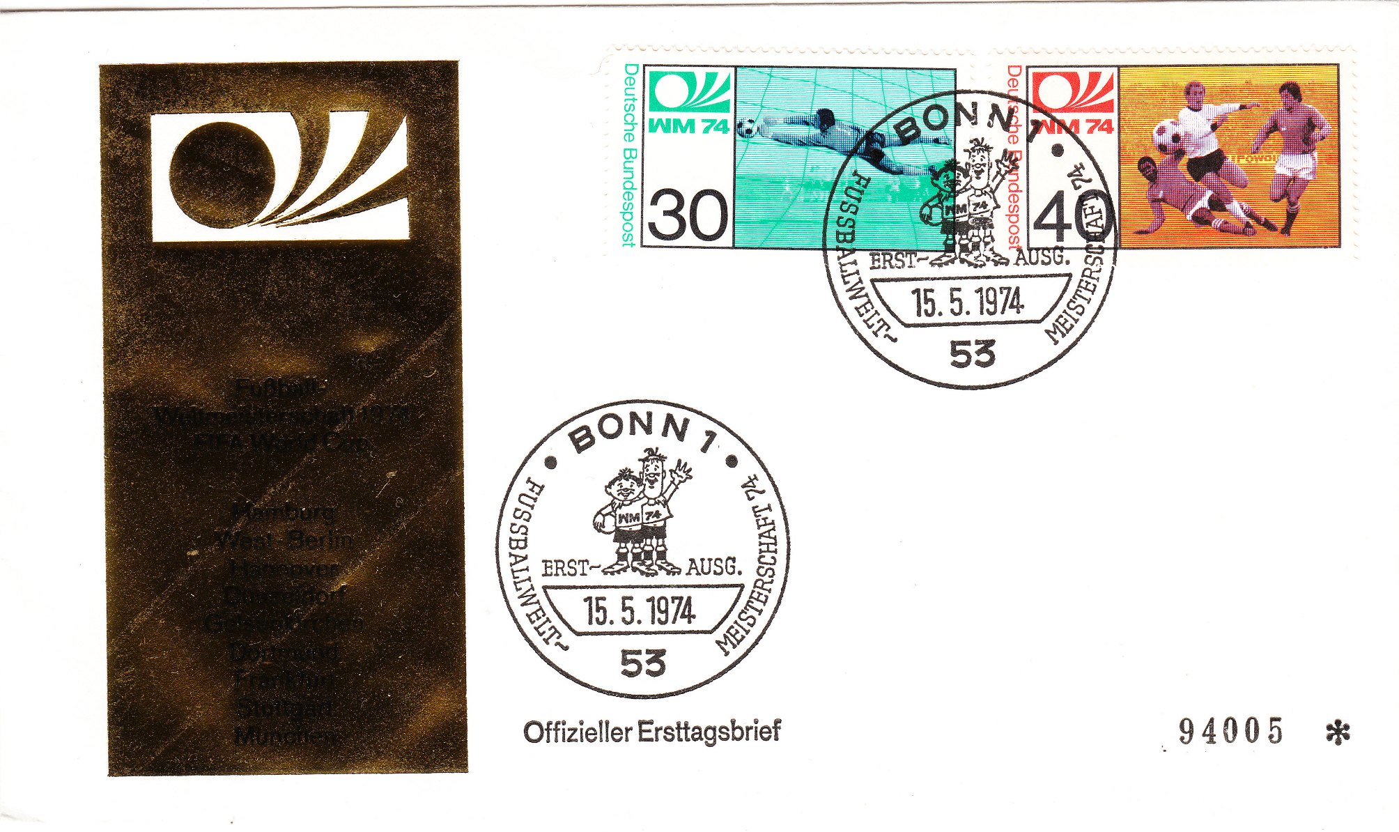 Die beiden Sondermarken der Deutschen Bundespost zur Fußball WM 1974 (MiNr. 811/12) wurden am 15.05.1974 verausgabt, wie dies dieser "offizielle" Ersttagsbrief, der leider nicht echt gelaufen, aber nummeriert "94005" ist, zeigt. Im Stempelbild sind Tip und Tap, die Maskottchen der WM 74 zu sehen: