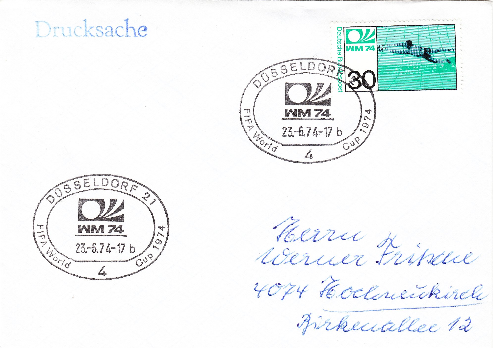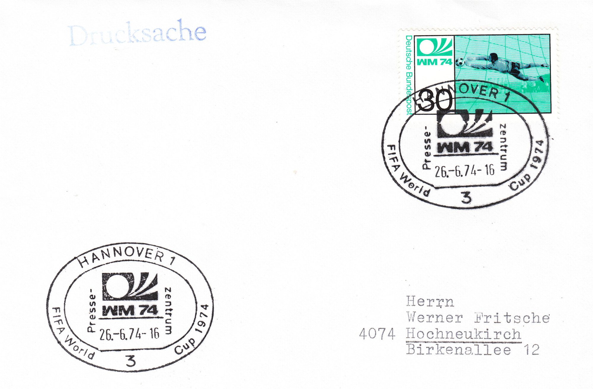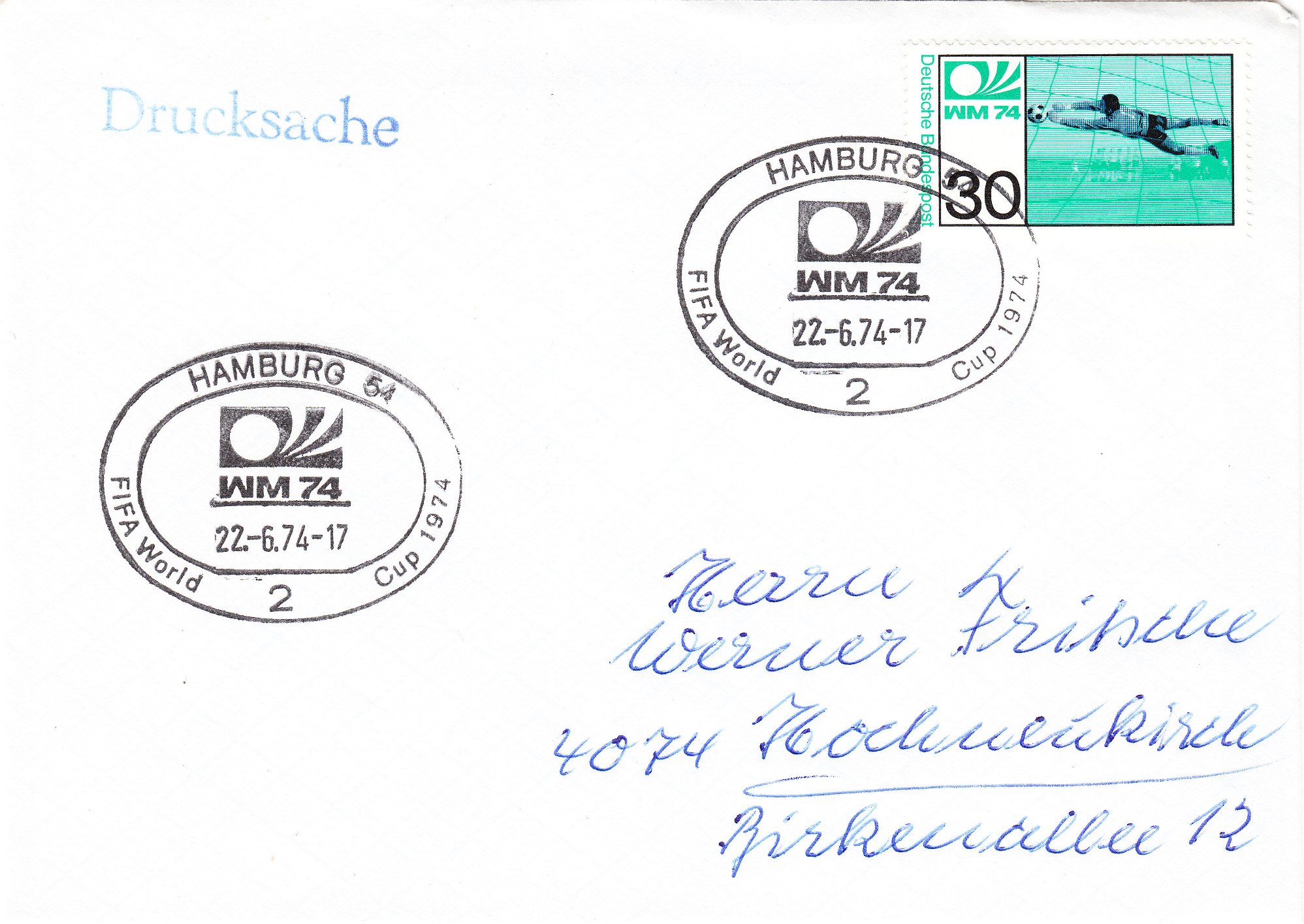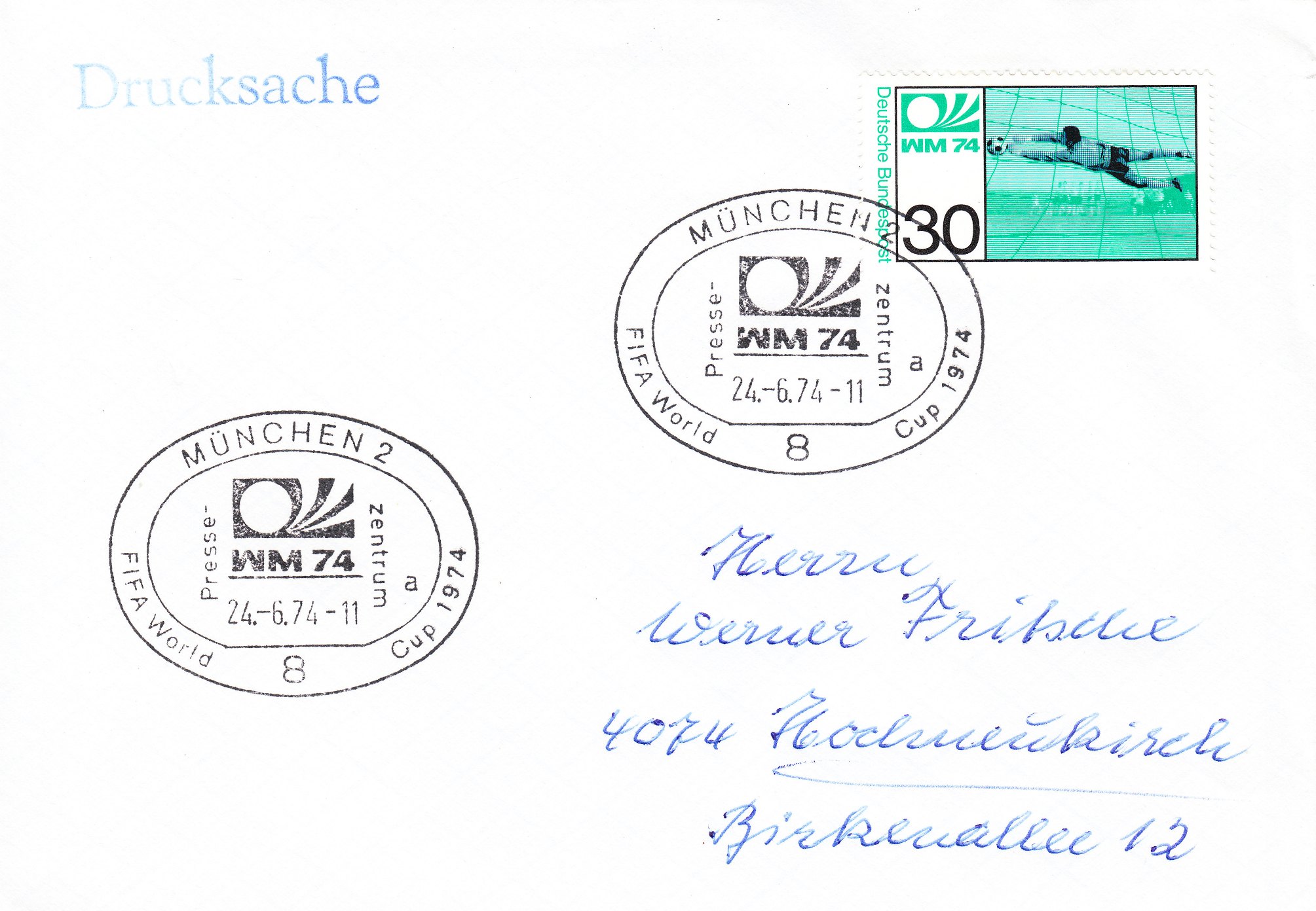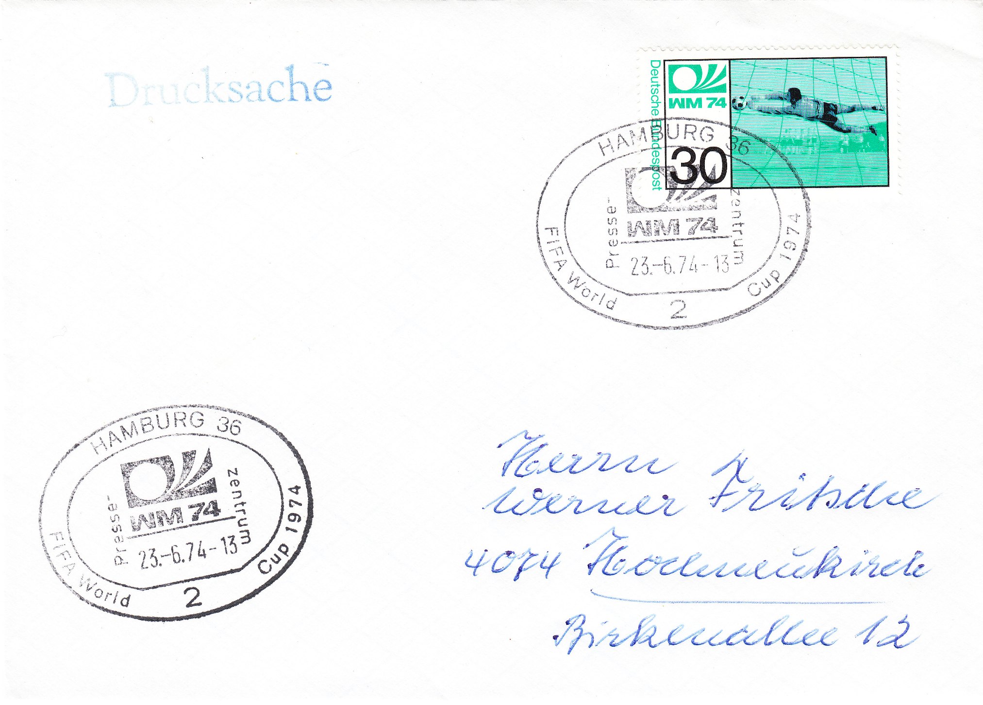 Die beiden Sondermarken der Deutschen Bundespost zur Fußball WM 1974 (MiNr. 811/12) wurden am 15.05.1974 verausgabt, wie dies dieser "offizielle" Ersttagsbrief, der leider nicht echt gelaufen, aber nummeriert "94005" ist, zeigt. Im Stempelbild sind Tip und Tap, die Maskottchen der WM 74 zu sehen: