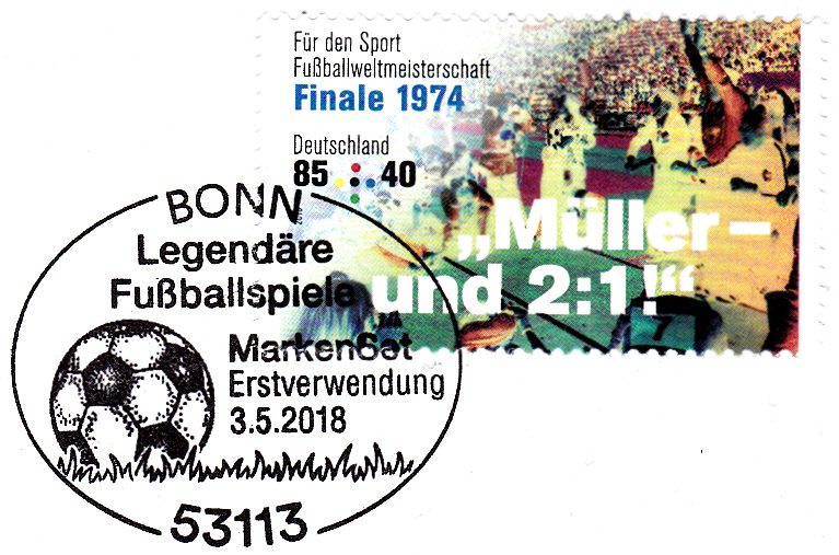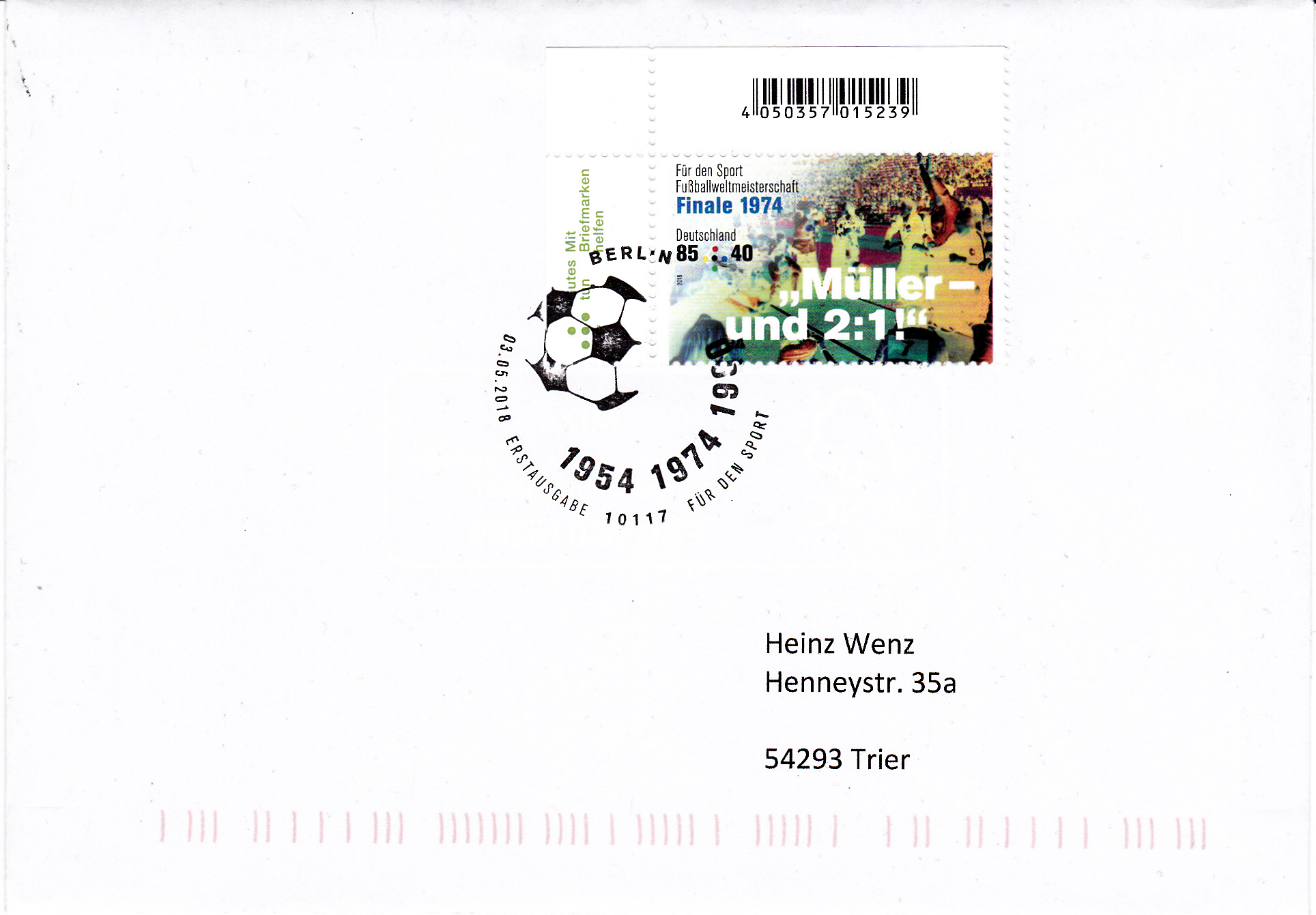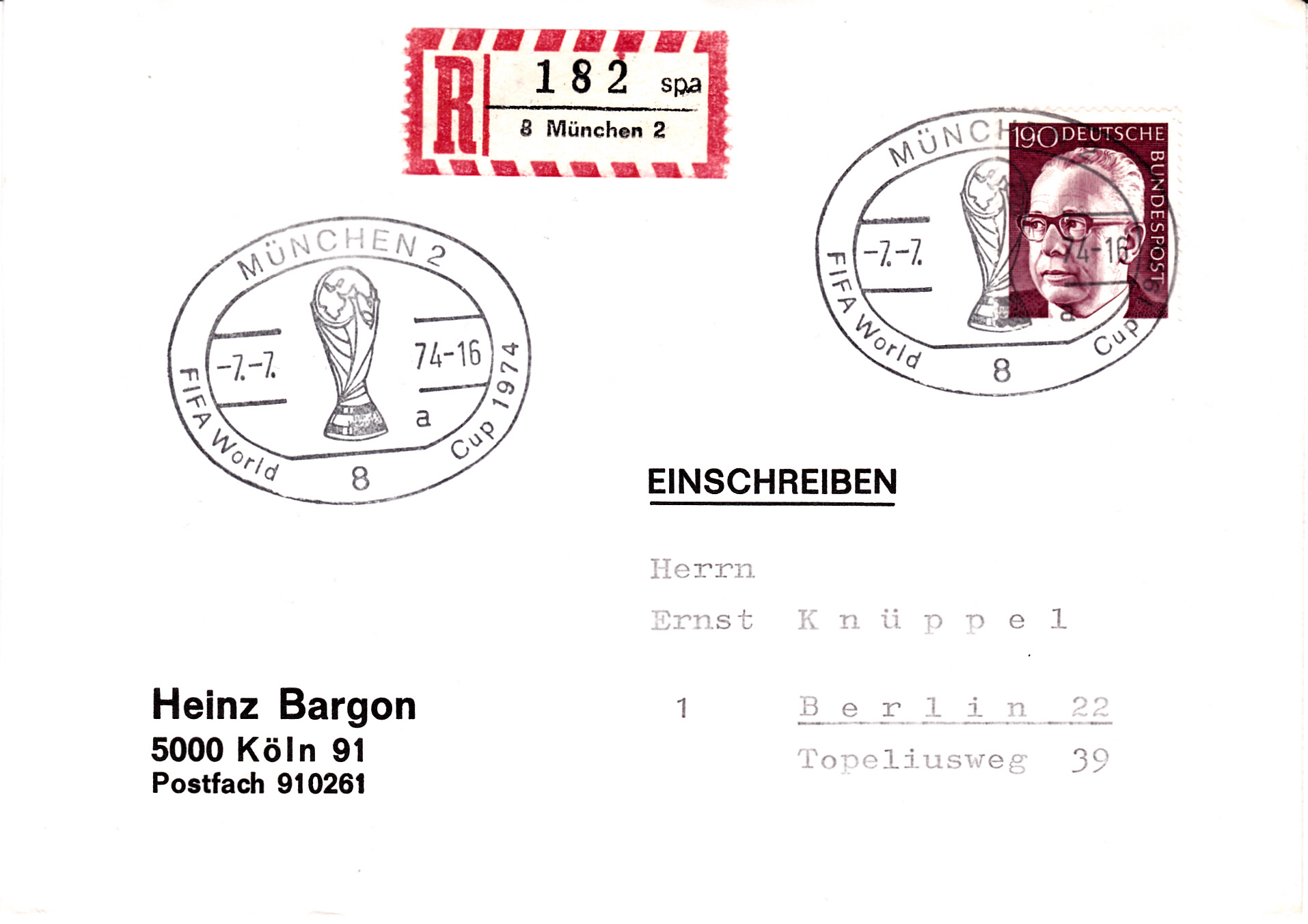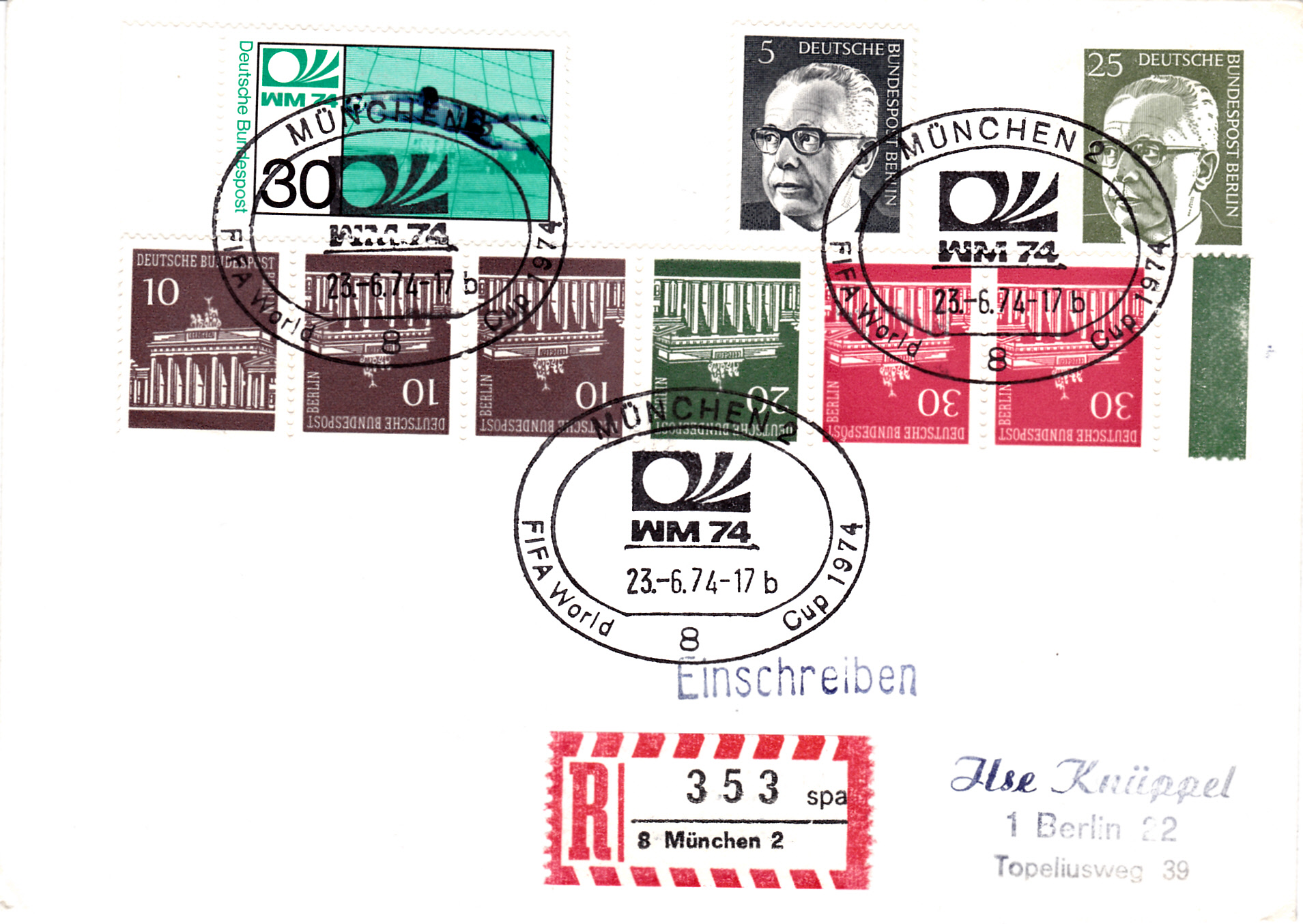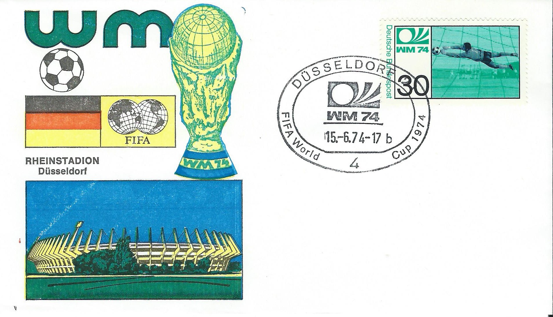 zum Thema Fussball-WM ´74 ist mir ein Beleg in die Hände gefallen, der im Schmuckzudruck den WM-Pokal und das Rheinstadion Düsseldorf zeigt. Die WM-Marke der Bundesrepublik von 1974 zu 30 Pf wurde mit dem passenden Sonderstempel von Düsseldorf am 15.6.74 gestempelt.