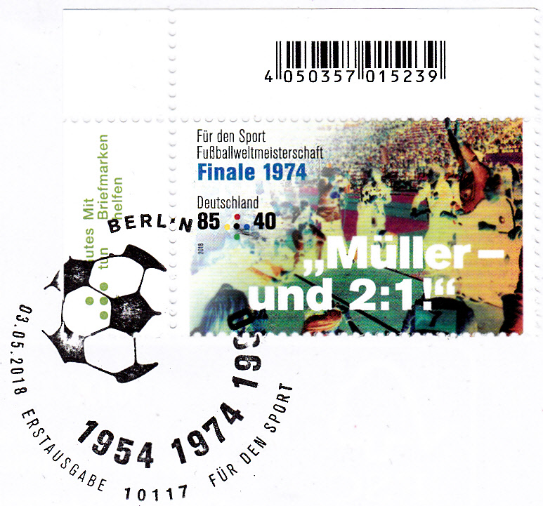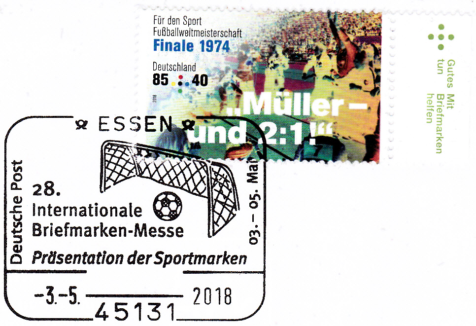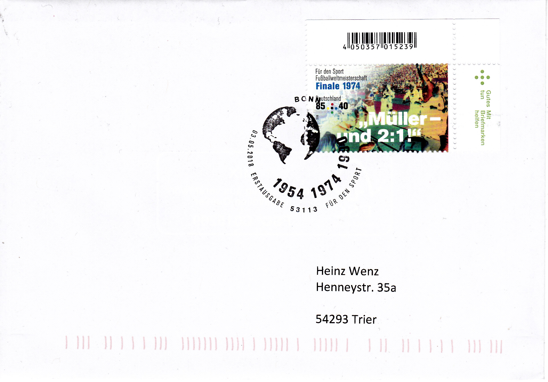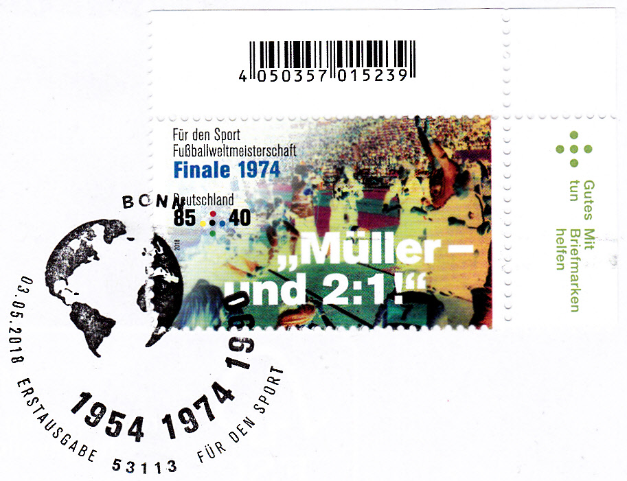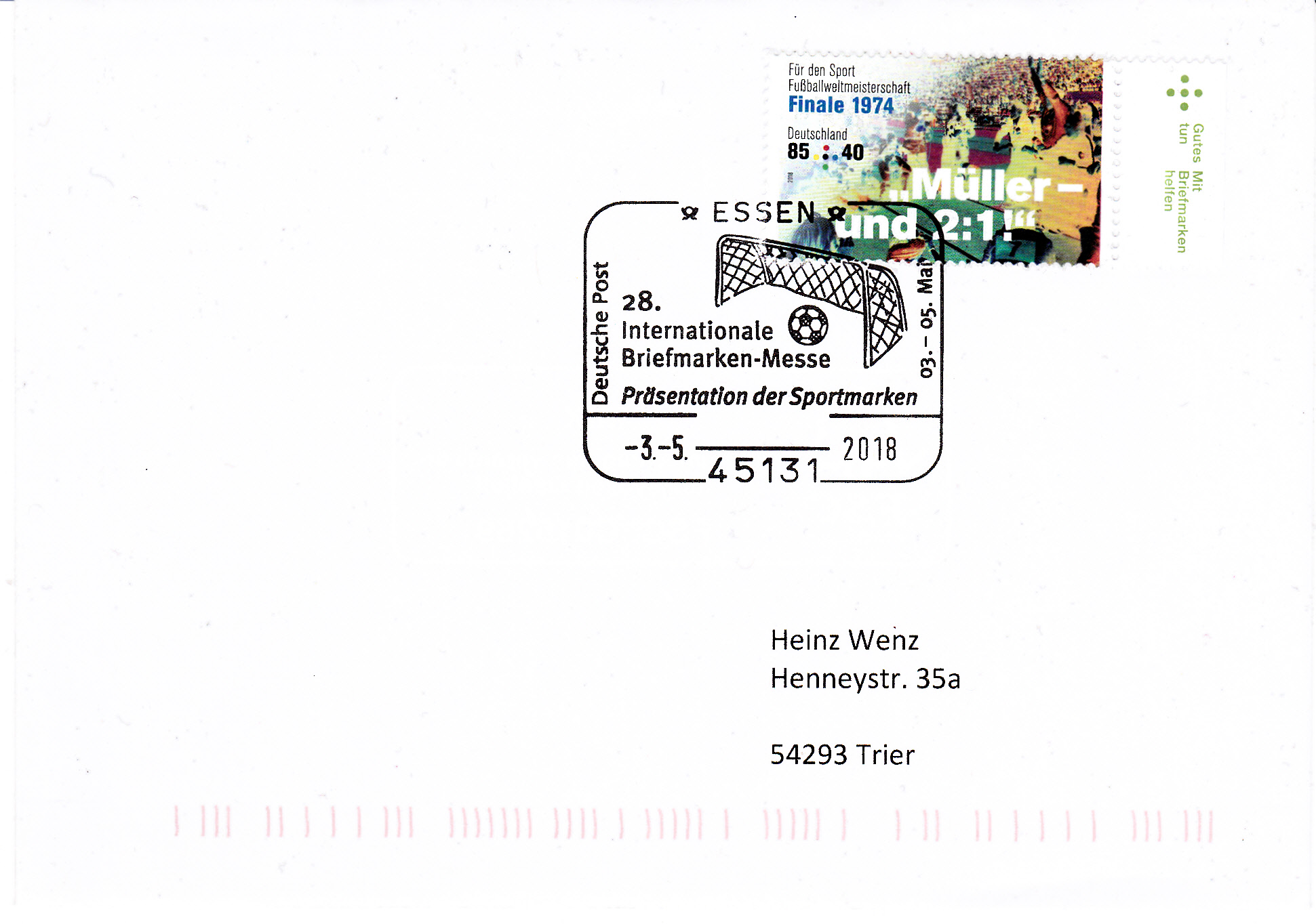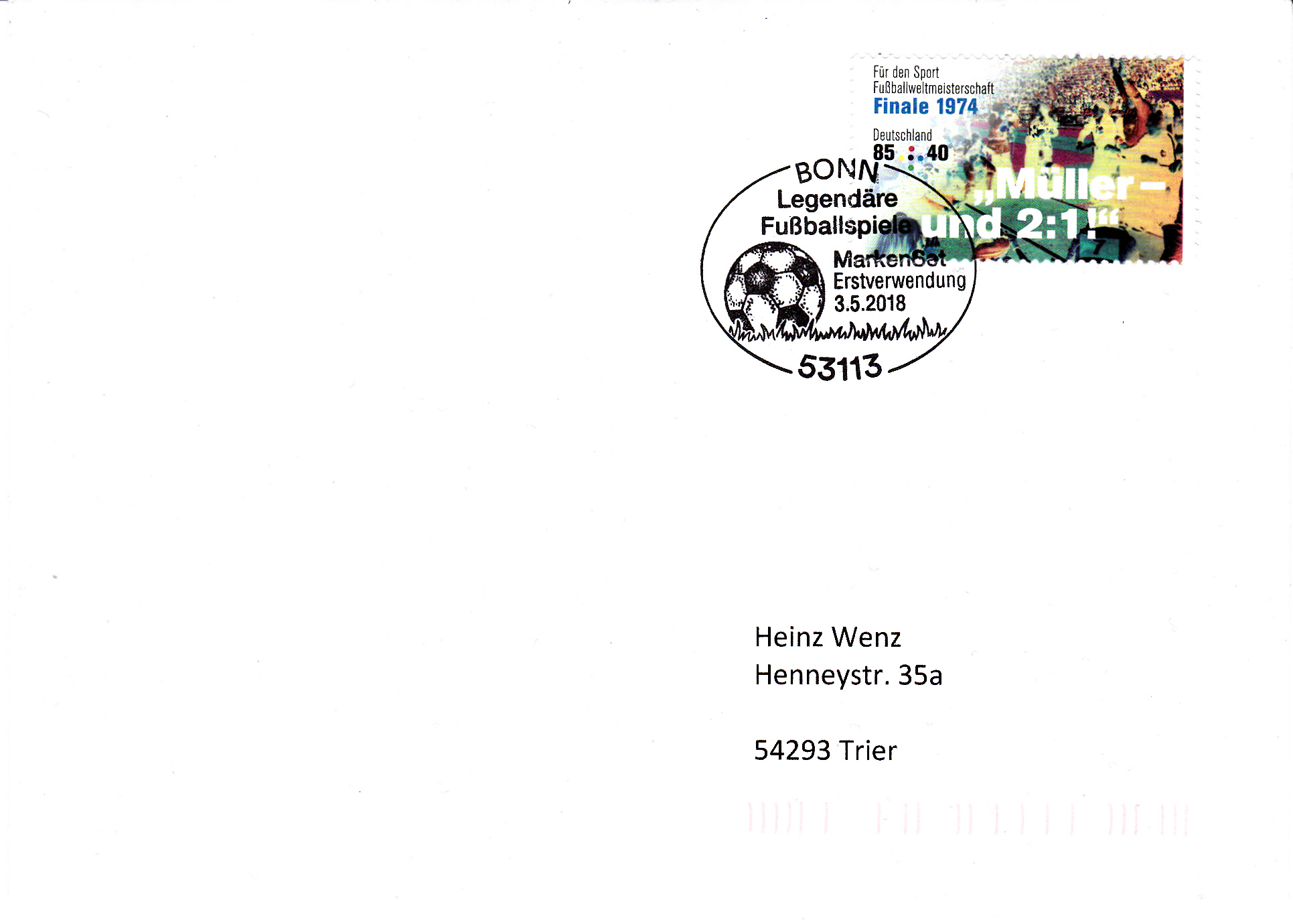 zum Thema Fussball-WM ´74 ist mir ein Beleg in die Hände gefallen, der im Schmuckzudruck den WM-Pokal und das Rheinstadion Düsseldorf zeigt. Die WM-Marke der Bundesrepublik von 1974 zu 30 Pf wurde mit dem passenden Sonderstempel von Düsseldorf am 15.6.74 gestempelt.