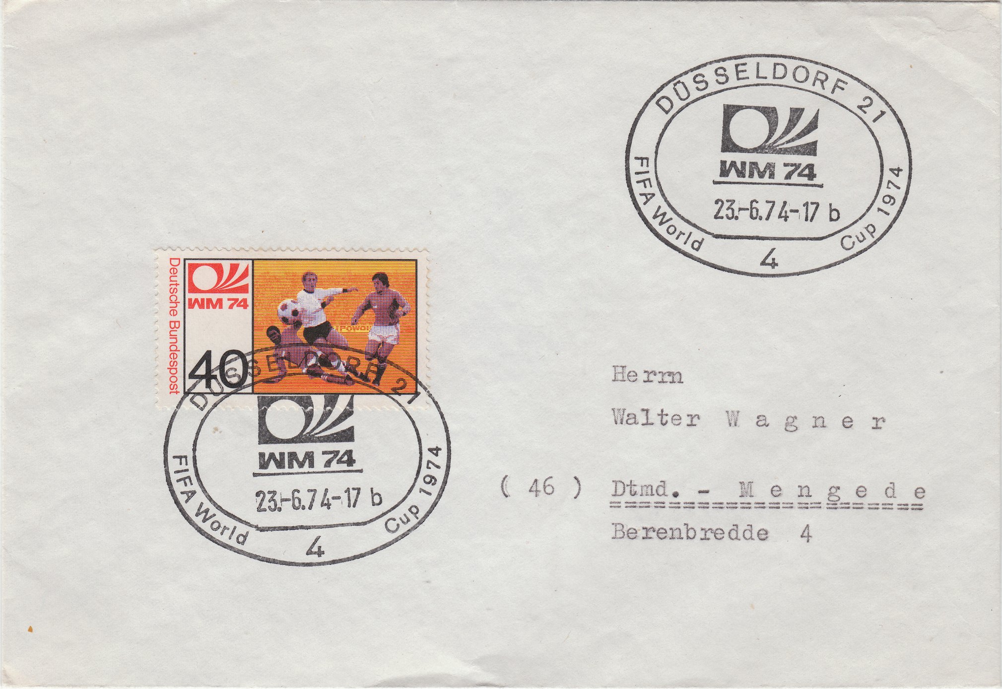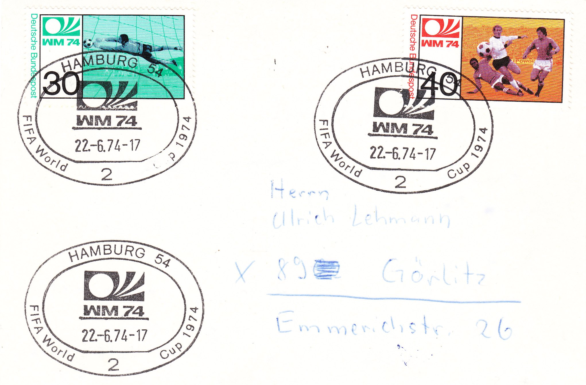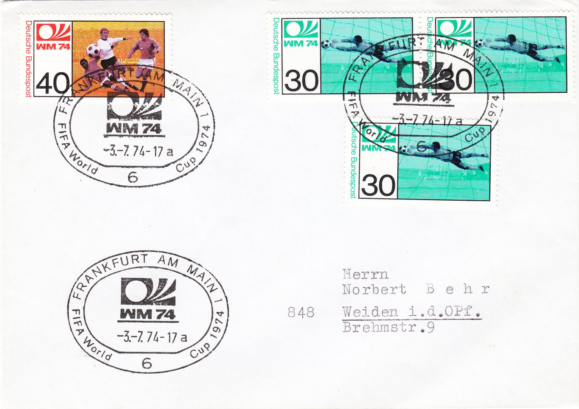 Die beiden Sondermarken der Deutschen Bundespost zur Fußball WM 1974 (MiNr 811/12) wurden am 15.Mai 1974 verausgabt, wie dies die beiden Ersttagsbriefe, die leider nicht echt gelaufen sind, zeigen. Im Stempelbild zu sehen sind die Maskottchen der WM 74, Tip und Tap.