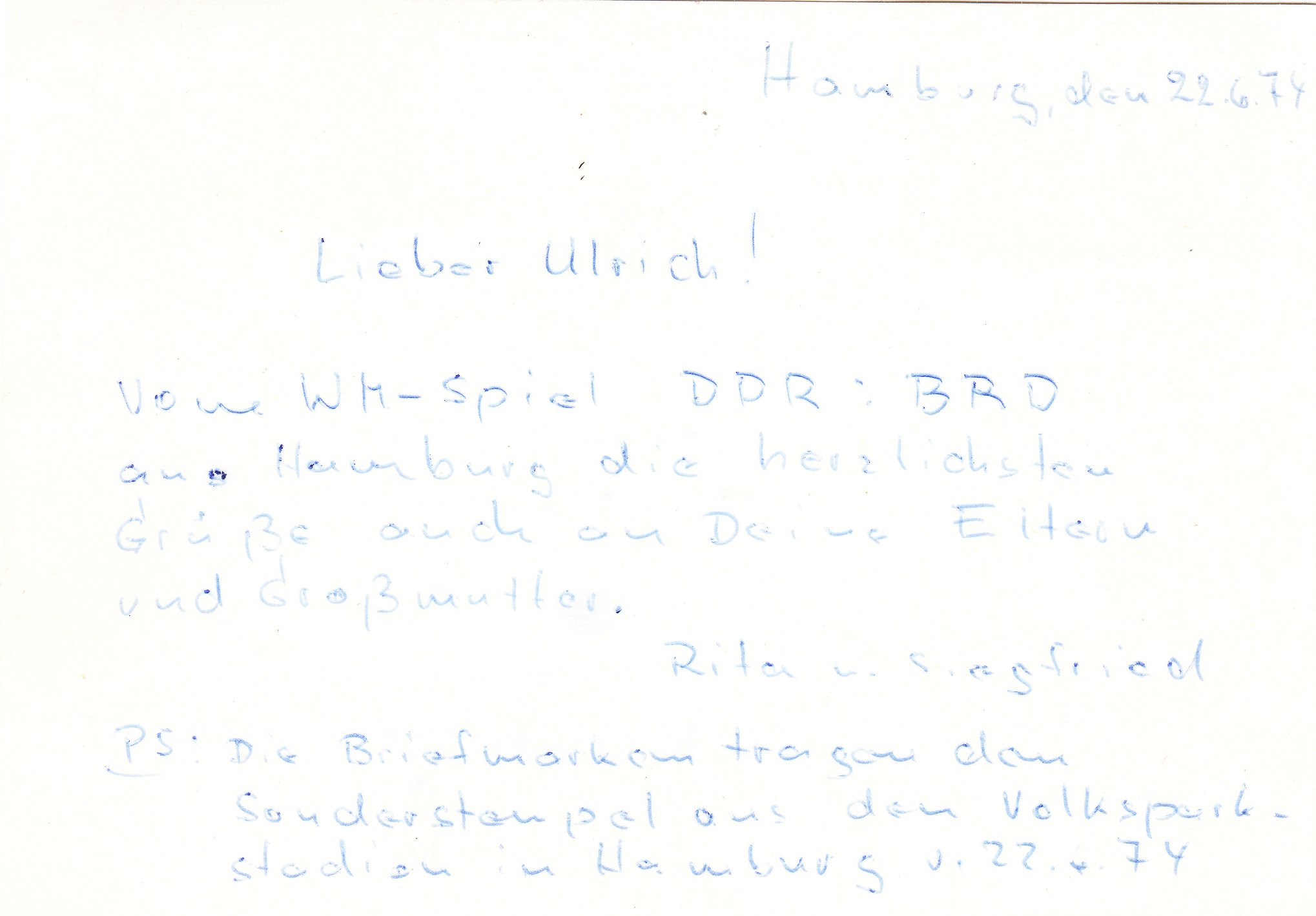 Diese Postkarte wurde am 22.06.1974 an einen DDR-Bürger geschrieben und als Satzbrief frankiert um 17 Uhr aufgegeben: