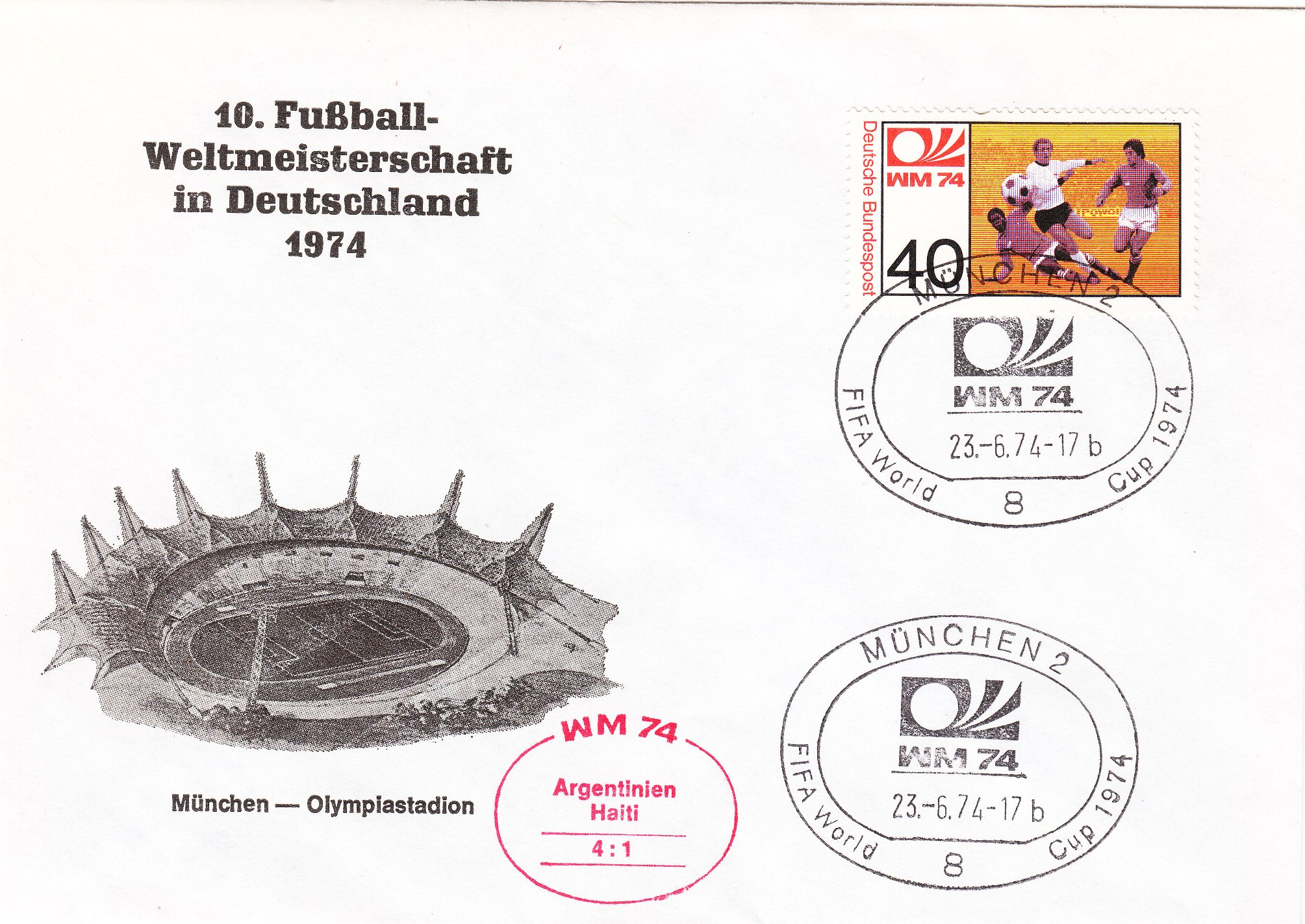 In der Gruppe IV trafen am 23.06.1974 im Olympiastadion in München die Nationalmannschaften von Argentinien und Haiti aufeinander, was dieser Beleg dokumentiert: