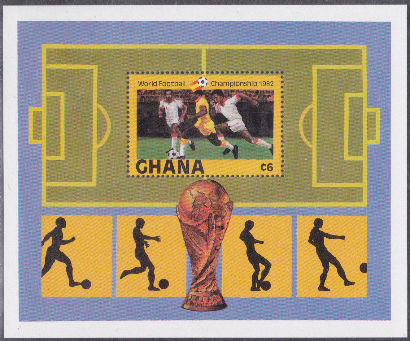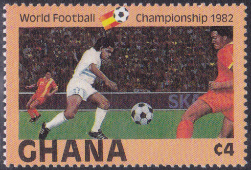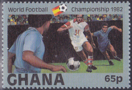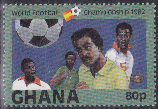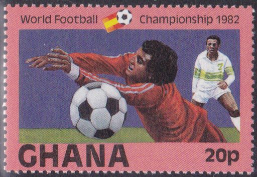 Aus Ghana kommt diese Marke (MiNr 945) zur Fußball-Weltmeisterschaft 1982 in Spanien mit einem Torwart bei einer nicht erfolgreichen Parade.