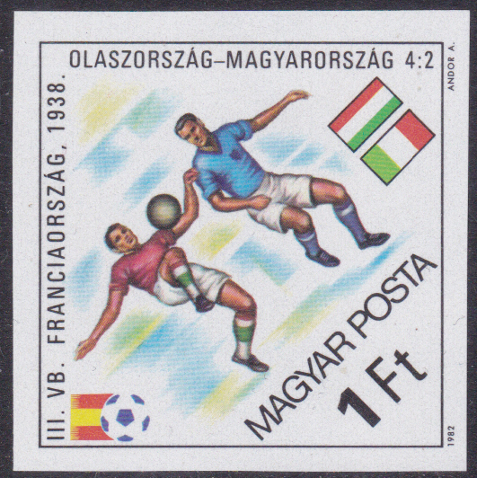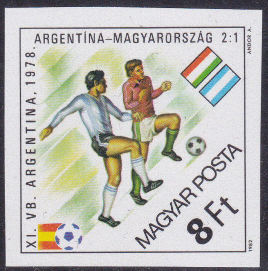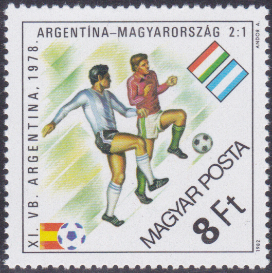 Diese Marke zu 8 Forint (MiNr 3544 A) zeigt ein Bild zum Spiel Argentinien - Ungarn bei der WM 1978.