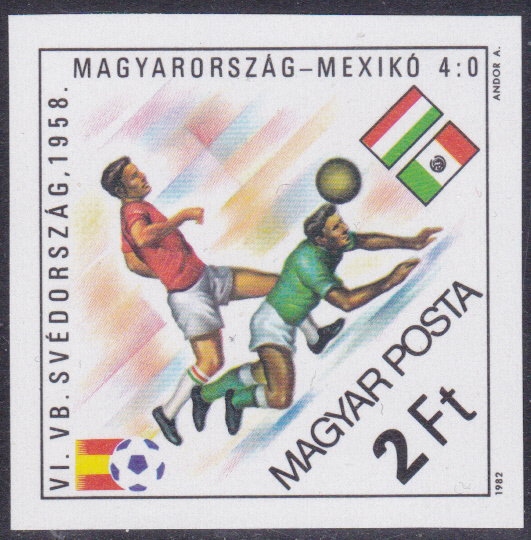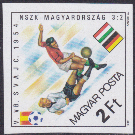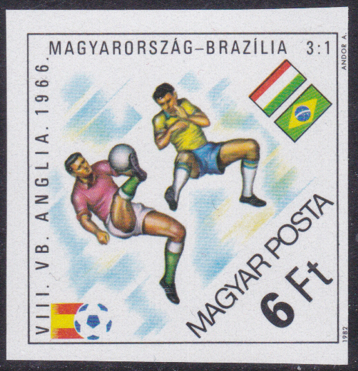 Ergänzend zu den hier bereits gezeigten fünf Marken aus Ungarn zeige heute die bisher noch fehlenden Marken. Zuerst die Marke 6 Forint (MiNr 3543 A), die an das Spoel Ungarn - Brasilien bei der WM 1966 erinnert.