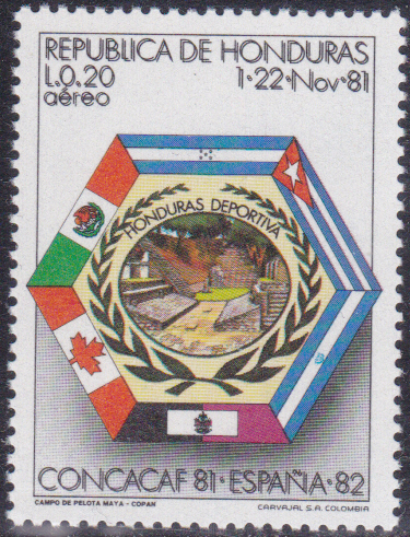 Auf der Marke zu 0,20 Lempira (MiNr 981) wird auch noch der Ballspielplatz in Copan gezeigt.