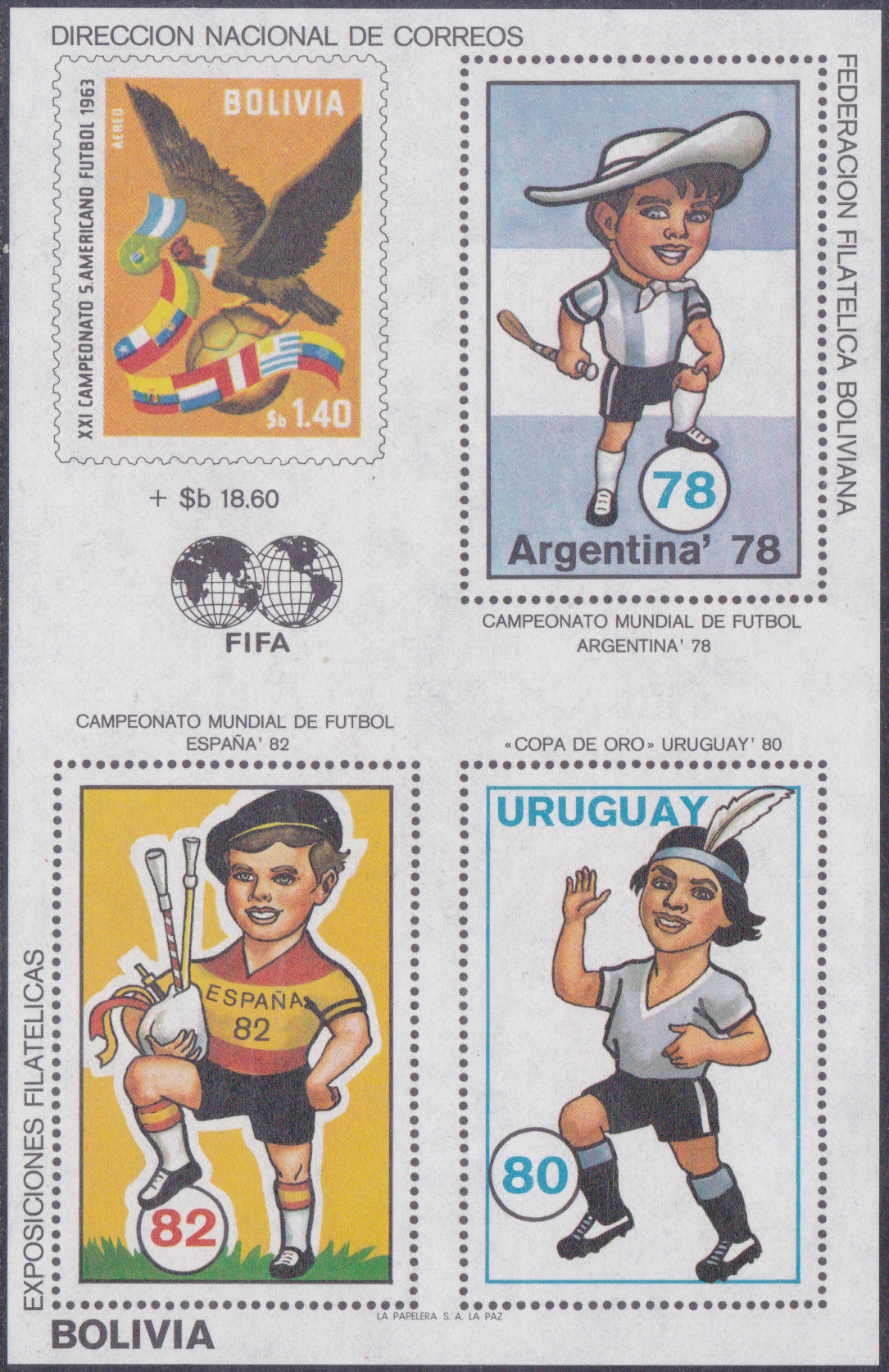 Zur Fußball-Weltmeisterschaft Spanien 1982 erschien 1980 in Bolivien ein Block (MiNr Block 98 mit Marke 694 B). Die Marke (links oben) war bereits 1963 zur 21. südamerikanische Fußballmeisterschaft erschienen und wurde hier "wiederverwendet". Der Block weist auf den Markenähnlichen Abbildungen auch auf die Fußball-Weltmeisterschaft in Argentinien 1978 den Gold-Cup in Uruguay 1980 hin.
