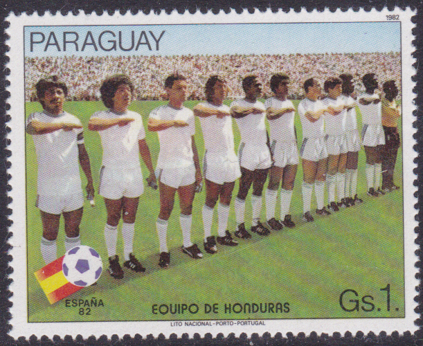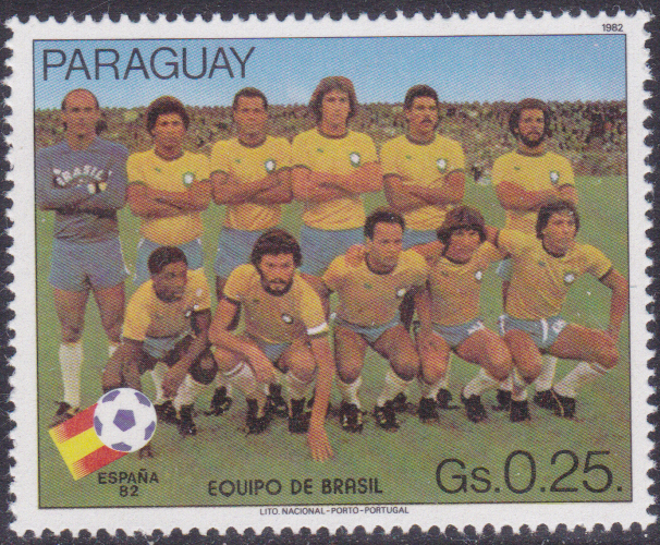 In Paraguay sind mehrerer Serien zur Fußball-Weltmeisterschaft 1982 in Spanien erschienen. Auf den Marken einer Serie sind Mannschaften einiger Lander abgebildet. Ich beginne mit dieser Marke (MiNr 3528), die die Mannschaft von Brasilien abbildet.