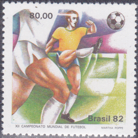 Zur Fußball-Weltmeisterschaft 1982 in Spanien erschien in Brasilkien diese Marke (MiNr 1873) mit zwei Spielern beim Kampf um den Ball.