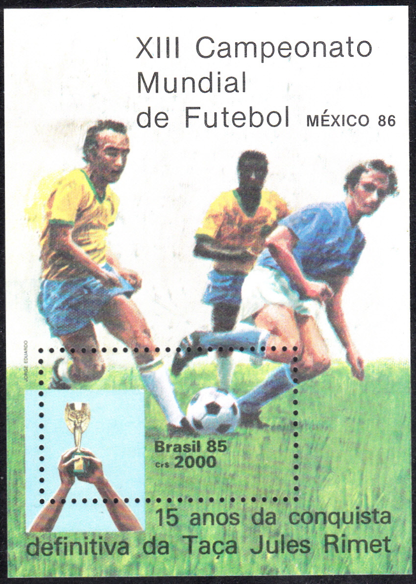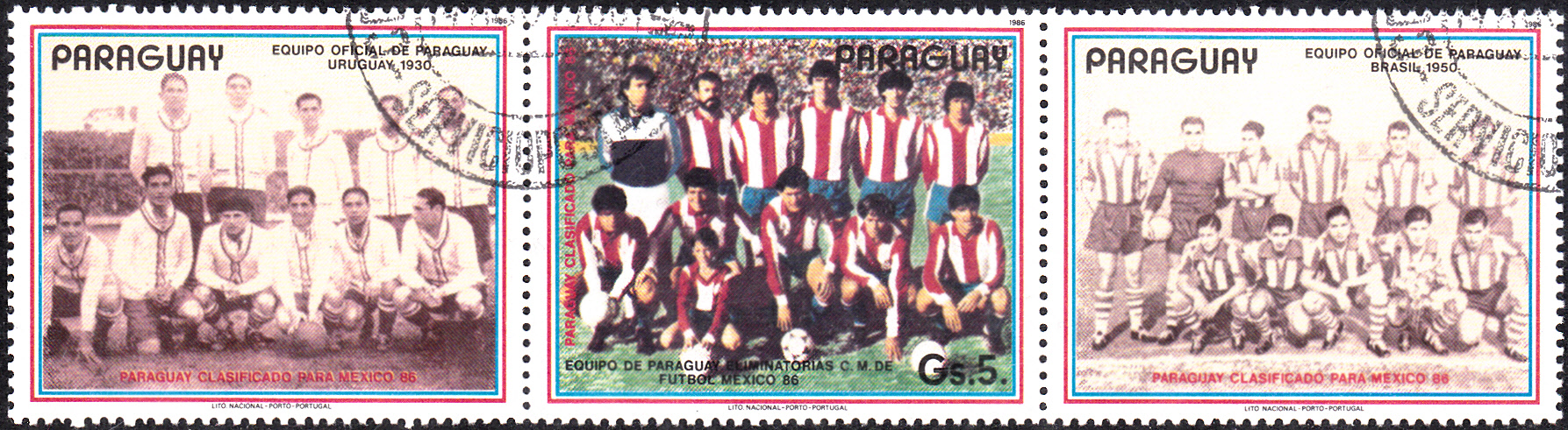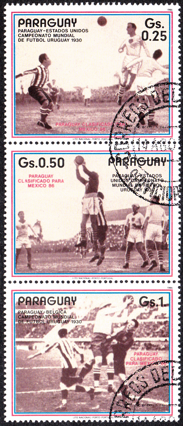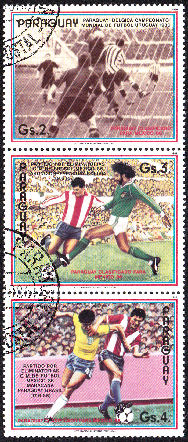 Die letzte Marke (MiNr 3982) aus dieser Serie zeigt im Markenbild die Mannschaft, die sich für die WM 1986 in Mexico qualifiziert hat. Die Marke erschien in einem Kleinbogen mit fünf Marken und vier Zierfeldern. Hier ein Dreierstreifen mit der Marke und zwei Zierfeldern, die die Mannschaften Paraguays bei der WM 1930 und 1950 zeigt.