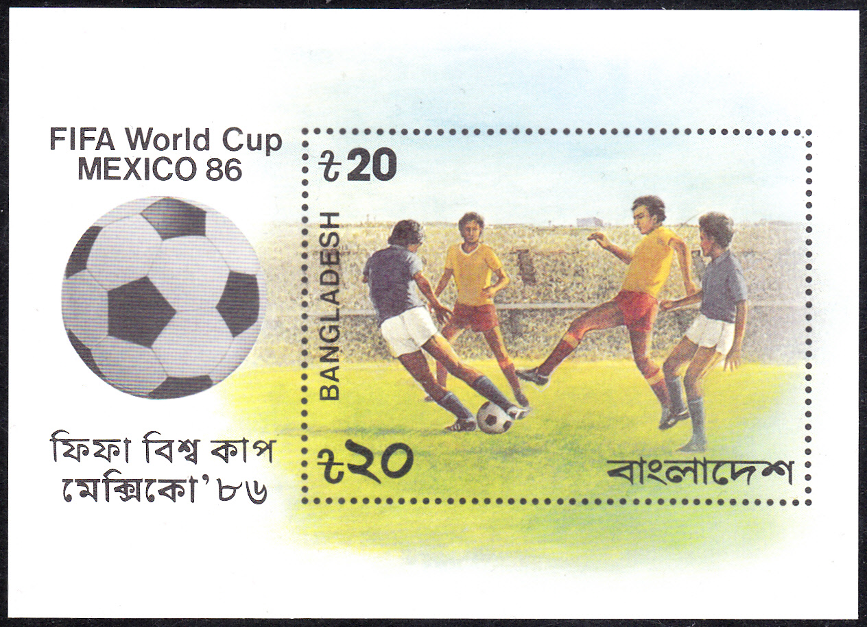 Es gab auch in Bangladesch noch einen Block zur WM 1986 (MiNr Block 13 mit Marke MiNr 249). Auf der Marke wird eine Spielszene dargestellt und auf dem Blockrand wird ein Ball gezeigt.