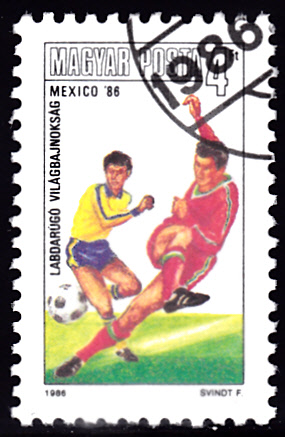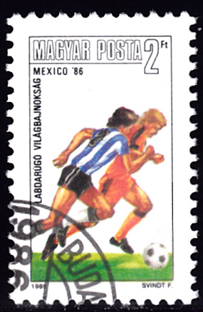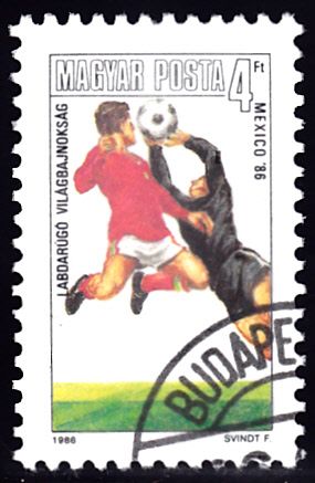 Diese Marke zu 4 Forint (MiNr 3816 A) zeigt wohl eine Spielszene mit einem zu spät kommenden Abwehrspieler, der einen möglichen Torschuss nicht verhindern kann.