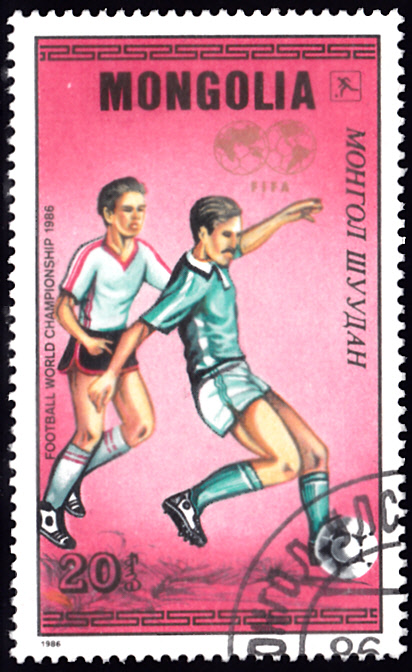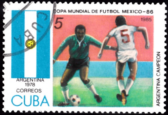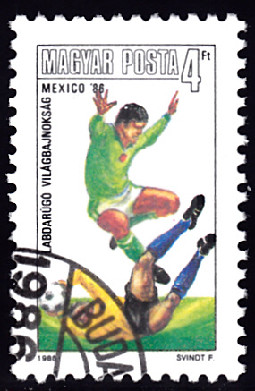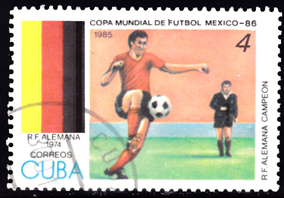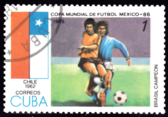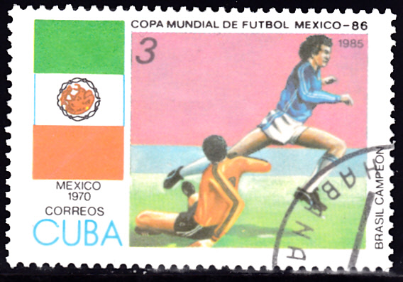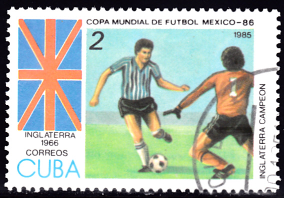 In Kuba ist zur Fußball-Weltmeisterschaft 1986 in Mexiko bereits 1985 eine Serie mit Szenen aus verschiedenen früheren Endspielen erschienen. Aus dieser Serie kann ich hier eine Marke (MiNr 2912) mit einer Spielszene aus dem Endspiel bei der WM 1966 zeigen.
