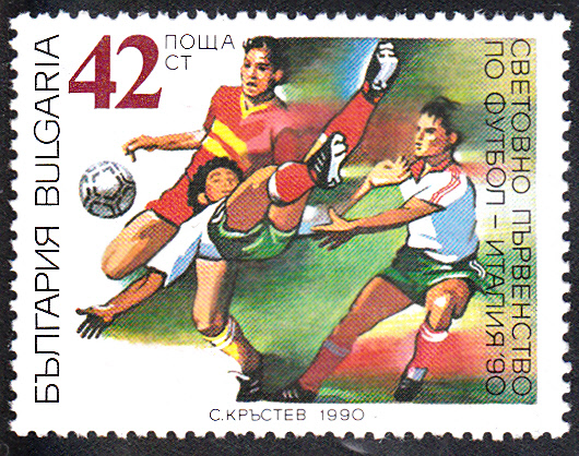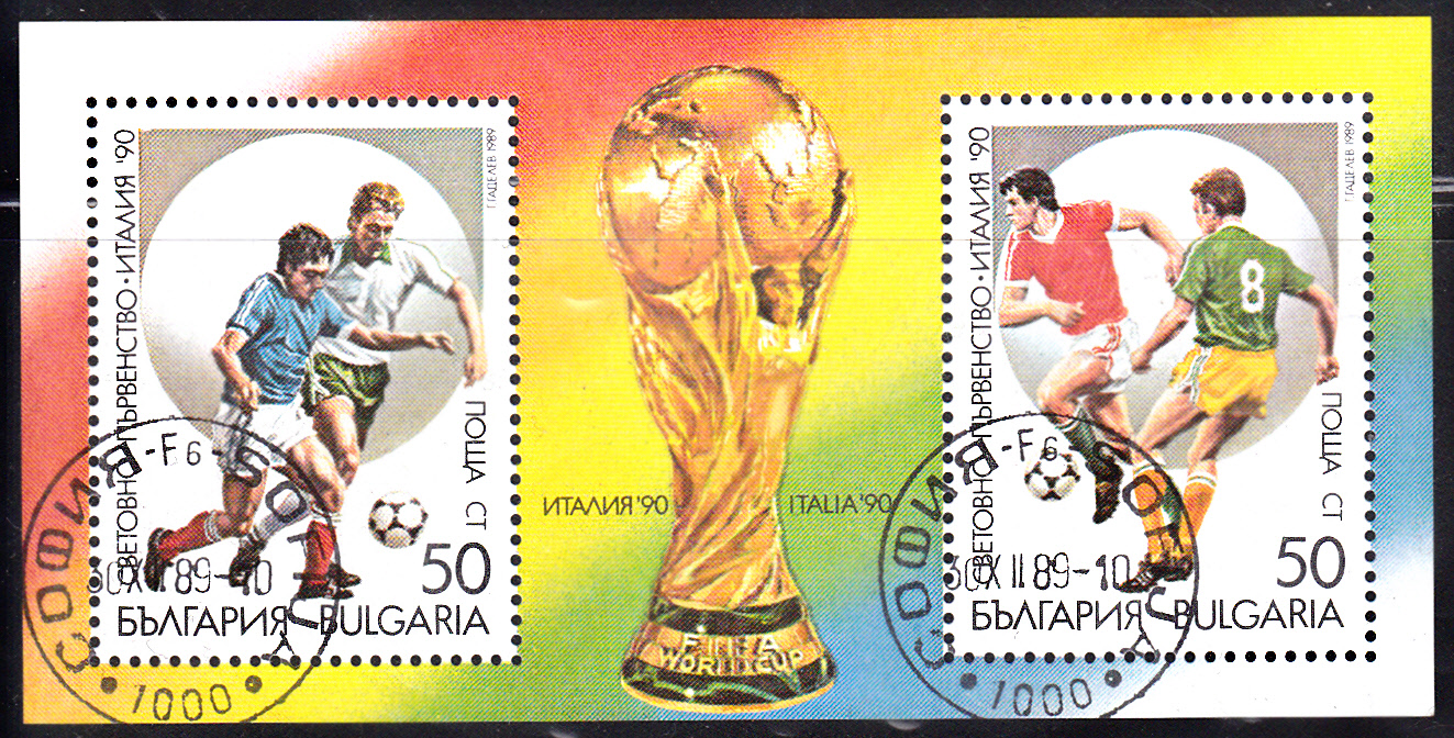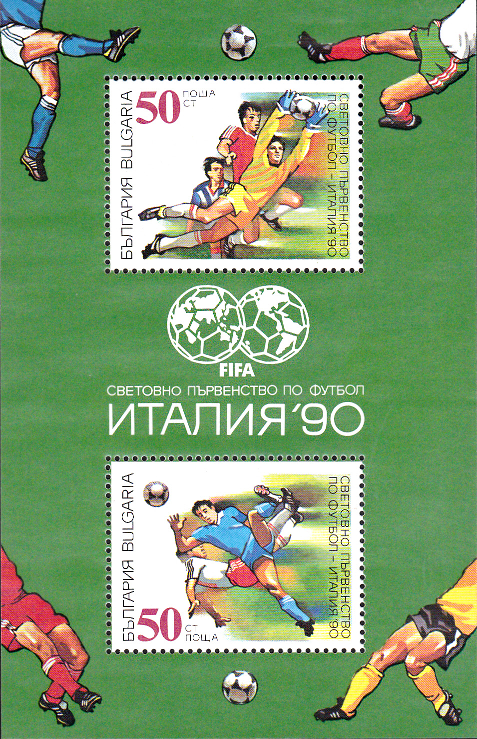 Zur Fußballweltmeisterschaft 1990 in Italien (8. Juni - 8. Juli 1990) erschien in Bulgarien unter anderem auch dieser Block (MiNr Bl. 209 B), den es auch gezähnt gibt.