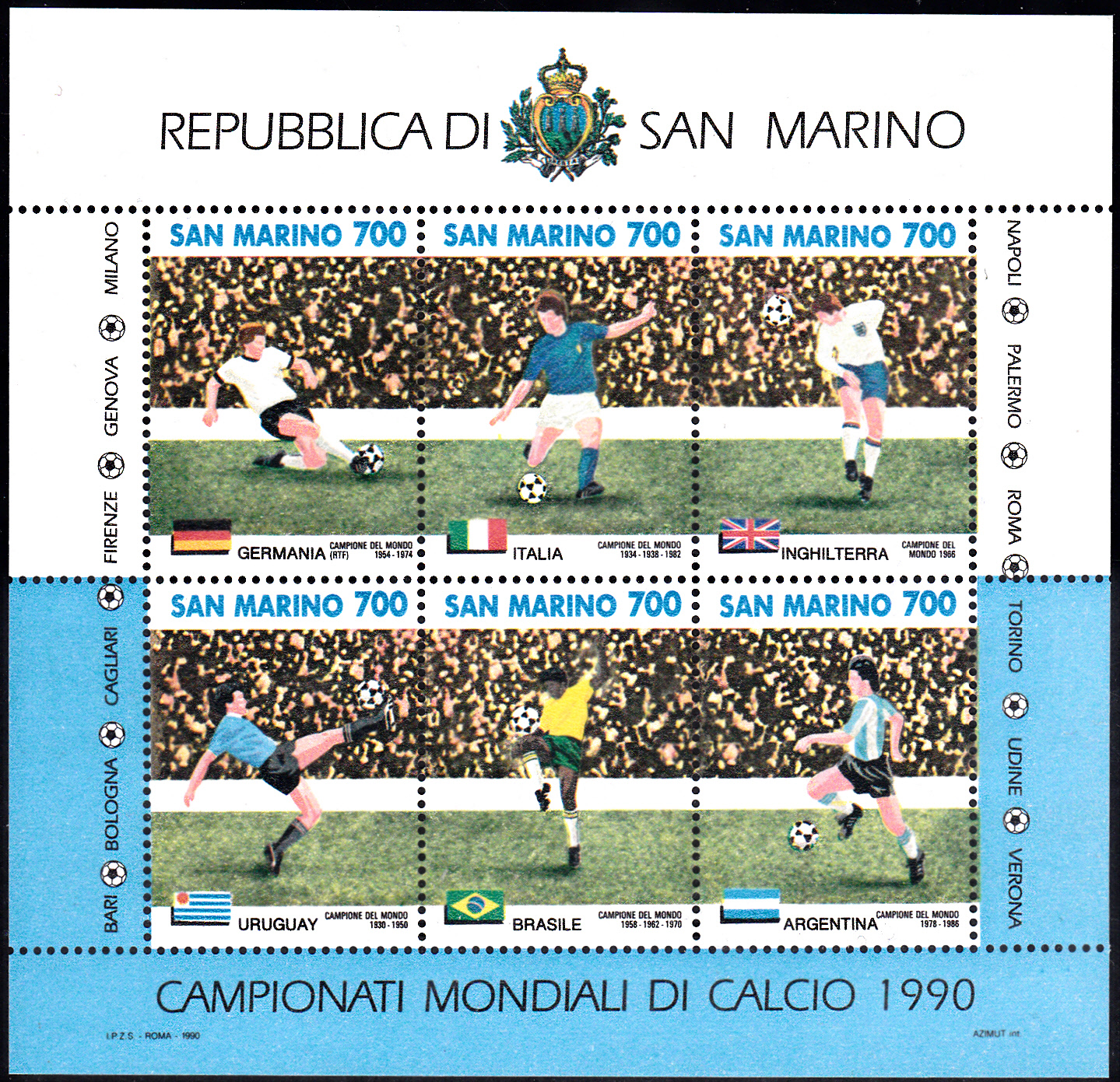 Zu den Weltmeisterschaften 1990 erschien in San Marino ein Block mit sechs Marken zu je 700 Lire. Auf jeder der Blockmarken ist jeweils ein Spieler einer der bisherigen Weltmeisternationen abgebildet: