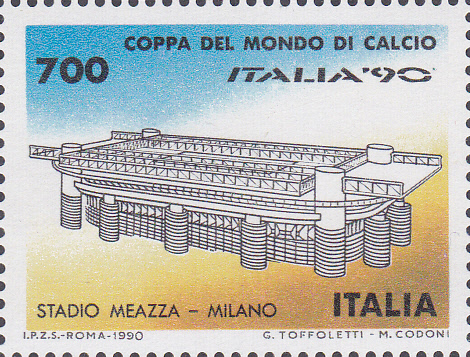 Diese Marke aus Italien (MiNr 2126) bildet das Giuseppe-Meazza-Stadion in Mailand ab.