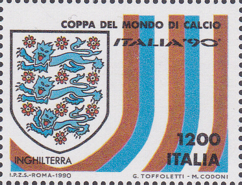 Auf dieser Marke aus Italien (MiNr 2135) wird das Verbandsemblem des englischen Fußballverbandes gezeigt.