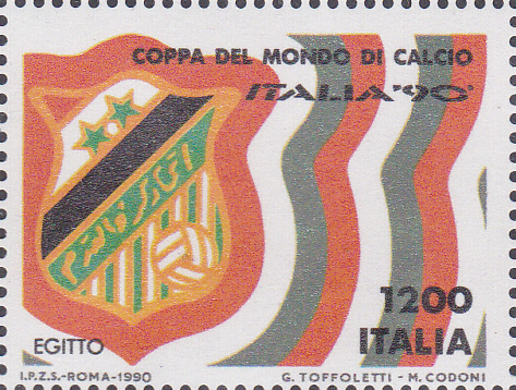 Diese Marke aus Italien (MiNr 2140) zeigt das Verbandsemblem des Fußballverbandes aus Ägypten.
