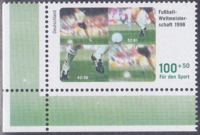 Eckrandstück der Marke zur Fußball-WM 1998 der Deutschen Post aus der Serie "Für den Sport" (MiNr 1968).