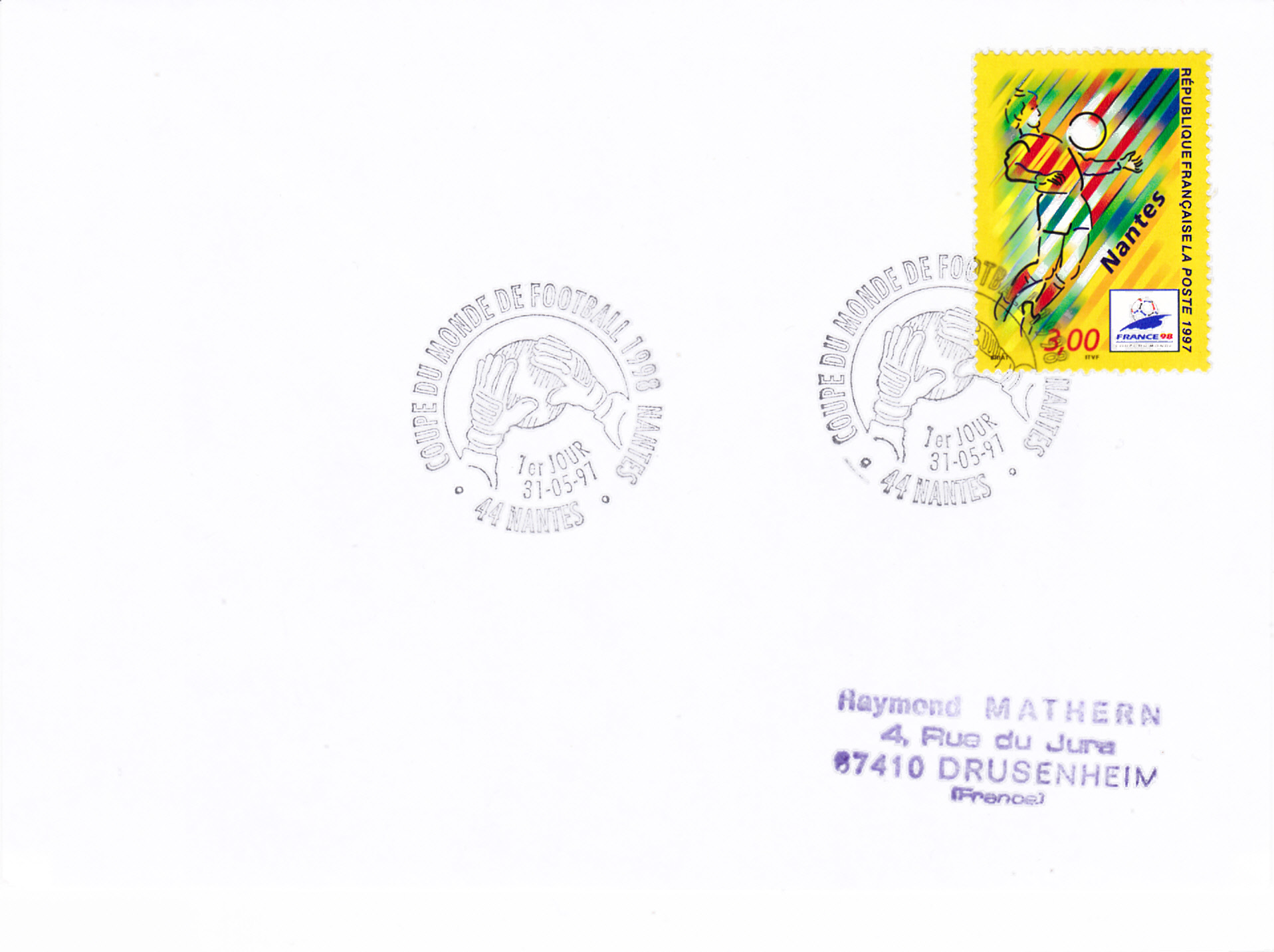 Auf diesem Brief vom Ersttag wurde die Marke mit dem Ersttagsonderstempel aus Nantes entwertet.