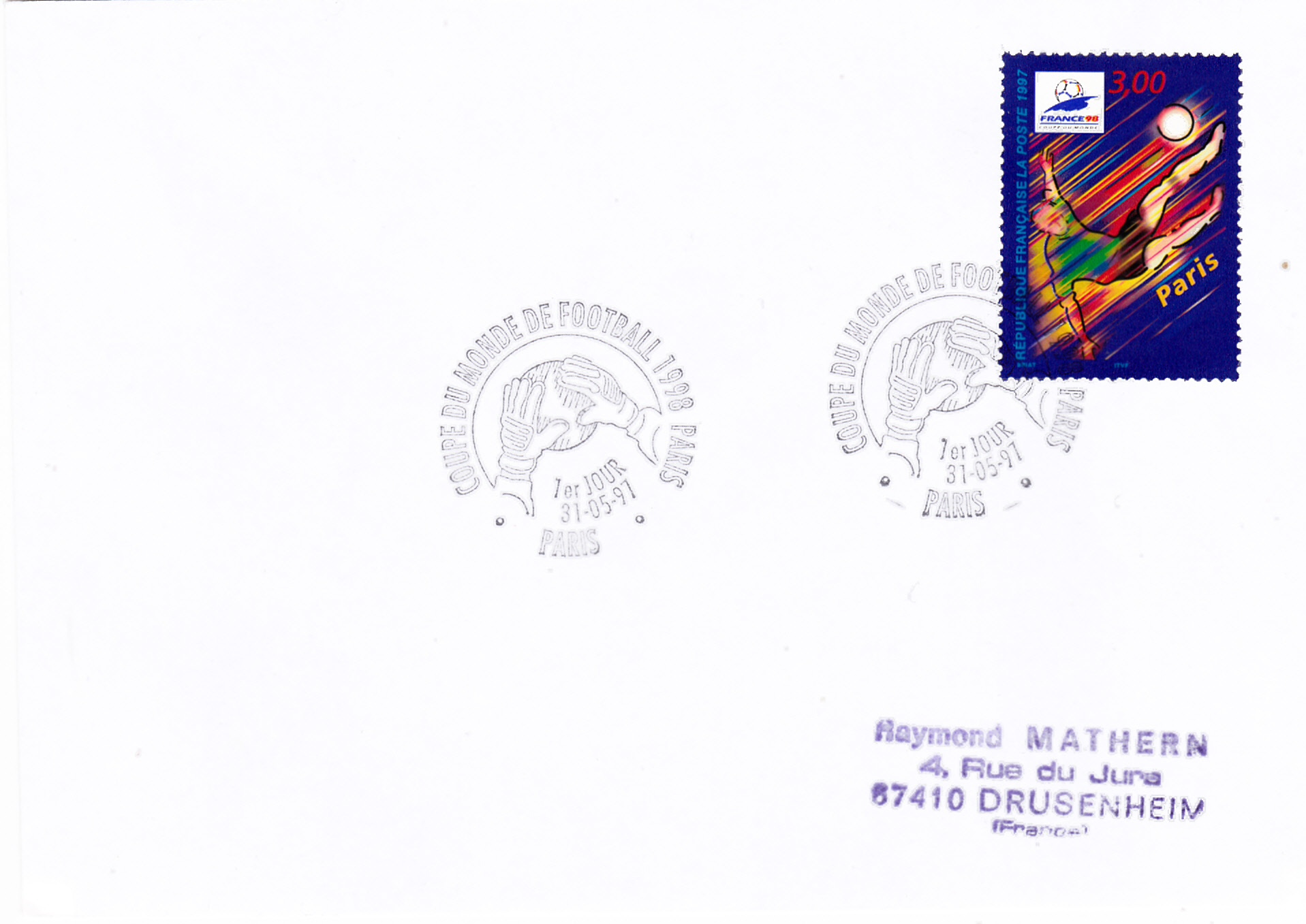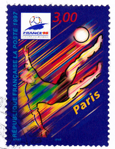 Ich kann von dieser Serie hier noch eine dritte Marke (MInR 3221) mit einem Spieler bei einem Fallrückzieher zeigen. Auf der Marke wird der Spielort Paris dokumentiert.