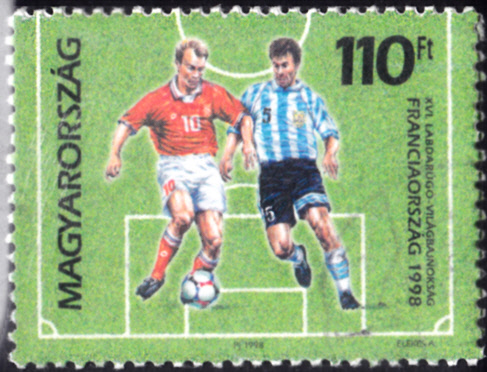 In Ungarn sind zur WM 1998 zwei Marken als Zusammendruck erschienen. Die untere Marke (MiNr 4507) des Zusammendruckes kann ich hier zeigen. Auf der fehlenden oberen Marke sind ebenfalls zwei Spiele vor dem Rest des Spielfeldes zu sehen.
