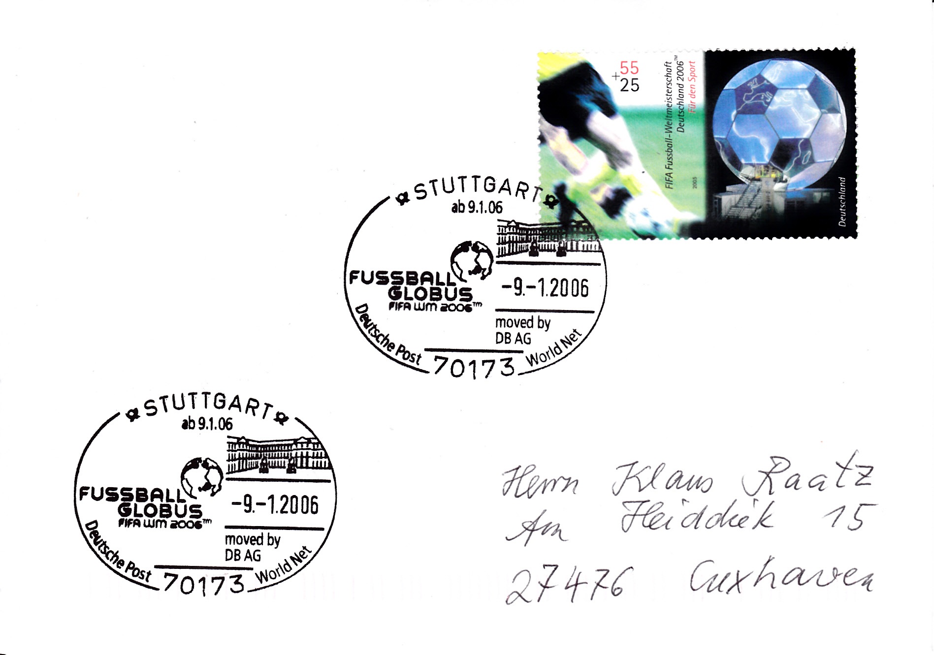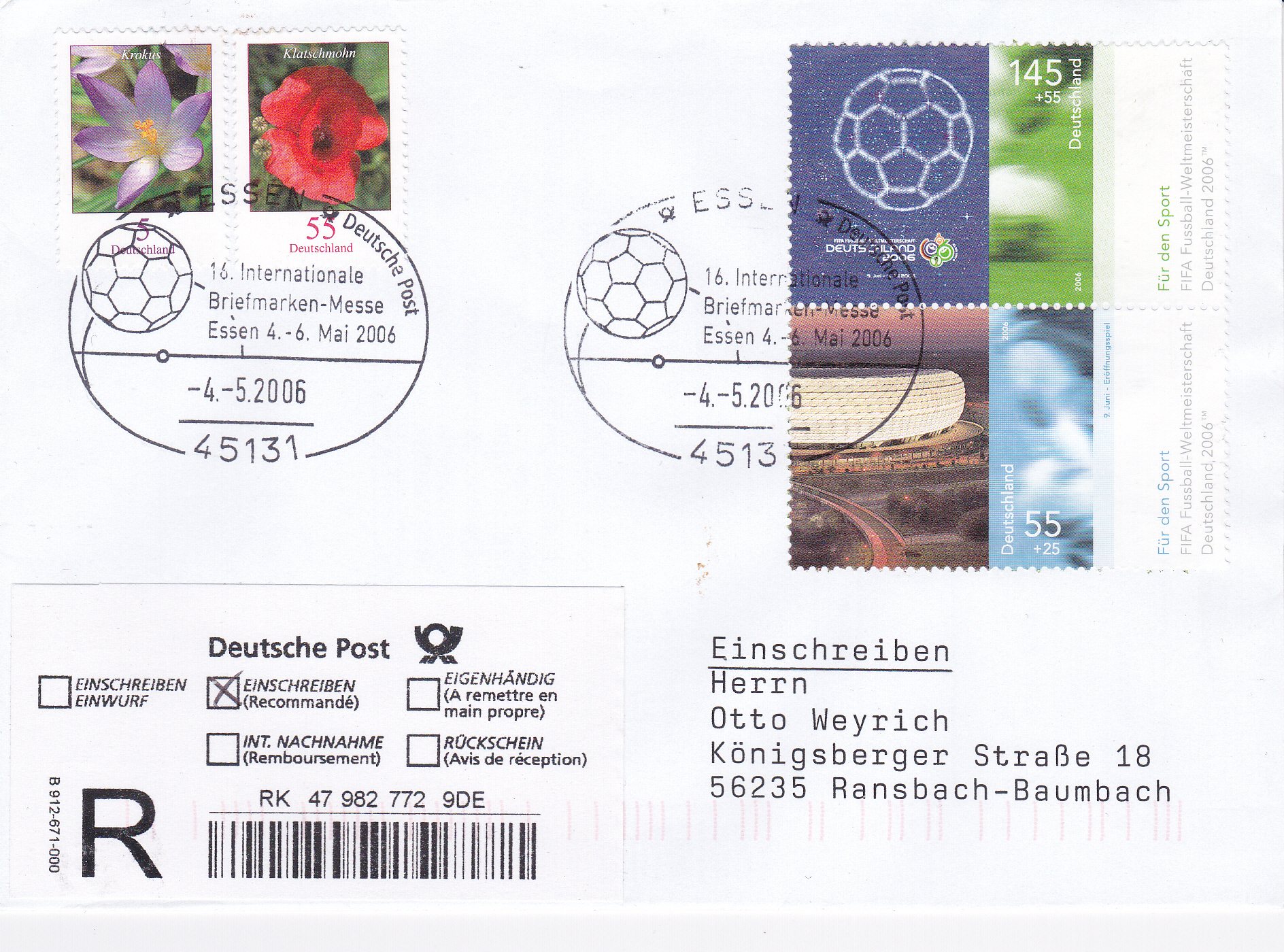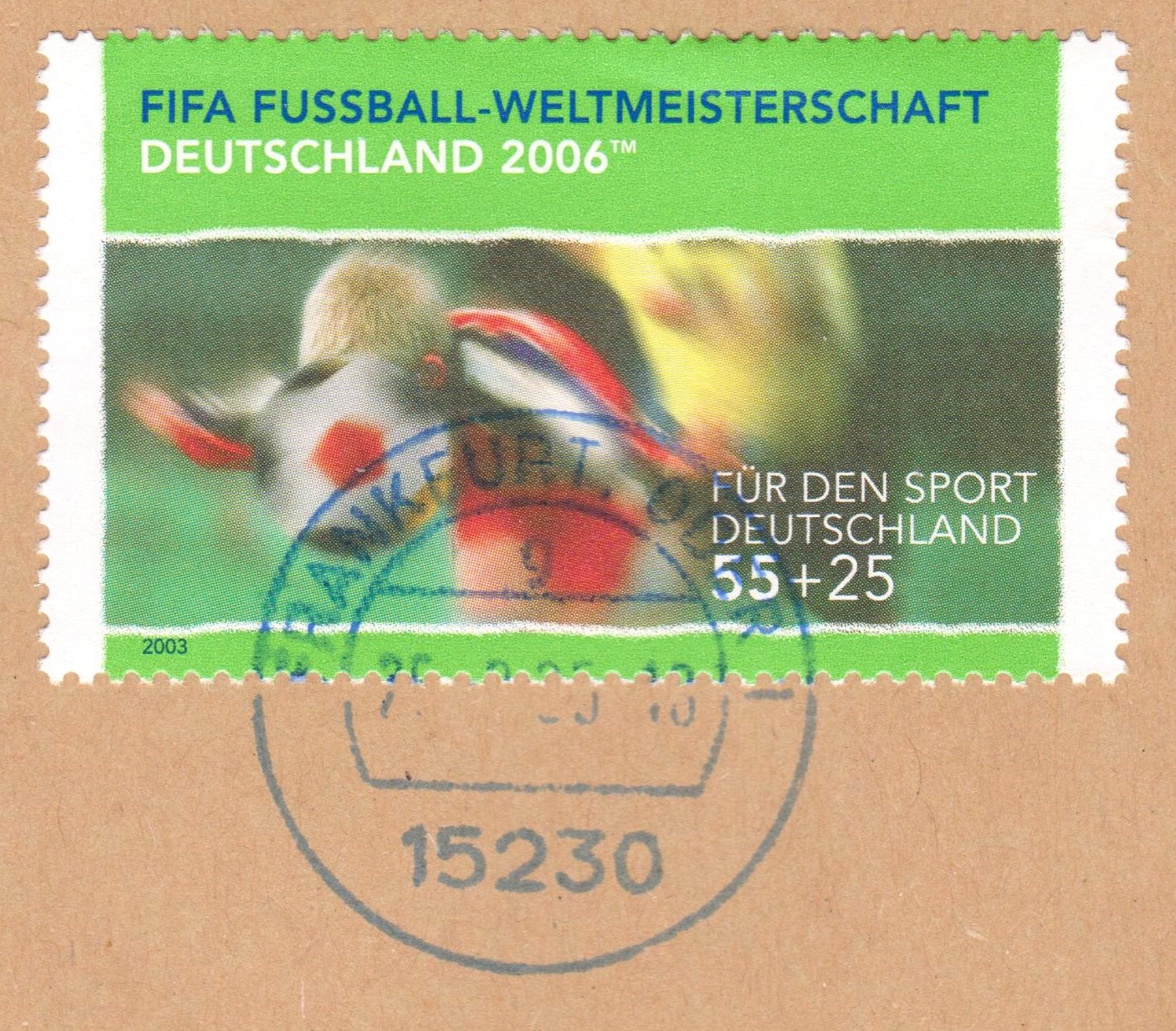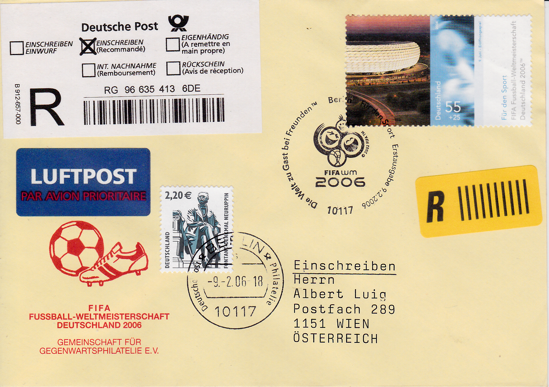Einschreibebrief nach Österreich frankiert mit der Marke zu 55+25 Cent (MiNr 2518) zur WM 2006 mit der Abbildung der Allianz-Arena München und einer Marke zu 2,20€ der DS "Sehenswürdigkeiten" (MiNr 2307). Die Marke zur WM 2006 wurde mit dem Ersttagsonderstempel aus Berlin gestempelt, die Zusatzfrankatur mit einem Tagesstempel der Stempelstelle Berlin. In Österreich erhielt der Brief noch einen gelben "R-Zettel".