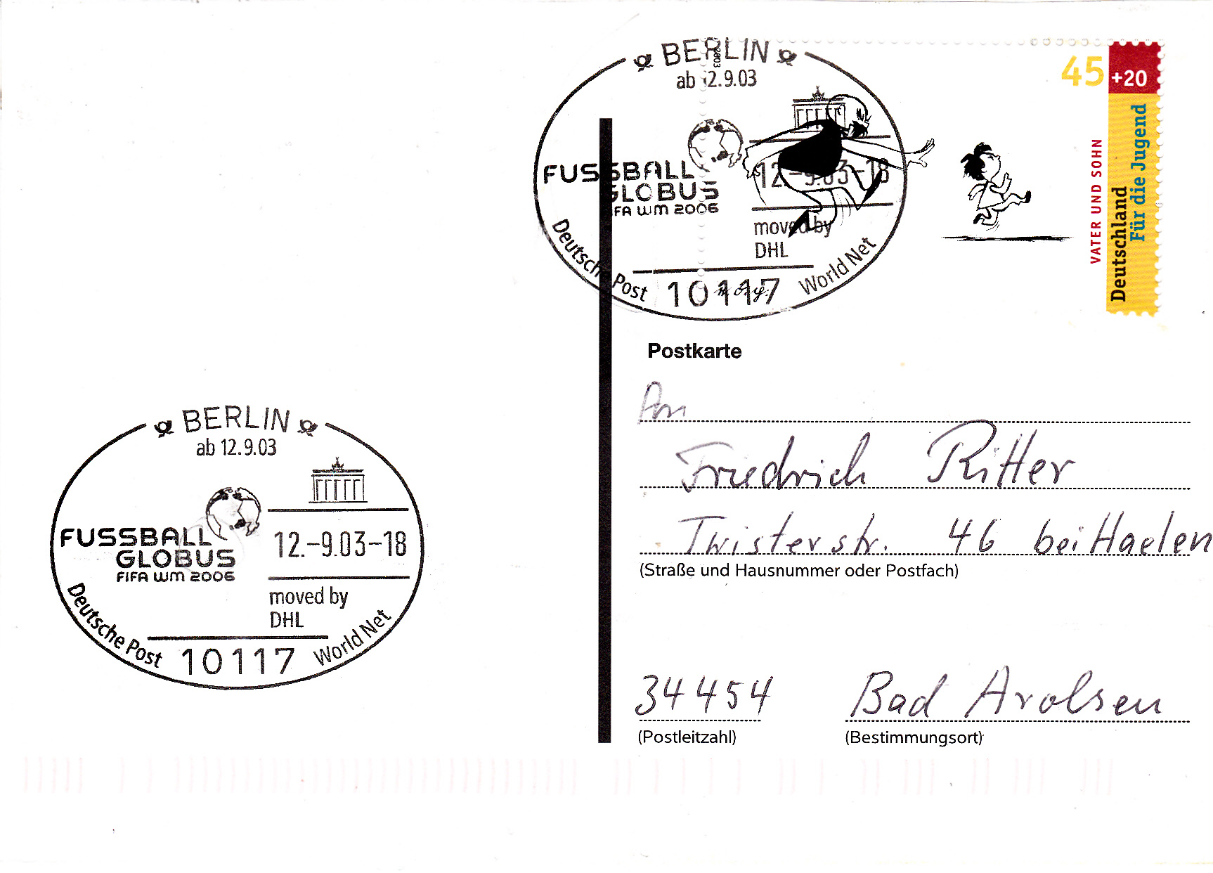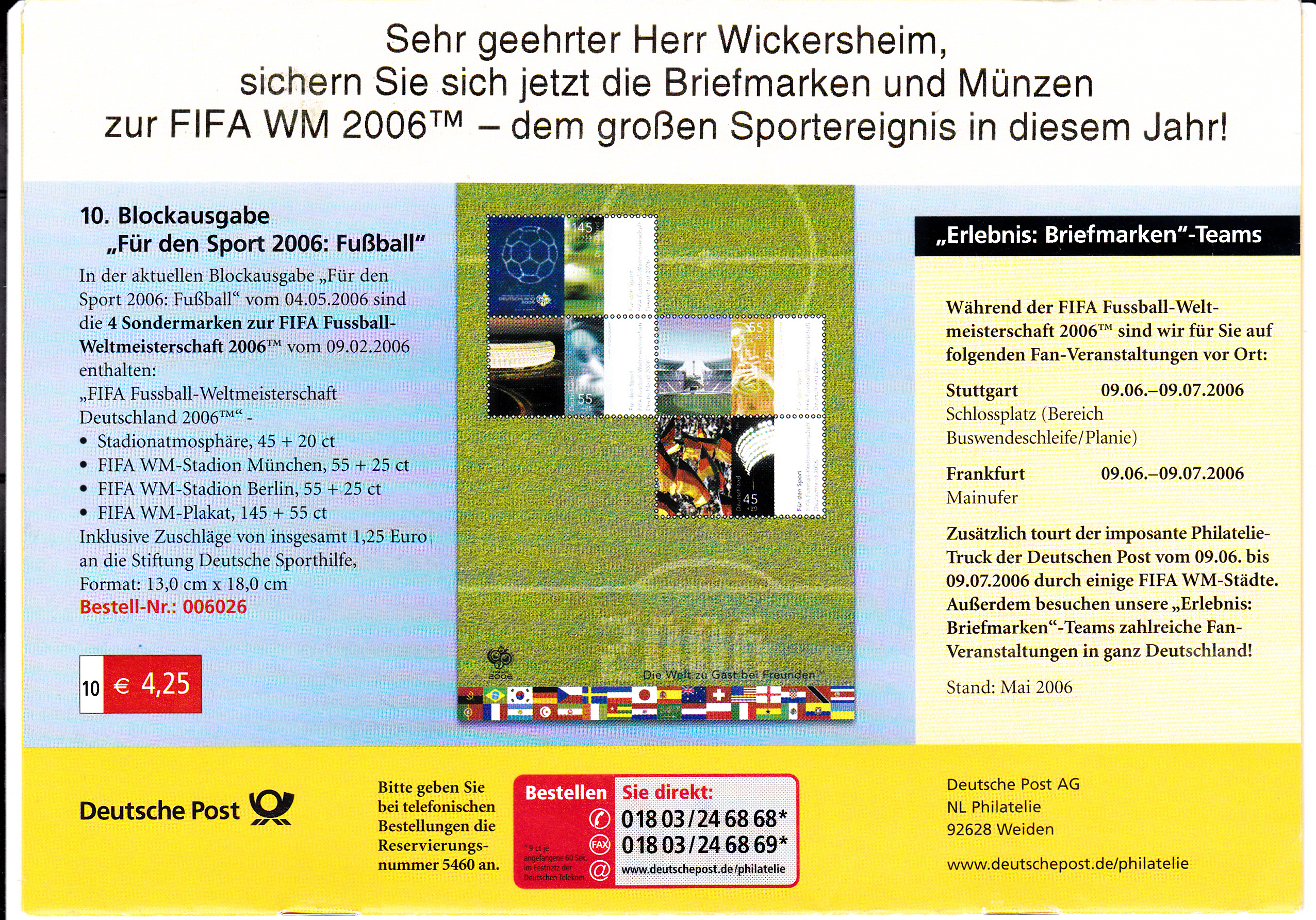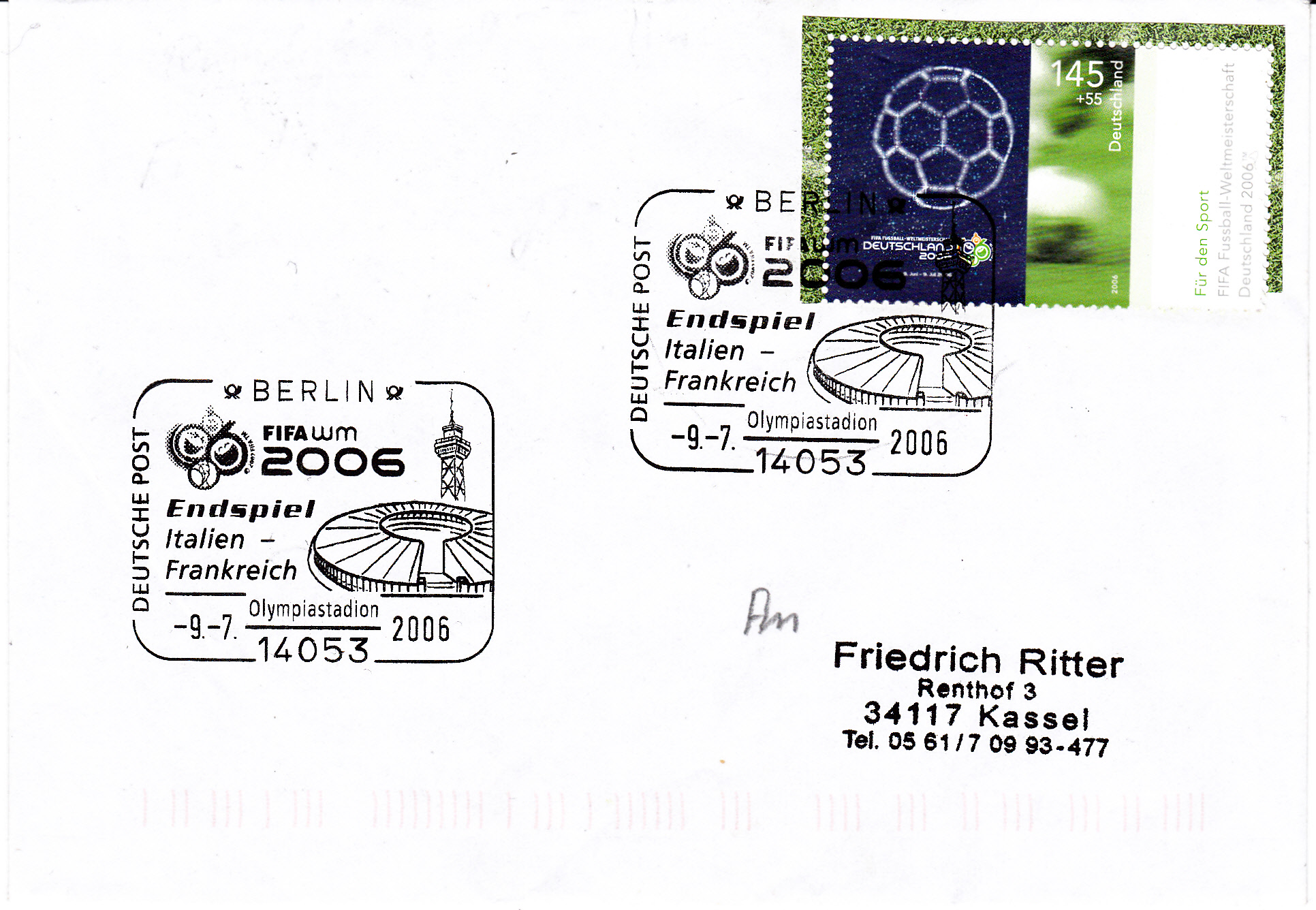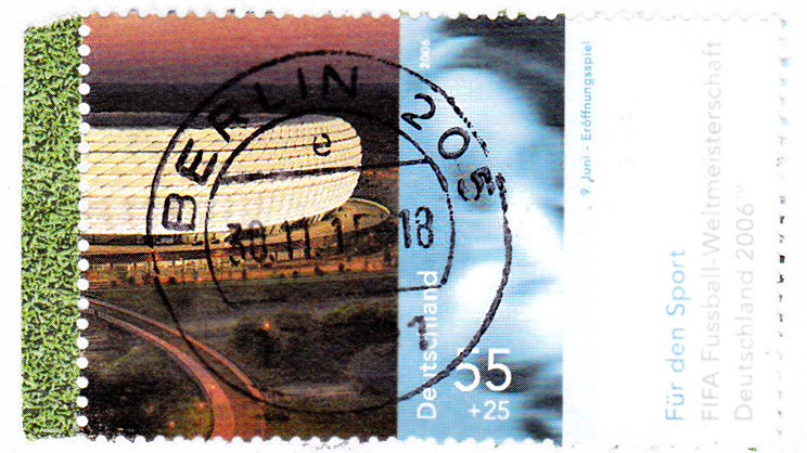 Diese Marke (MiNr 2518)aus der Sportzuschlagsmarkenserie 2006 erschien zu der Fußballweltmeisterschaft 2006. Im Bild wird die Allianzarena in München gezeigt.