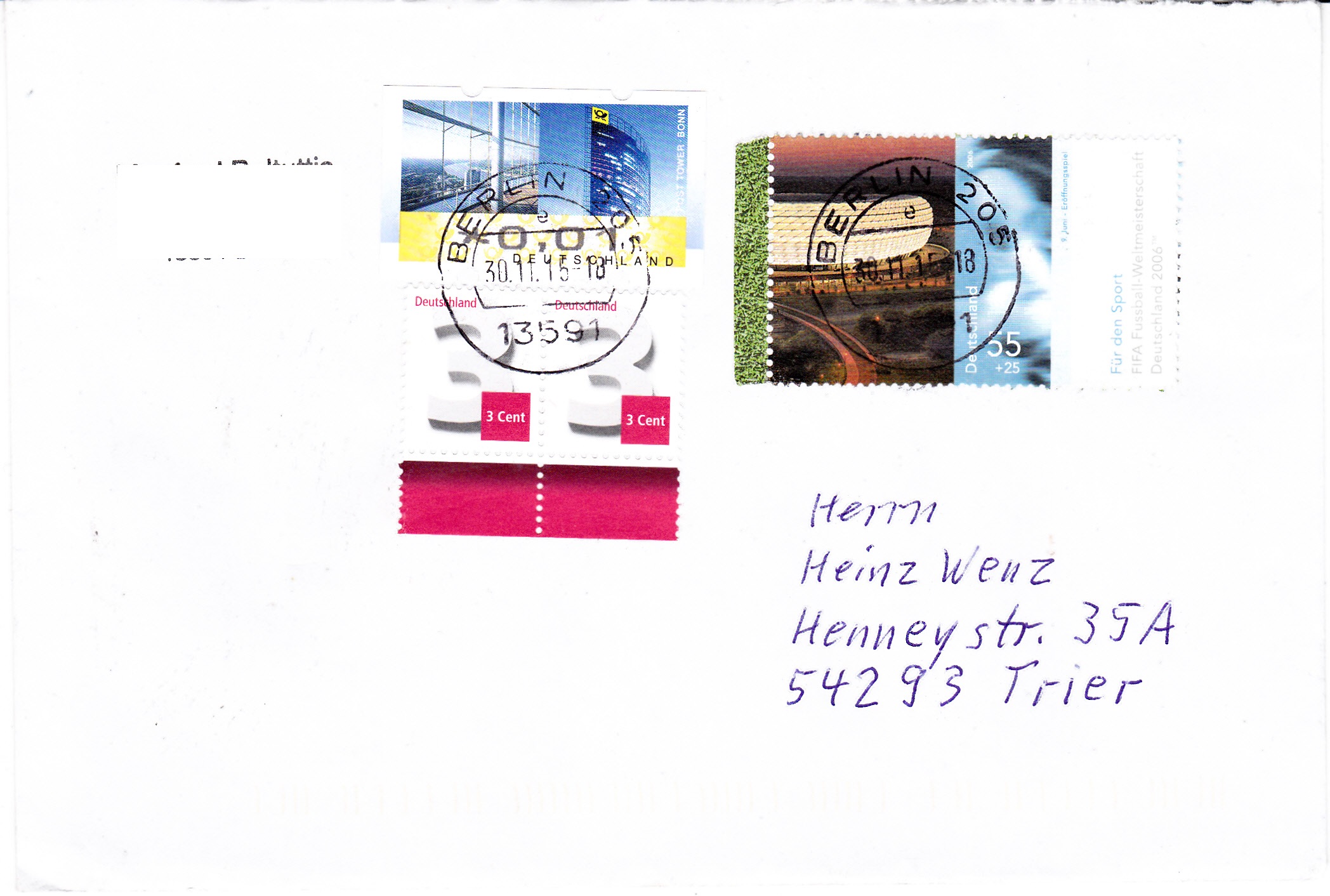 Die Marke, die auf diesem Brief verwendet wurde stammt aus Block 67, wie die Farbtupfer auf der rechten Seite (obere Zähne hellblau) zeigen, sie stammen nämlich von der Marke MiNr 2519, die sich im Block rechts neben der Marke MiNr 2518 befindet.