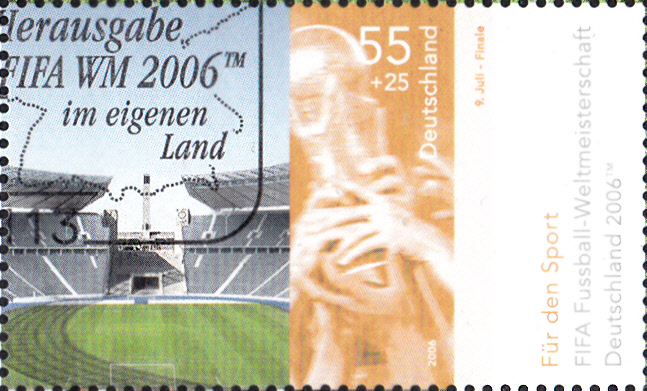 Eine zweite Marke zu 55+25 Cent (MiNr 2519) stellt das Olympiastadion in Berlin und den FIFA-Pokal vor. Im Text wird auf das Endspiel am 9. Juli 2006 hingewiesen.