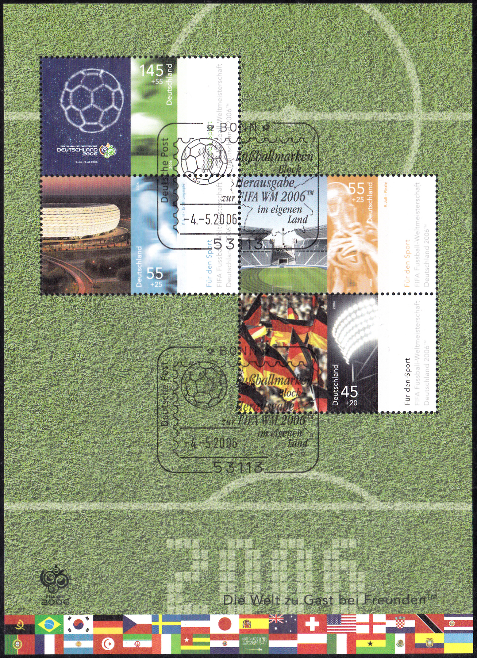 Diese vier Marken zur WM 2006 sind auch in einem Block (MiNr Block 67) erschienen. Auf dem Blockrand werden noch ein Teil eines Spielfeldes und die Flaggen der Teilnehmerländer gezeigt.