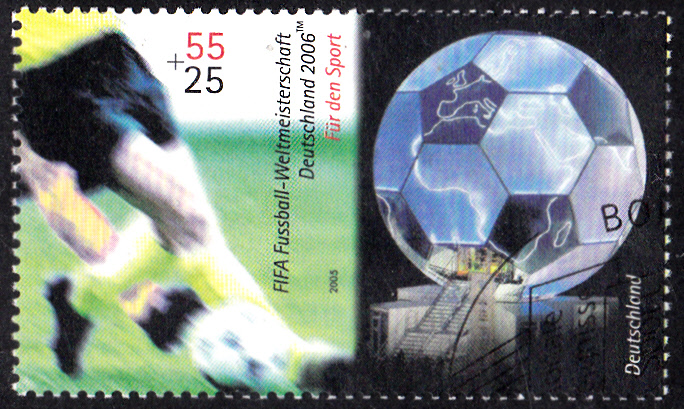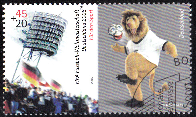 2005 sind zur Ankündigung der Fußball-Weltmeisterschaft 2006 in Deutschland bereits zwei Marken in der Serie für die Sporthilfe erschienen. Hier die Marke zu 45+20 Cent mit dem Motiv Stadionbesucher, Flutlichtanlage und WM-Maskottchen "Goleo VI".