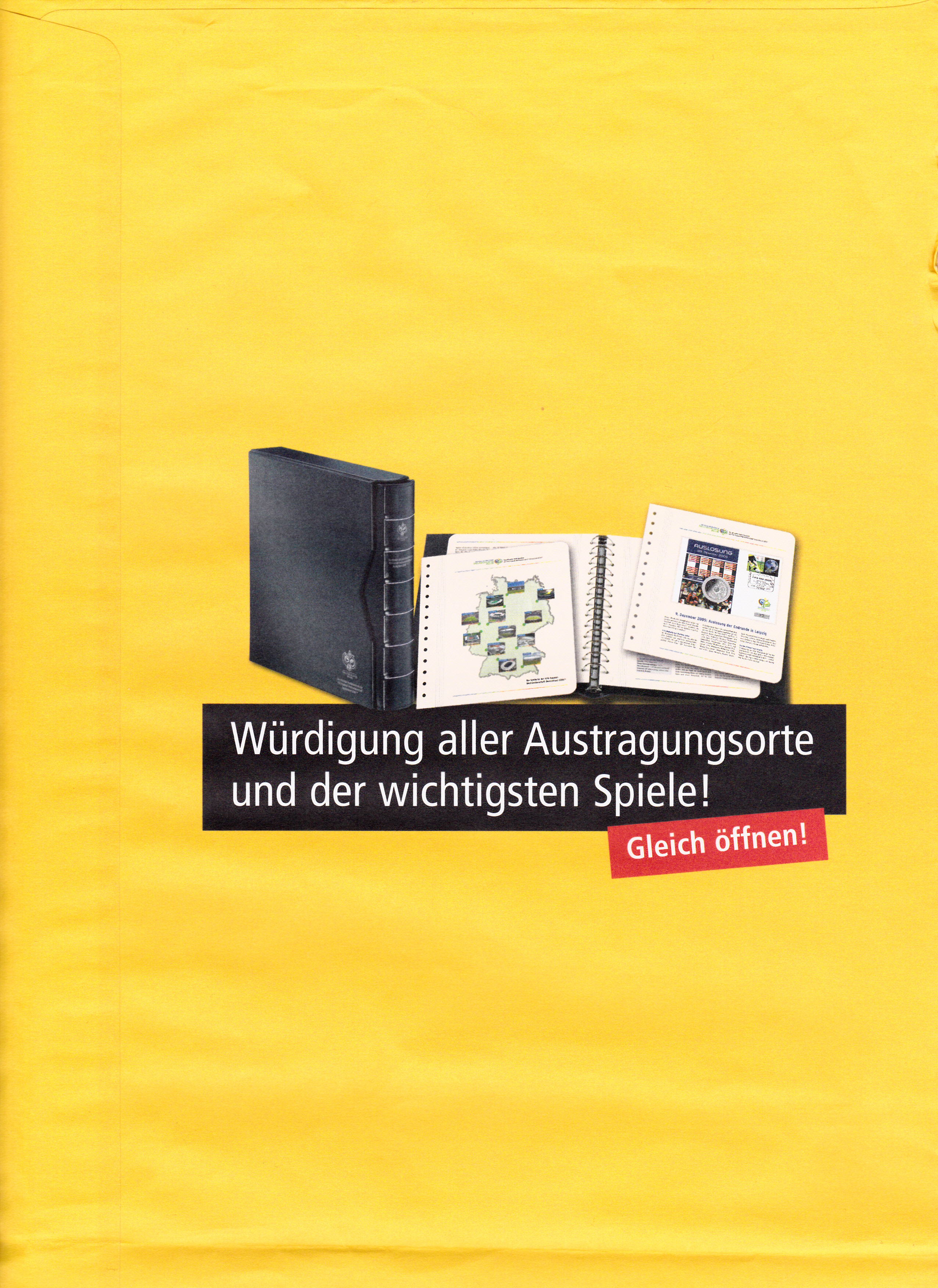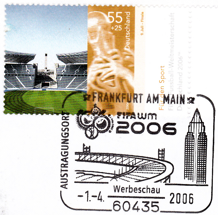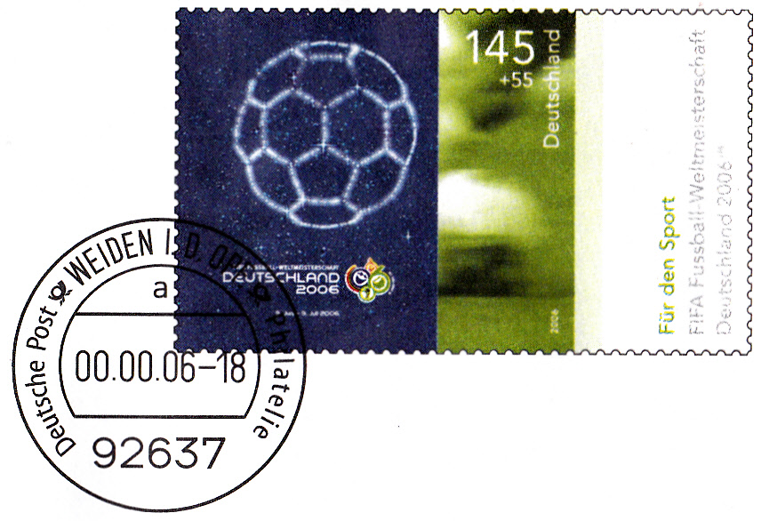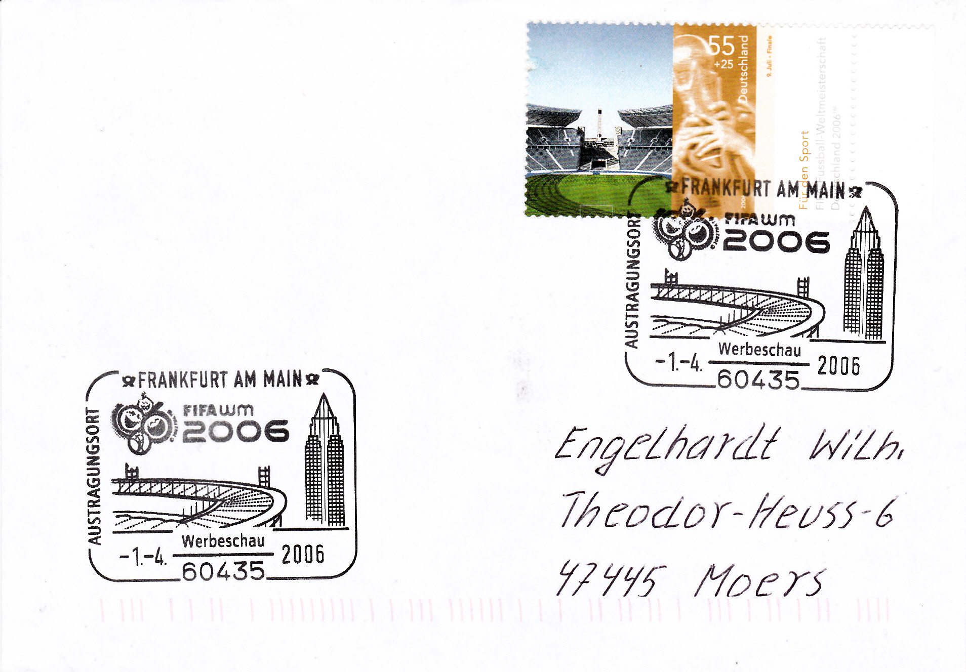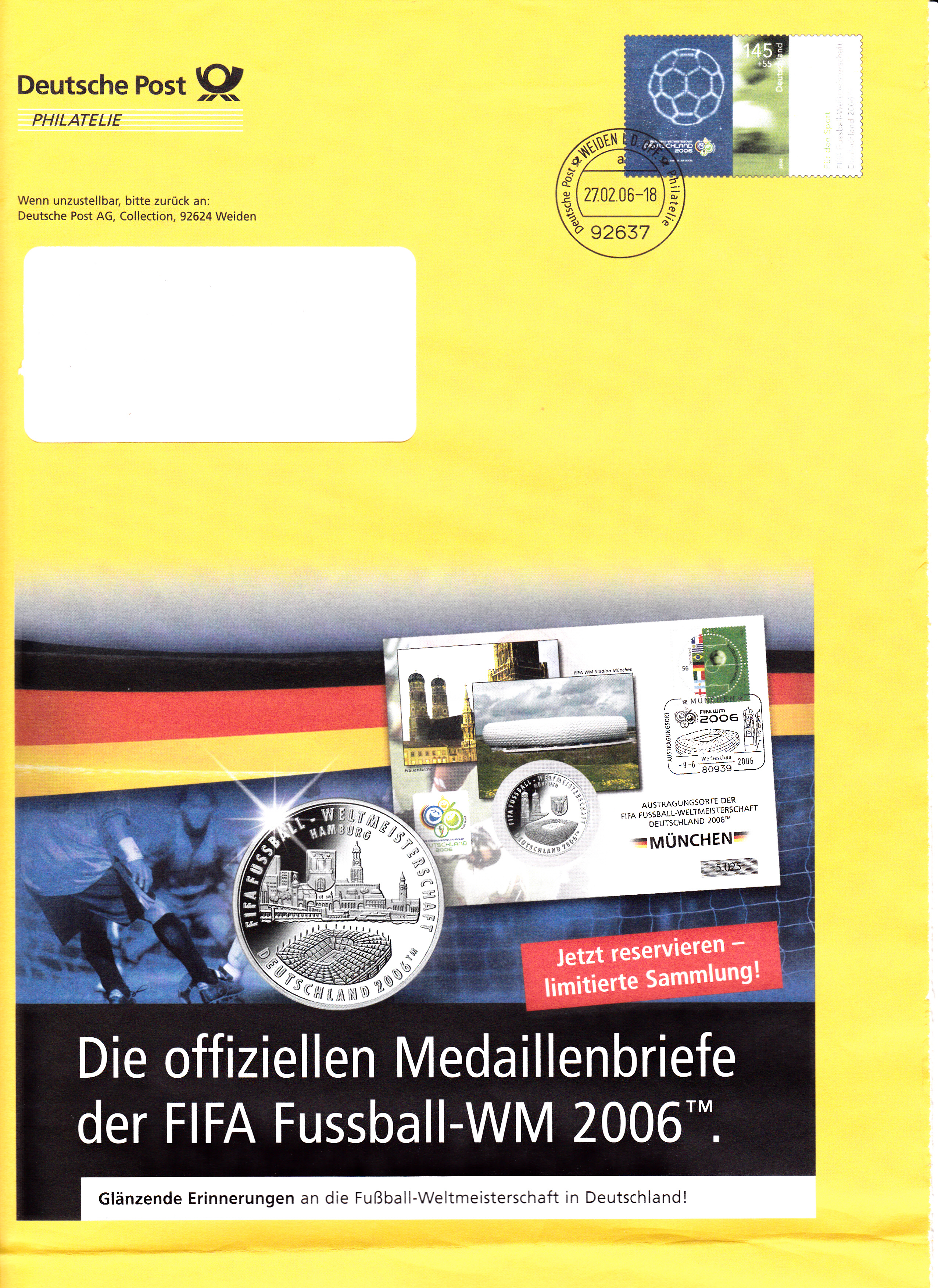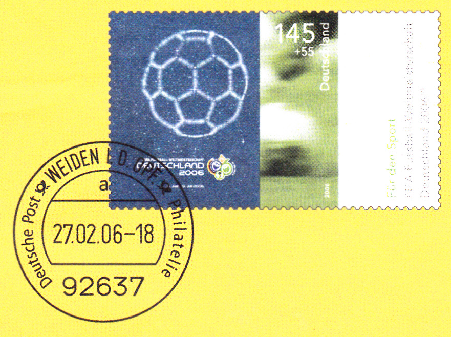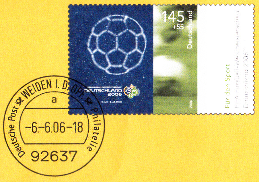 Die Marke zu 145+55 Cent der Sporthilfemarken 2006 (MiNr 2521) wurde auch als Wertstempel auf diesem Umschlag bei den Eigenausgaben der Deutschen Post AG mit Postlogo "Deutsche Post / PHILATELIE" benutzt (MiNr EA F143). Diese Ausgabe passt somit auch in eine Sammlung zur Fußball-WM 2006.